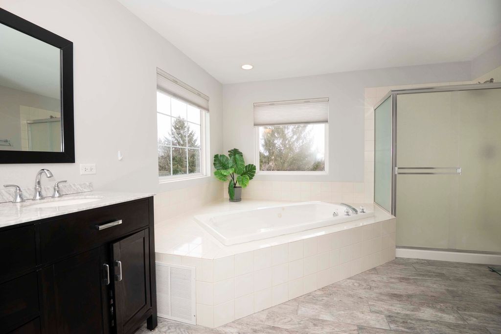 A striking two-story foyer and living room create an unforgettable first impression, highlighted by a sweeping staircase that defines the home's architectural elegance. Throughout the entire first floor, authentic red oak hardwood floors, finished in a rich walnut tone, are beautifully complemented by upgraded 5-inch baseboards-a refined detail rarely found outside of far more expensive homes. The expansive kitchen is designed to impress, featuring 42-inch white framed cabinetry, gleaming granite countertops, and stainless steel appliances, offering both timeless style and everyday functionality. Just beyond, the inviting family room centers around a stunning stone fireplace, while double doors open to a private den-ideal for a home office or cozy retreat. The primary suite is a true sanctuary, complete with a private sitting area, double vanity, jetted tub, separate shower, and generous closet space, including a walk-in. Three additional spacious bedrooms and a well-appointed hall bath complete the upper level. Step outside and savor summer living on the 700-square-foot multi-level brick patio, New gazebo, set within a private, fenced backyard-perfect for entertaining, relaxing, or enjoying quiet evenings at home. This residence offers a rare blend of sophistication, comfort, and exceptional value.