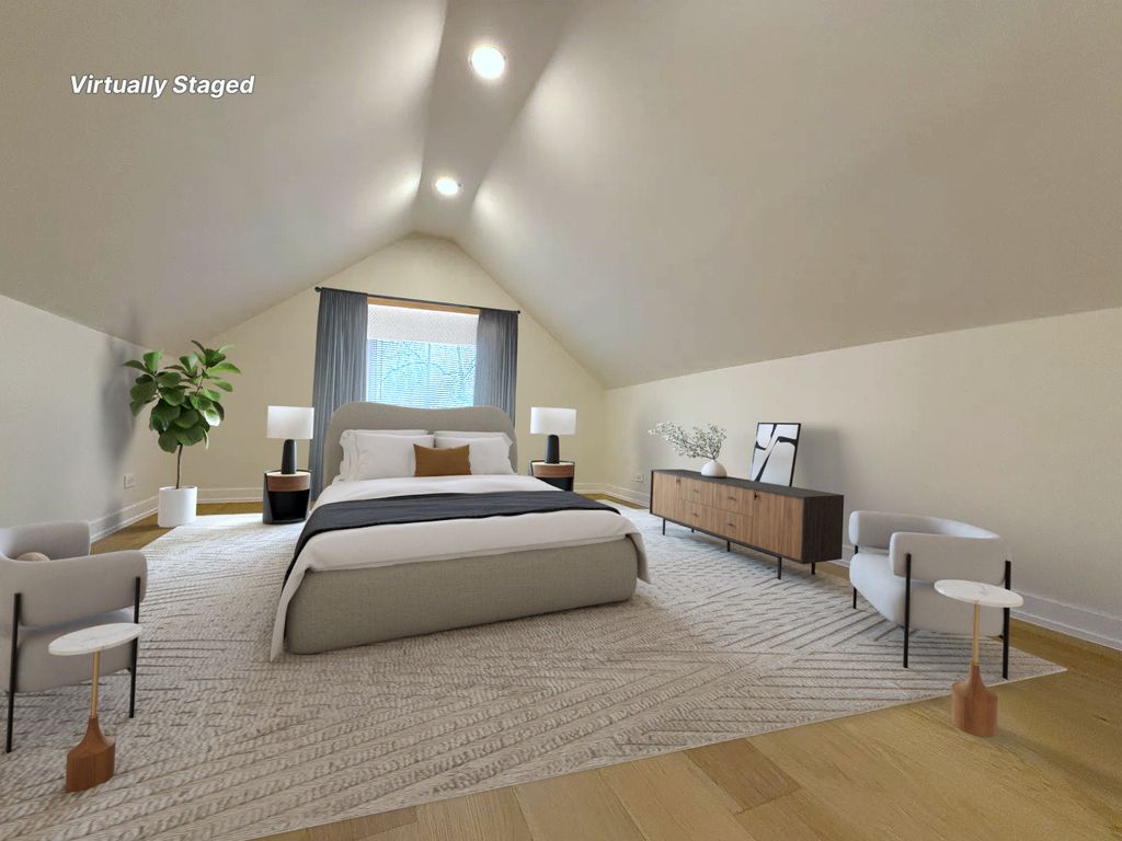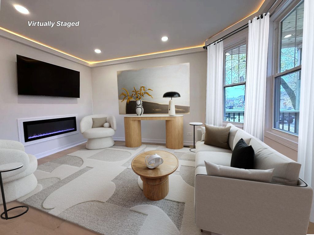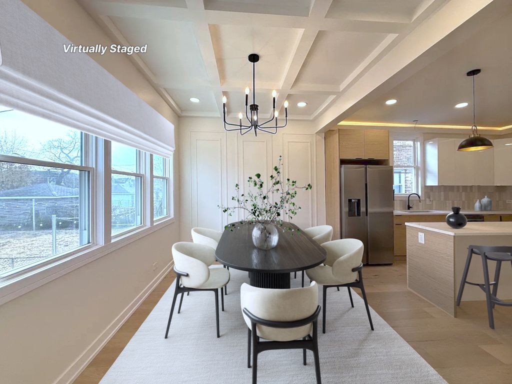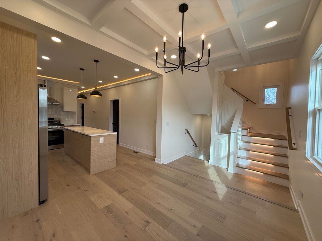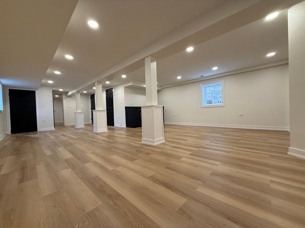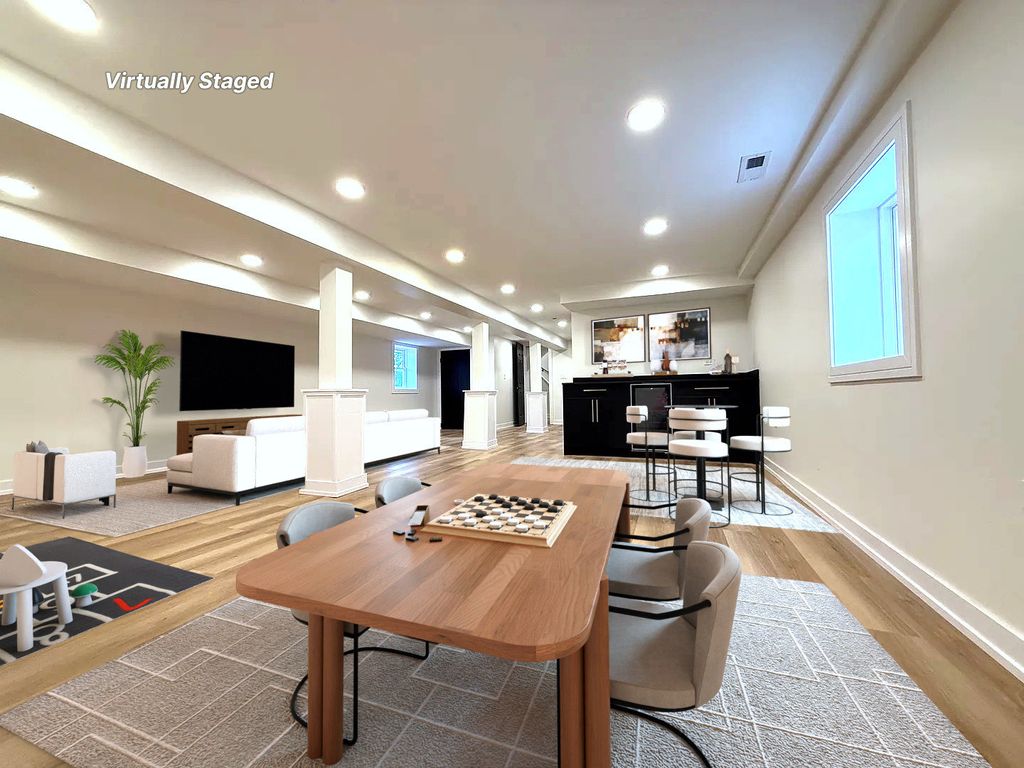 Stunning, fully permitted full-gut rehab-absolutely everything brand new! This beautifully redesigned 5-bedroom, 3-bathroom home sits on a large fenced-in lot right next to the park and features a warm, inviting wooden front porch. With three levels of fully finished living space, this home offers luxury, comfort, and modern functionality throughout. Step into a bright and spacious living room highlighted by a wall-mounted 65" TV, sleek electric fireplace, recessed lighting, and hardwired LED perimeter lighting for an elevated contemporary feel. The heart of the home is the magnificent chef's kitchen, showcasing custom soft-closing cabinetry, quartz countertops, a beautiful kitchen island, and premium stainless steel appliances. The kitchen opens seamlessly to the dining area featuring designer ceilings and picturesque views of the stunning backyard. The main floor also includes two generously sized bedrooms and a beautifully designed full bath. A gorgeous staircase leads to the second level, where you'll find three large bedrooms and an additional full bathroom with a stand-up shower. The full finished walk-out basement is perfect for entertaining-complete with a stylish dry bar, beverage cooler, and a full bathroom with a large shower. A separate laundry room with washer and dryer adds convenience. Outside, enjoy a brand-new concrete patio, ideal for outdoor gatherings, along with a newly rebuilt 2.5-car garage featuring a new concrete slab. Everything is NEW-tear-off roof on the house and garage, all windows, insulation, drywall, flooring, interior and exterior doors, HVAC system with new ductwork, full electrical system and wiring, and all new plumbing including a copper water main line from the street. Renovation completed with plans and all required permits for peace of mind. Don't wait-make this truly stunning home yours today!