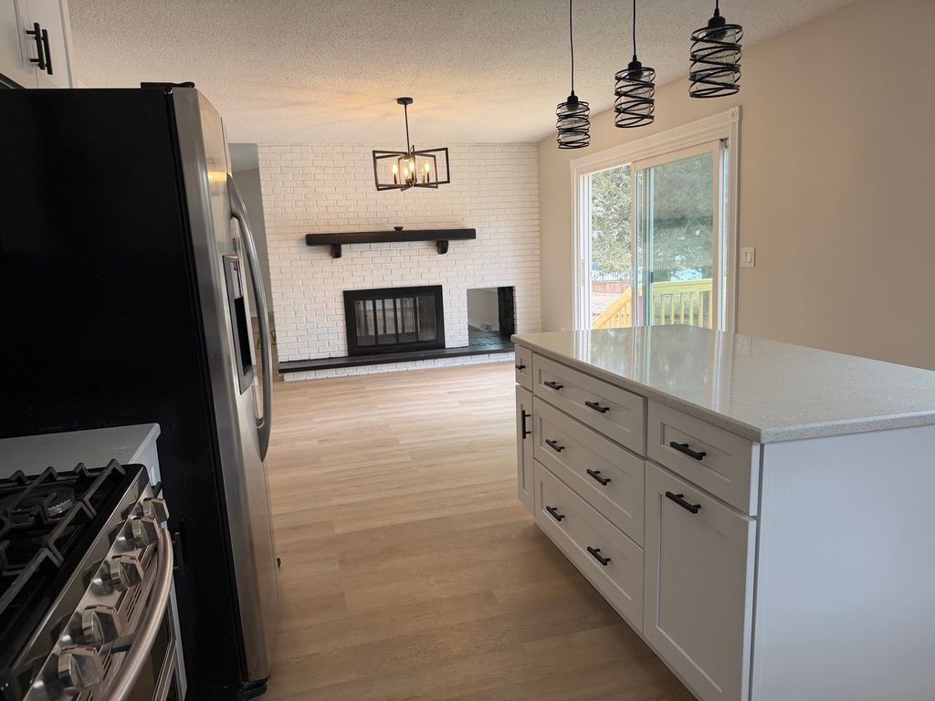 Step into this fully updated home featuring river views and brand-new elements throughout. Updated hardware, fixtures, and trim throughout, with fresh paint in every room. The open-concept layout seamlessly connects the kitchen, dining, and living areas, anchored by a dual see-through fireplace, creating an ideal space for entertaining and gathering. The kitchen showcases soft-close shaker cabinets, a striking modern backsplash, quartz countertops, stainless steel appliances, and a spacious island. Bathrooms are updated with new vanities, toilets, and designer fixtures. The home also features updated electrical, new ceiling fans, and pendant lighting. Throughout the home, you'll find new LVP flooring, three fireplaces, and brand-new windows. The spacious walk-out basement includes an additional bedroom and wet bar, providing excellent space for entertaining, recreation, or guest accommodations. Outside, enjoy a partially fenced yard perfect for pets, two sheds for additional storage, and a 10-by-25 deck ideal for outdoor relaxation. This home is truly move-in ready.