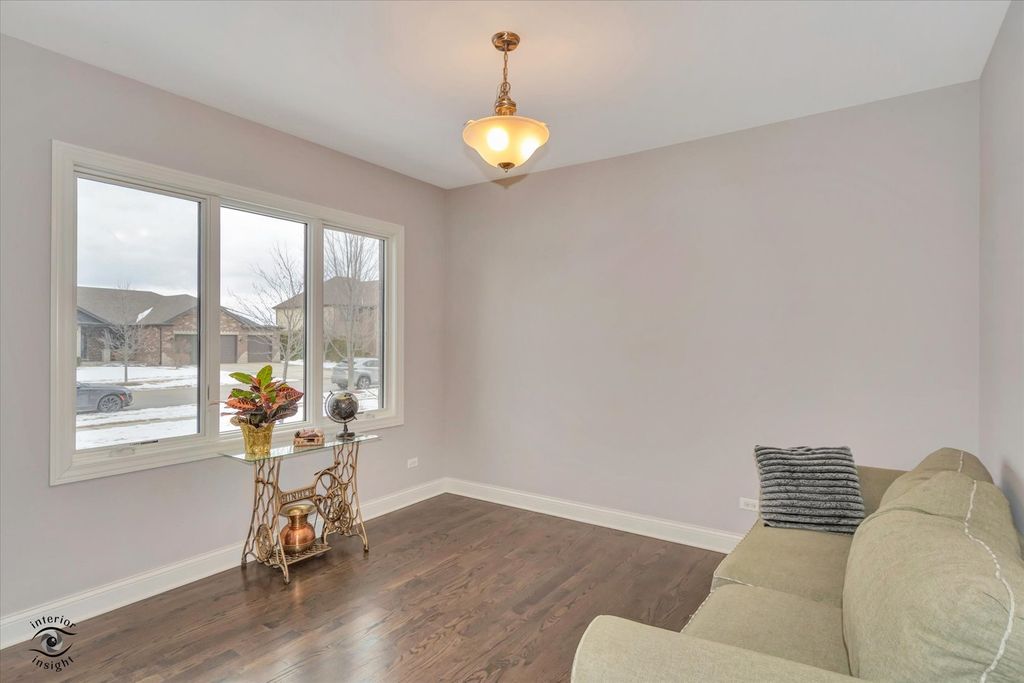 Now available in the highly sought-after Water Chase Estates of New Lenox, this gorgeous custom Camelot-built home (2018) is loaded with premium upgrades and thoughtful design throughout. The striking exterior showcases stone and upgraded siding, enhanced by upgraded garage doors and a spacious 3-car garage. Step into the large, fully fenced backyard featuring a covered patio, perfect for relaxing or entertaining. Inside, the home impresses with hardwood flooring and an open, entertainer-friendly main level. The chef's kitchen offers abundant 42" cabinets with crown molding, granite countertops, a subway tile backsplash, large center island, generous dining area, and a walk-in pantry. Additional main-level highlights include a private office, convenient mudroom off the garage, and excellent natural light throughout. Upstairs, enjoy the convenience of second-floor laundry near the bedrooms. The spacious loft-originally an optional fourth bedroom-can easily be converted if desired. The primary suite is a true retreat, featuring a tray ceiling, huge walk-in closet, and a luxurious ensuite bath with dual sinks, built-in vanity, and a large, tiled shower with bench seat and glass doors. The full basement offers incredible potential with 10-foot ceilings, thick foam insulation for exceptional temperature control, a Honeywell Zone control panel, and rough-in plumbing for a future bathroom. Ideally located in the award-winning Lincoln-Way Central School District, this home is close to shopping, dining, and easy access to I-80-combining luxury, comfort, and convenience in one exceptional property.