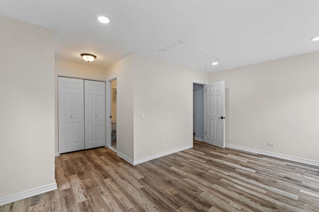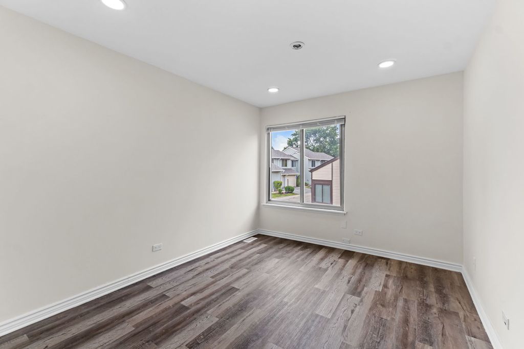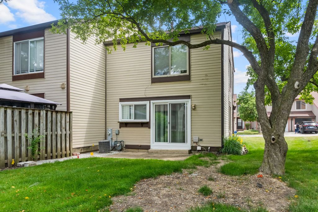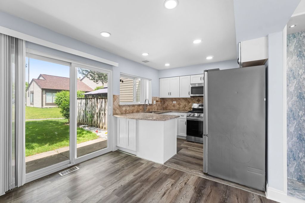 Welcome to this generously sized end unit offering over 1,800 square feet of versatile living space-including a finished basement with a bar area perfect for entertaining. The main level features a sunlit family room with soaring vaulted ceilings, and a convenient powder room. The updated eat-in kitchen boasts granite countertops, stainless steel appliances, and a stylish tile backsplash. Upstairs, the expansive primary bedroom includes dual closets and private en suite access to the full bath, complemented by two additional well-proportioned bedrooms. The lower level also houses a full laundry room with utility sink for added convenience. Enjoy outdoor living on your private patio and the perks of an attached one-car garage. Located in a clubhouse community with a pool and access to top-rated Roy De Shane, Stratford, and Glenbard North Schools. Just minutes to Army Trail retail, dining, and Stratford Mall.