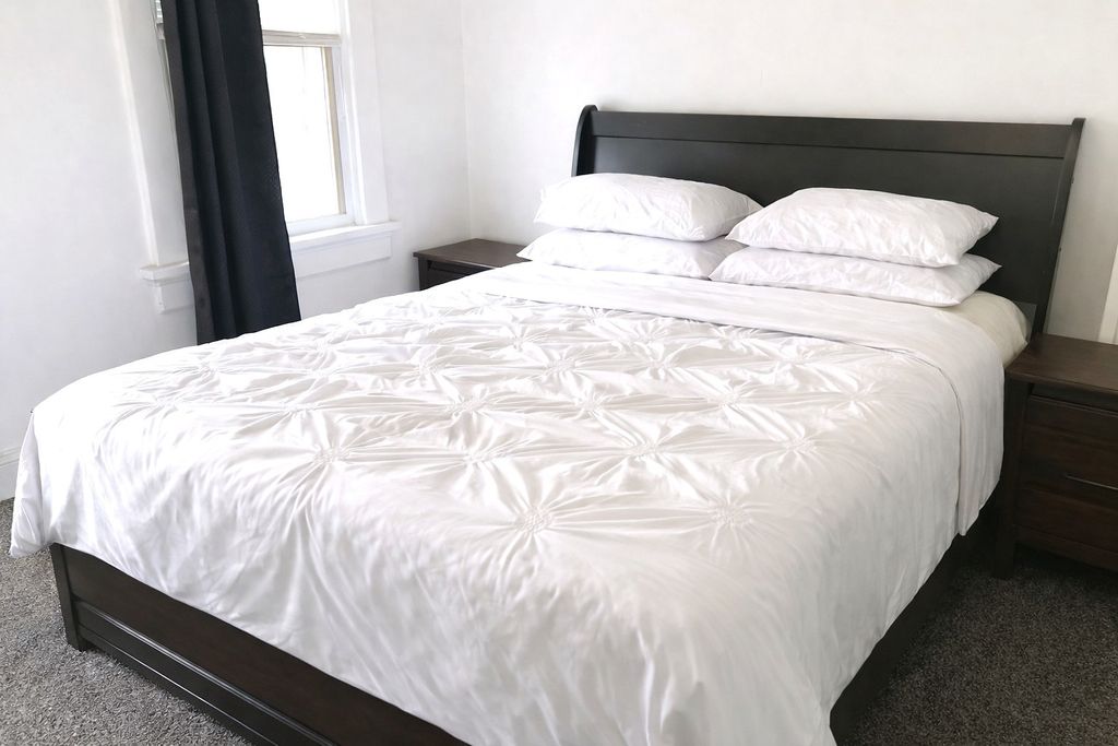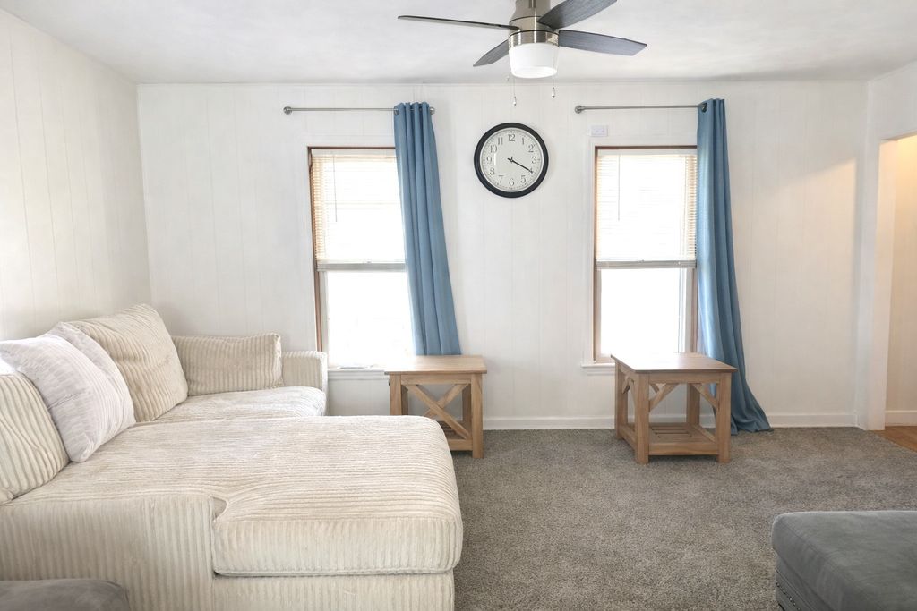 This 2 bedroom, 1.5 bath home may be just what you are looking for with an open main floor! Upper level offers 2 bedrooms and a bath. Freshly painted. New flooring throughout. Completely updated upper level bath with walk-in shower. New furnace and central air coil (2025). Full basement is partially finished with utility shower and toilet. Nice front porch. Shared 2 car (shared) garage and shared driveway. New back porch roof