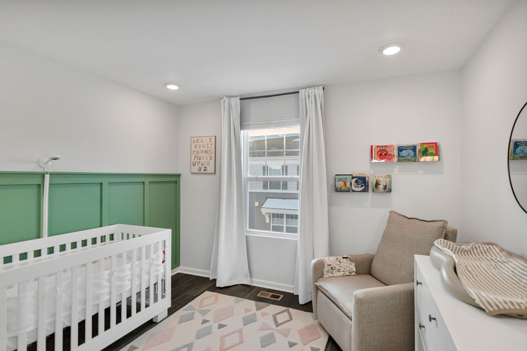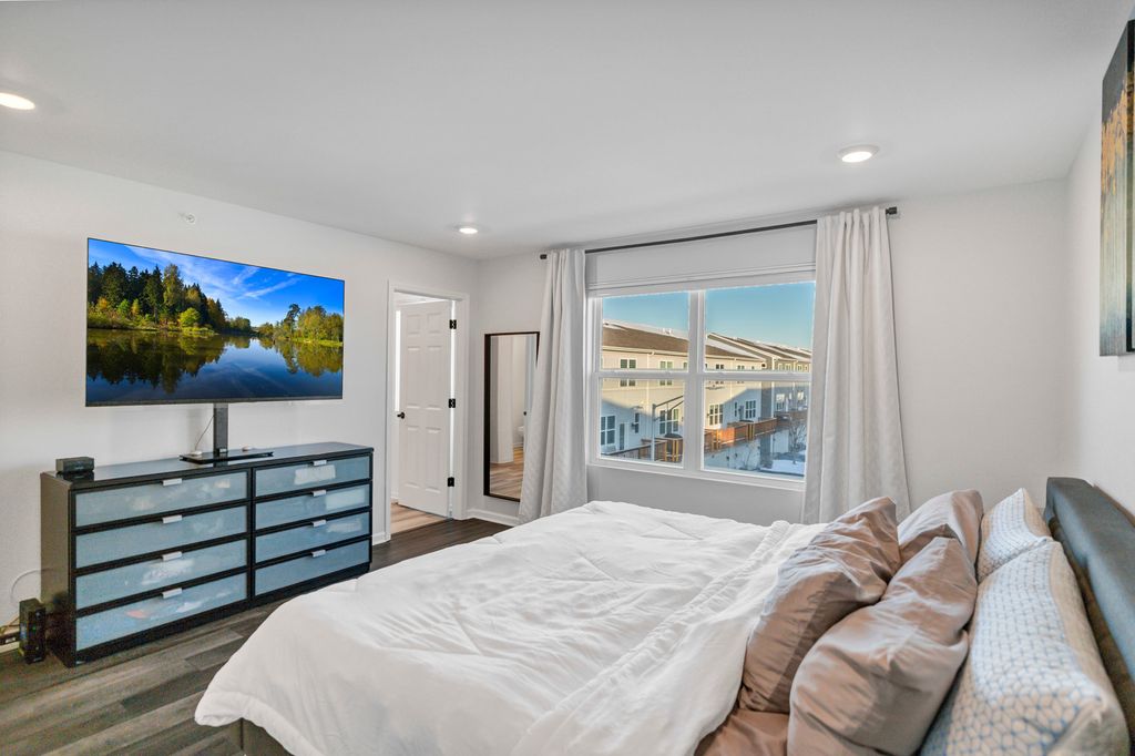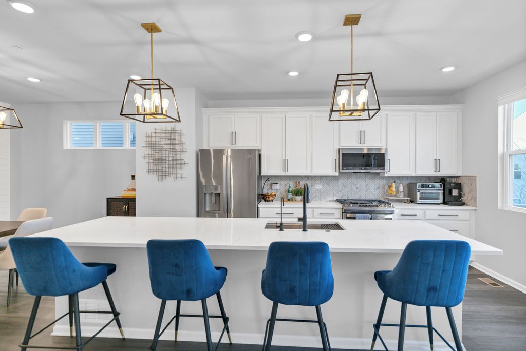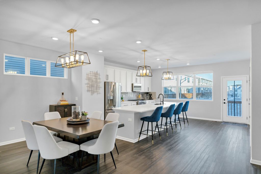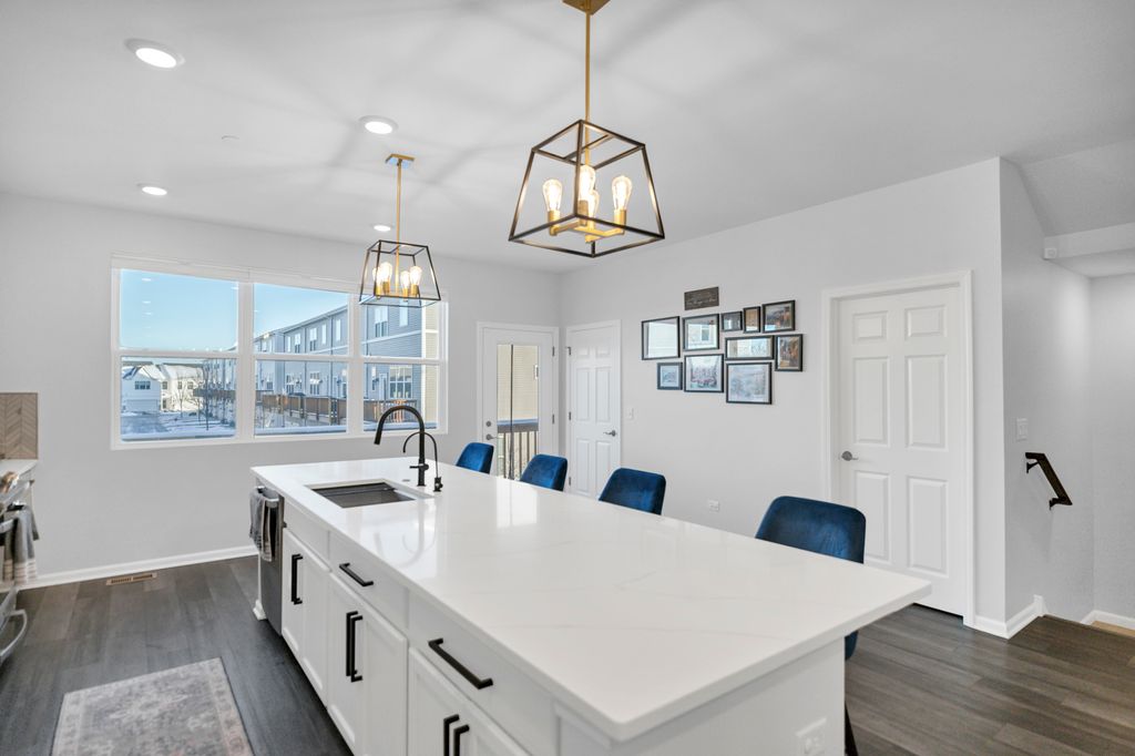 Located in the Meadow Square subdivision, this three-level townhouse delivers a smart, flexible layout paired with extensive custom upgrades throughout. The entry level features a large foyer with ample storage and a sunlit recreation space with French doors, offering versatility for a home office, workout area, or additional living space. The attached garage includes a dedicated 30-amp electrical circuit suitable for EV charging. The main living floor is designed for seamless everyday living and entertaining, with an open family room centered around a custom-built entertainment center and electric fireplace. The kitchen anchors the space with quartz countertops, full-height 42" white cabinetry with crown moulding, stainless steel appliances, a breakfast bar, an oversized island with sink, and a generously sized pantry. Luxury vinyl plank flooring and recessed lighting continue throughout all three levels. A private balcony located just off the kitchen and positioned above the two-car garage provides an ideal outdoor retreat for relaxing and entertaining. The upper level includes three well-proportioned bedrooms. The primary suite features a private bathroom with dual sinks, quartz counters, a separate shower, and a walk-in closet outfitted with custom shelving. Additional custom storage includes new closets under the first floor stairs and adjacent to the primary shower - features not found in comparable units. Two additional bedrooms with custom closet systems share a full hallway bathroom, along with a linen closet and an upgraded laundry area with built-in shelving. As an end unit, the home offers added privacy and abundant natural light throughout. The location provides convenient access to nearby shopping, parks, libraries, and schools, with close proximity to Woodfield Mall, downtown Arlington Heights, Metra stations, and major expressways including I-53, I-90, and I-290.