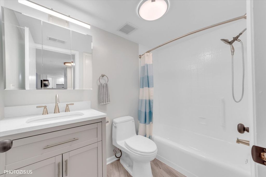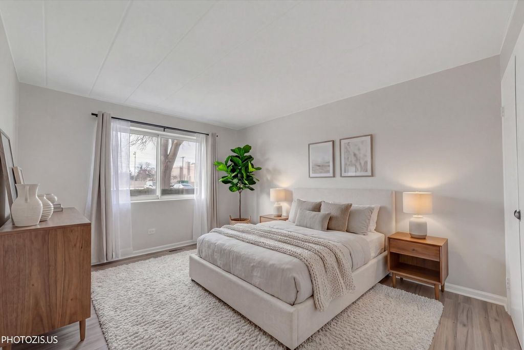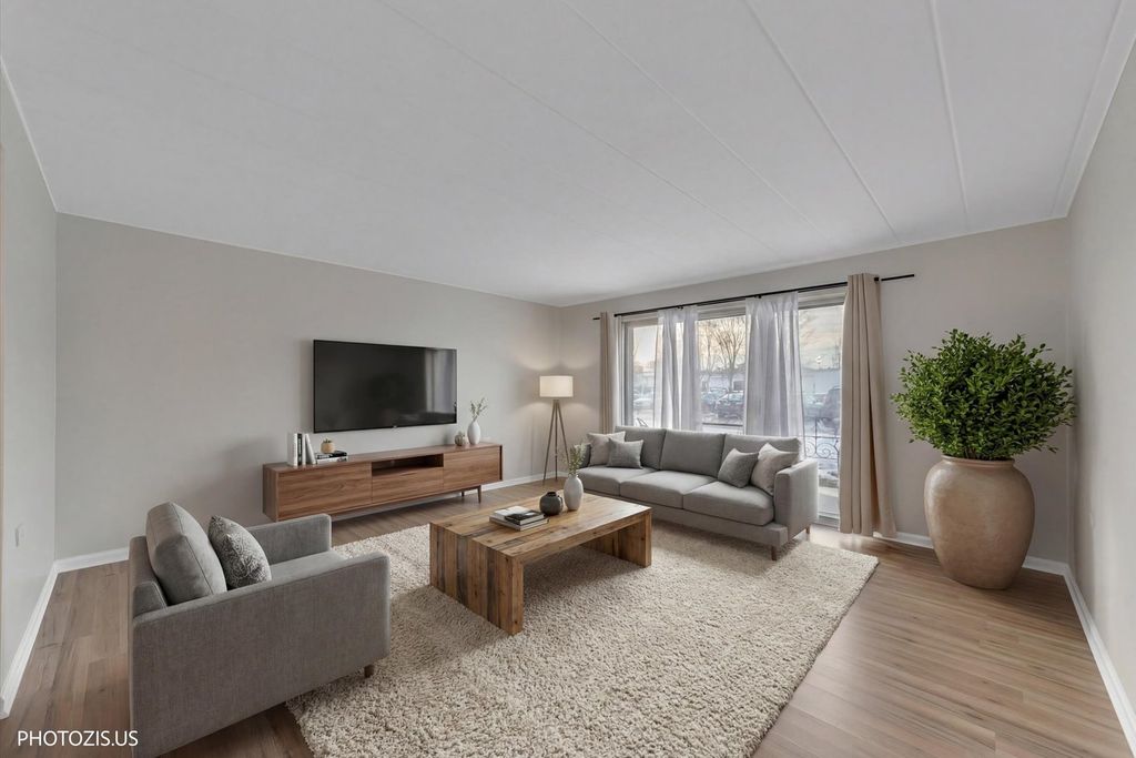 Move-in ready and beautifully maintained first-floor unit located in a quiet, well-kept elevator building. This updated and upgraded home shows true pride of ownership with attention to detail throughout and offers the convenience of low HOA dues. The spacious kitchen features white cabinetry, upgraded stainless steel appliances, and opens seamlessly to the living space. Laminate flooring runs throughout, creating a clean and cohesive look. A large sliding door in the living room leads to a private balcony, perfect for relaxing or enjoying fresh air. The unit also includes new A/C and water heater for added comfort and peace of mind. Storage and laundry facilities are conveniently located just down the hall. The community offers inviting amenities, including fireplaces in the common areas, comfortable gathering spaces, a small library, and a bike room. Enjoy green space and a pond area ideal for picnics, along with ample outdoor parking and a secure, keyed entry. Ideally situated near restaurants, grocery stores, Metra, and major highways for easy commuting. Owner-occupied building - rentals are not permitted.