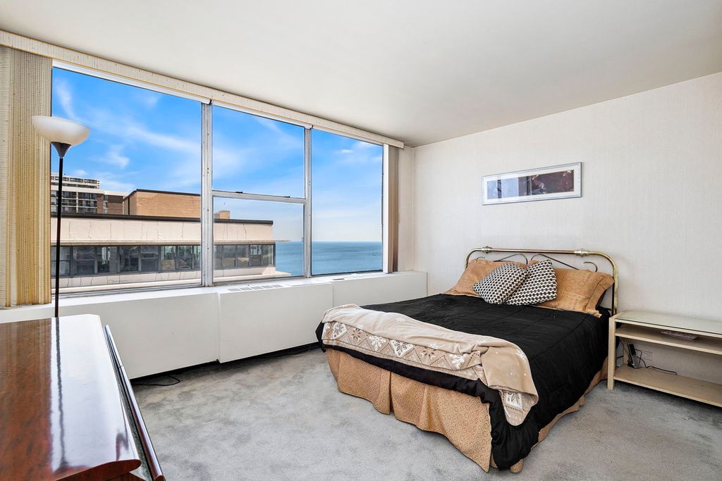 The most stunning Lake Michigan views in all of Chicago are found in this highly sought-after, northeast facing 2br/2ba corner unit. Experience breathtaking views from the generous living space with wall to wall windows overlooking Lake Michigan, Hollywood Beach and the lakefront trail. Directly off of the living space is a full dining area, ideal for entertaining, as well as access to your private balcony where you can watch the endless waves roll onto the beach. There is a galley-style kitchen with great storage and plenty of room to expand. Down the hall is the well-sized guest bedroom with a full guest bath directly across. The unit is rounded out by a massive primary suite with its own full bath and walk-in closet. Both bedrooms also feature lake views! The unit is being sold As-Is and does require extensive rehab. The building features a newly renovated party room and roof deck with jaw-dropping views looking north all the way to Evanston and south to Navy Pier. This full-service property also offers a door person, onsite manager and engineer, a gated beachfront patio/garden, laundry facilities, and a bike room. Rental parking is available within the building. Easy access to the beach, parks, and public transportation. Do not miss this opportunity!