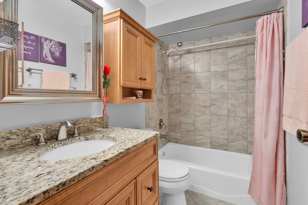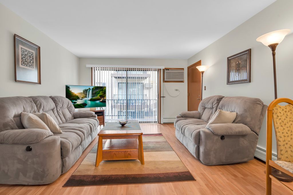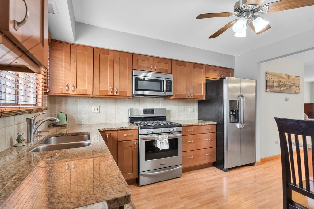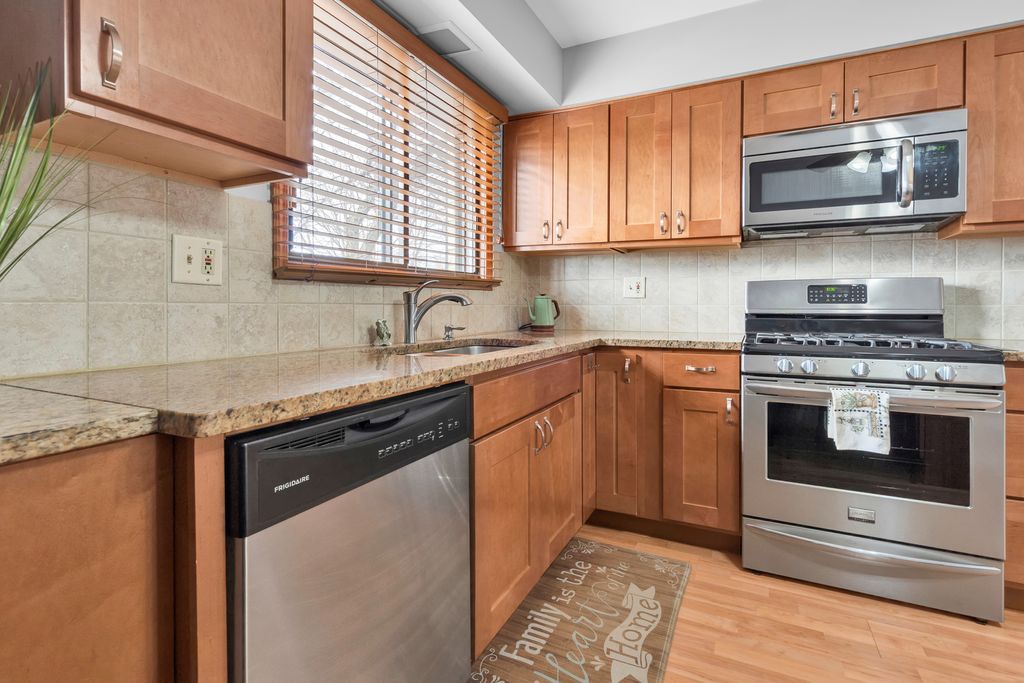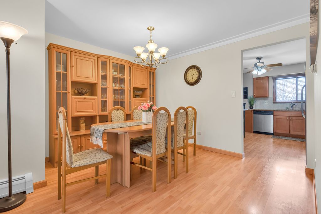 Second floor beautiful condominium in Elmwood Park with walking distance to Metra and shopping. Living/dining combo with access to balcony. Gorgeous custom- made kitchen cabinets and granite counter tops. Stainless steel appliances. Ceramic tile bathroom. Pergo floors. Lots of closet space. Roof was replaced in 2023.Coin laundry and additional storage in a basement. Heat, water and gas included in assessment. Assigned parking space at the north side of building. No rentals.Very clean and ready to move in unit.