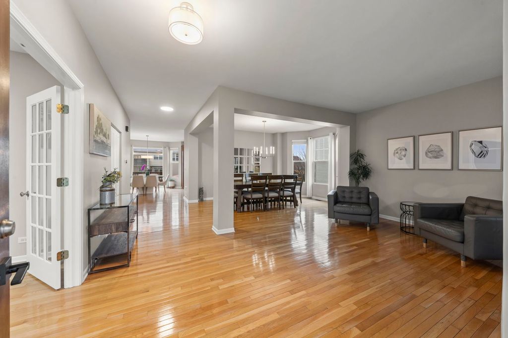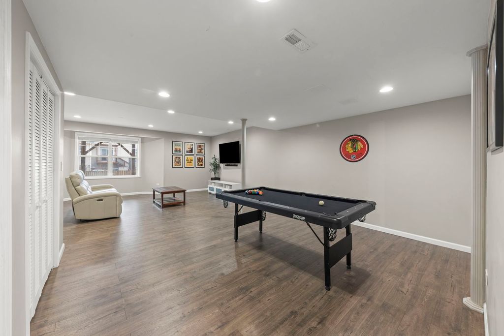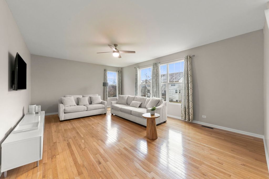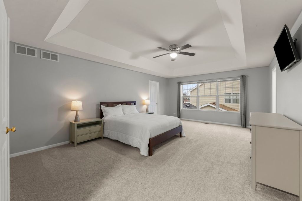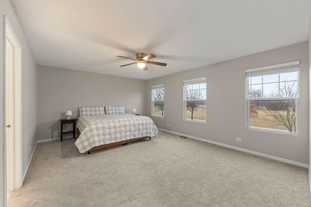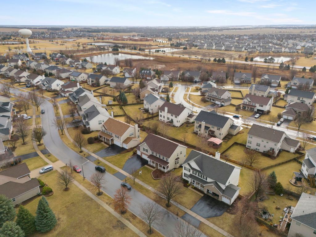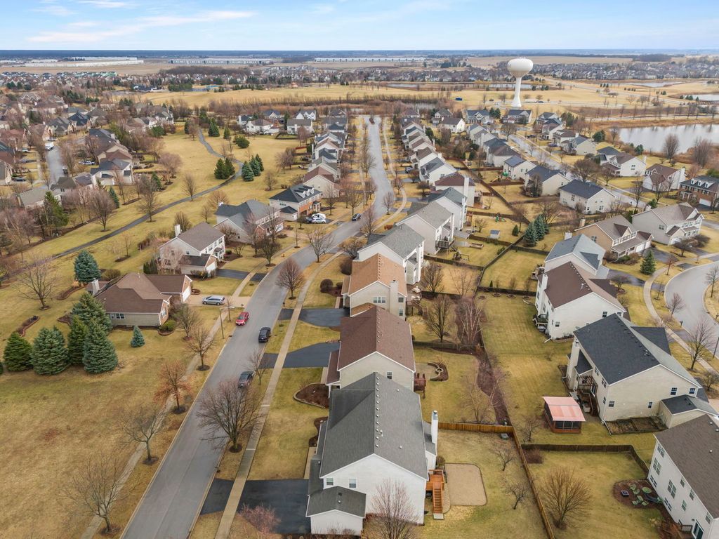 Located in the sought-after Grande Park community with a pool and clubhouse, this home sits across from a neighborhood park and offers a rare all-suite layout-every bedroom includes a private en-suite bath and a walk-in closet. The spacious eat-in kitchen features a center island, Jen-Air stainless steel appliances, double oven, Corian countertops, and abundant cabinet/counter space, plus a bright breakfast area. Engineered hardwood flooring and a dedicated office/flex room add everyday versatility. A standout feature is the fully finished walkout basement with hard-to-find 10' ceilings, a full bath, and a large finished area with private exterior access-a unique setup that functions like a separate lower-level living space and offers excellent flexibility for a rec room, media/game room, fitness area, hobby space, or a private work-from-home setup. Enjoy the fenced backyard with a brick paver patio and fire pit. Major updates include a 2019 roof and a water heater replacement (2021). Fiber-ready wiring supports modern connectivity, plus a Nest thermostat. The garage is equipped with an EV-ready 240V outlet (NEMA 14-50, 50-amp). Conveniently located near community amenities, parks, and within Plainfield School District 308
