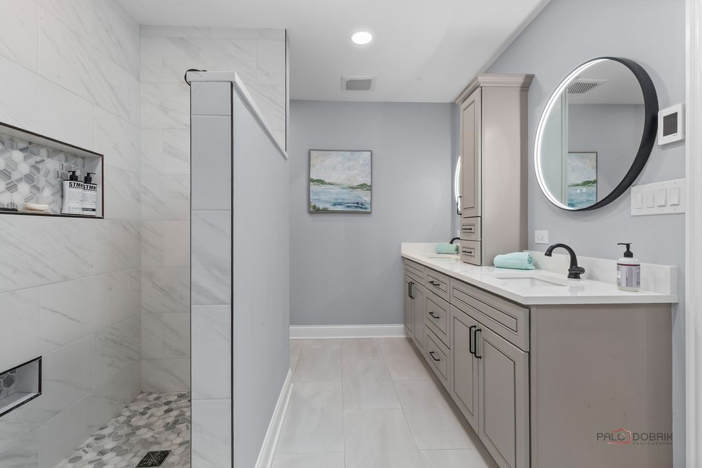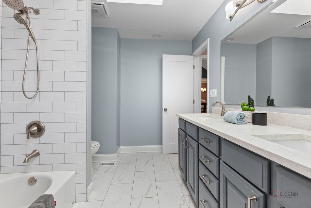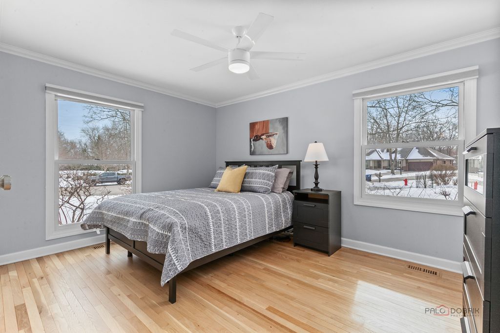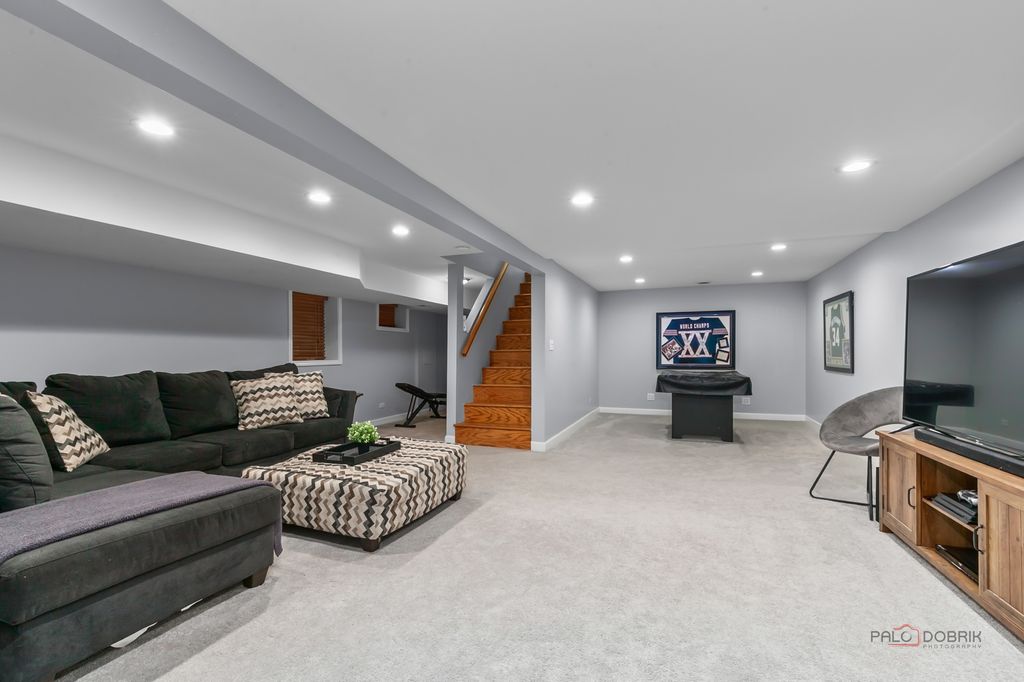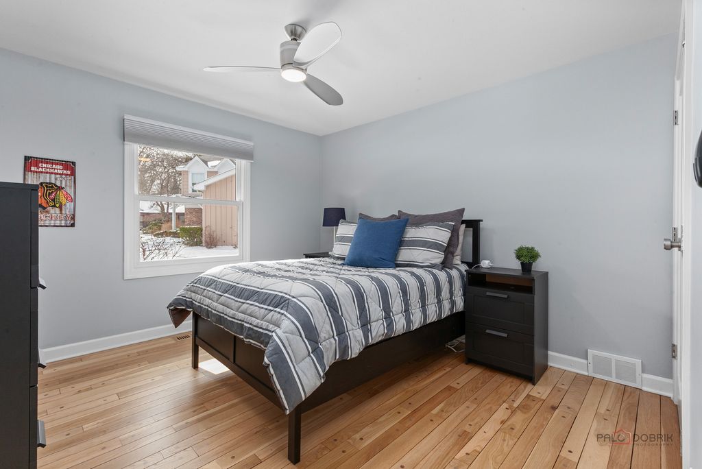 Beautiful all-brick 4-bedroom, 2-bath ranch nestled in a quiet cul-de-sac within the award-winning Stevenson High School District! Hardwood floors run through most of the home. FRESH PAINT and refinished hardwood floors on main level!!! A welcoming foyer with vaulted ceiling and skylight sets the tone. The formal dining room is ideal for gatherings, while the bright and airy living room features a large picture window. The gourmet kitchen offers a breakfast bar, granite countertops, pantry closet, abundant cabinetry, and a spacious eating area. The inviting family room showcases a cozy fireplace and exterior access to the brick paver patio-perfect for indoor/outdoor living. The primary suite boasts brand new hardwood flooring, a large walk-in closet and private ensuite with heated floors, dual-sink vanity, and separate shower. Three generously sized bedrooms, a full bath, and convenient main-level laundry complete the first floor. The finished basement offers a large recreation room with bathroom rough-in-ready for your finishing touches. Enjoy walking distance to the neighborhood park with tennis and basketball courts, plus nearby bike paths. Conveniently located near train, highways, shopping, and entertainment. This home truly has it all!
