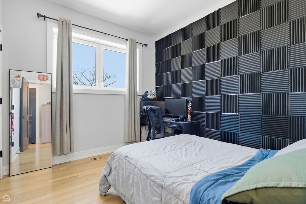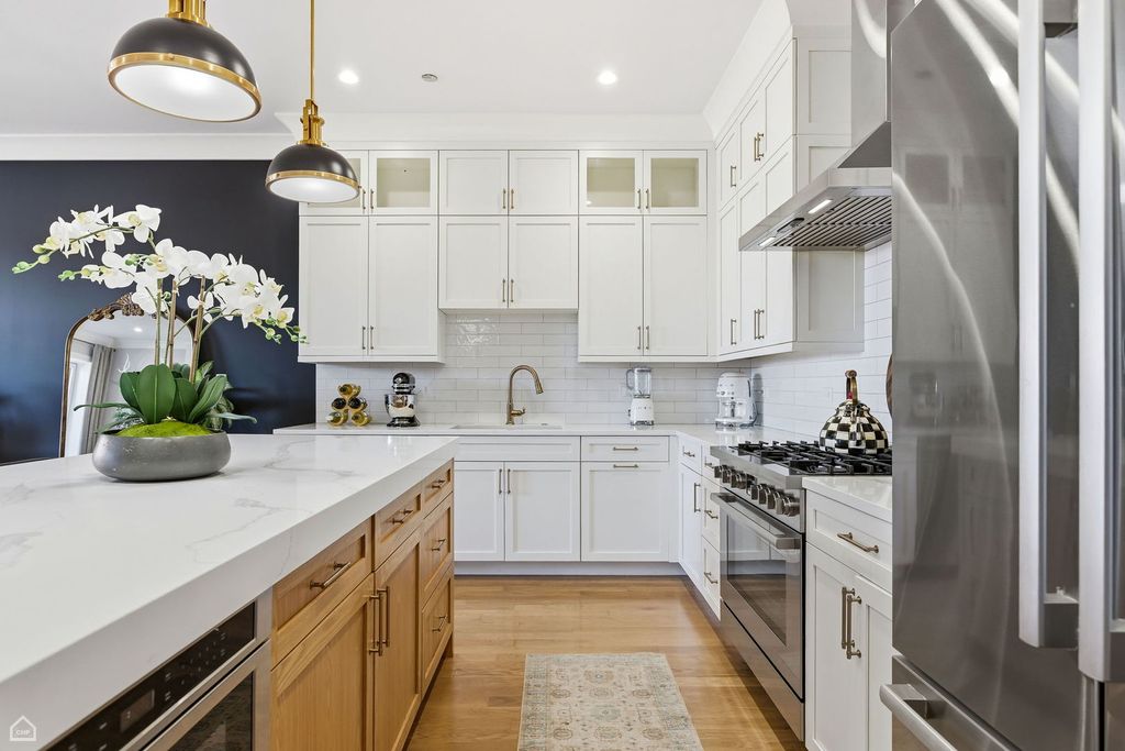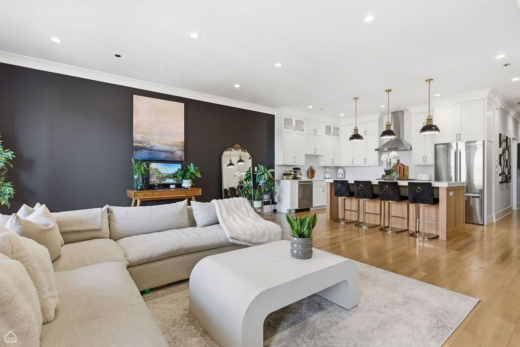 Extra wide newer construction in booming Avondale. Stately full brick and limestone building features oversized three bedroom two bath simplex home. Remarkable designer finishes throughout include custom kitchens with white cabinets, oversized dark island with quartz countertops, subway tiled backsplashes and Bosch stainless steel appliances package. Large family room with fireplace with herringbone tile surround and custom mantel with optional built-ins. Front terrace with porcelain pavers and gas line for grill. Primary bedroom features two walk in closets, full marble bath with double vanity, heated floors and steam shower. Thick cove crown molding and window casements throughout along with in unit laundry. Extensive sound proofing between units. Parking included.