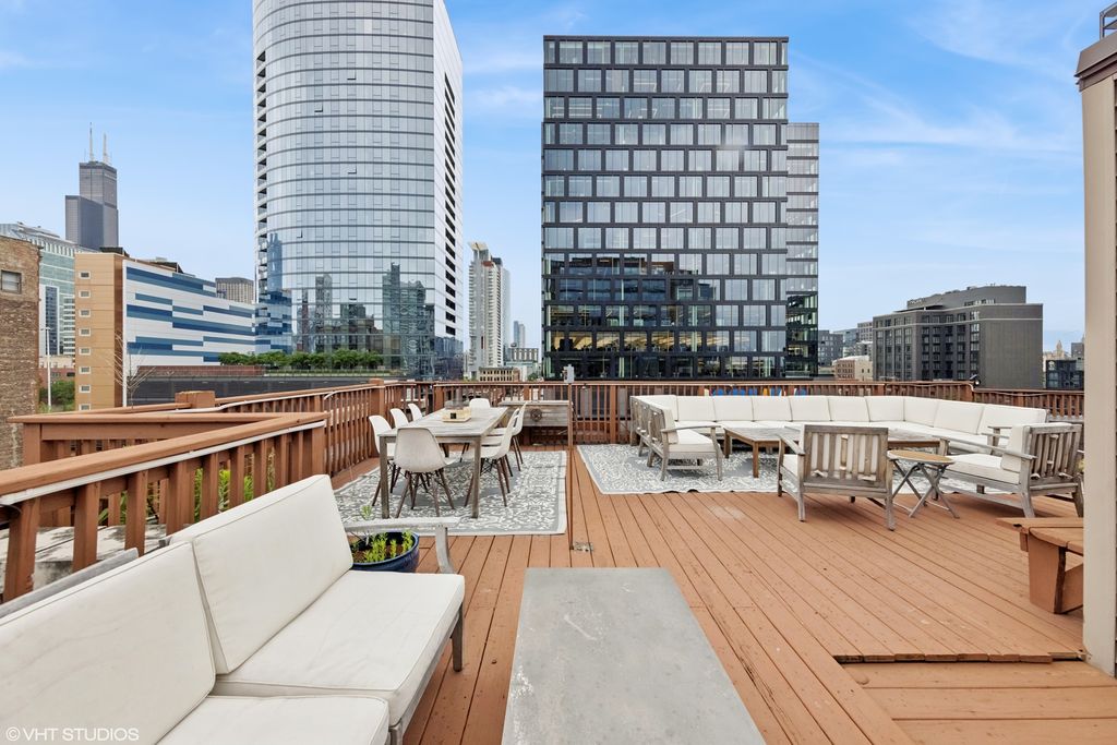 PENTHOUSE living at its finest! Enjoy your own PRIVATE rooftop oasis all summer long right in the heart of Fulton Market/West Loop! WALK to the hottest restaurants in town! This spacious 3bed/2bath condo with an extra wide floor plan is an entertainers dream. Kitchen features espresso stained walnut cabinets, stainless steel appliances, quartz countertops and a large island. The east facing living room has stunning city views with large windows and a balcony. Large primary bedroom with en suite bath featuring a shower, steamer, body sprays and rain shower plus a separate tub. Primary also has his and her closets with custom storage and a private balcony. Internal staircase leads to MASSIVE private rooftop deck with amazing city views. One garage space INCLUDED. VERY LOW HOAs. UNIT IS A WALK UP, NO ELEVATOR. Do not miss out!
