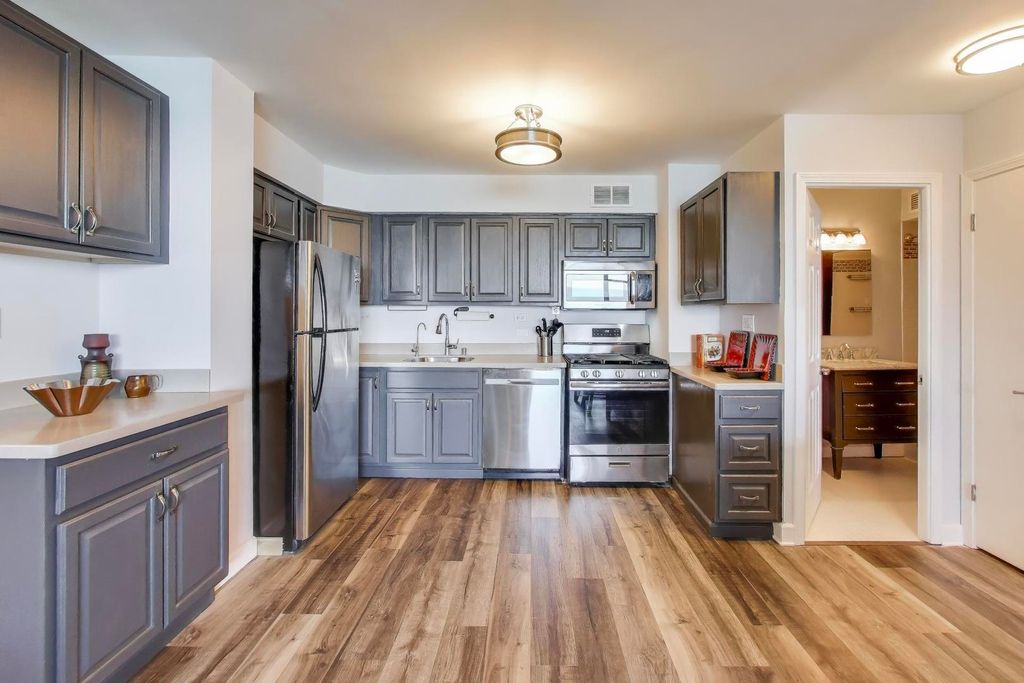 Elevated city living meets stunning lakefront views in this beautifully updated 21st-floor residence. This renovated 1-bedroom, 1-bath home is in close proximity to Loyola University and showcases sweeping views of the lake plus spectacular sunrises with colorful skies. Freshly painted and well-cared for, this beautiful condo features an open and spacious living/dining room combo that accommodates a full living room set with extra space for a large desk and shelving plus a large dining area as well. The sizable, open kitchen is perfect for entertaining and highlights solid wood cabinetry, Corian countertops, stainless steel appliances and two special nooks perfect for a setting up a bar area or keeping all your cookbooks on display! The oversized bedroom offers lake views and space for a large bed with extra furniture plus a desk and an extremely large walk-in closet. The updated bathroom includes a new large vanity, tile flooring, a tub/shower combo with plenty of storage space plus a linen closet just outside the bathroom. Other features in this lovely, move-in-ready home include: beautiful new flooring (2024), fully outfitted custom closet in bedroom, and a foyer entry closet with two sliding doors for easy access for coats and other items. Enjoy full-service living in this well-maintained, non-smoking building with 24-hour door staff, outdoor pool, fitness center, sauna, party and meeting rooms, bike storage, and on-site FREE laundry. Pet-friendly and investor-friendly with rentals allowed. There is a short 7 people waitlist for garage rental parking. Close to the beach, parks, shopping, restaurants, the CTA Red Line, express buses and Lake Shore Drive to downtown.
