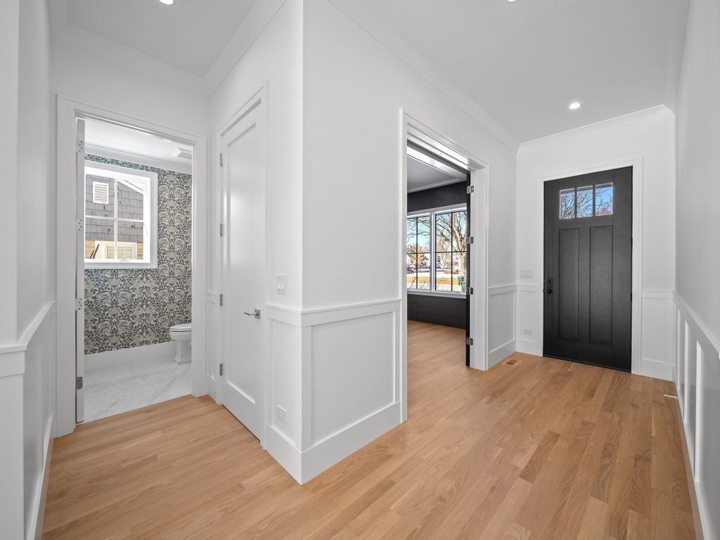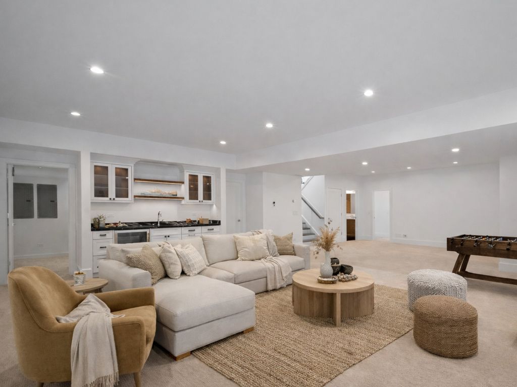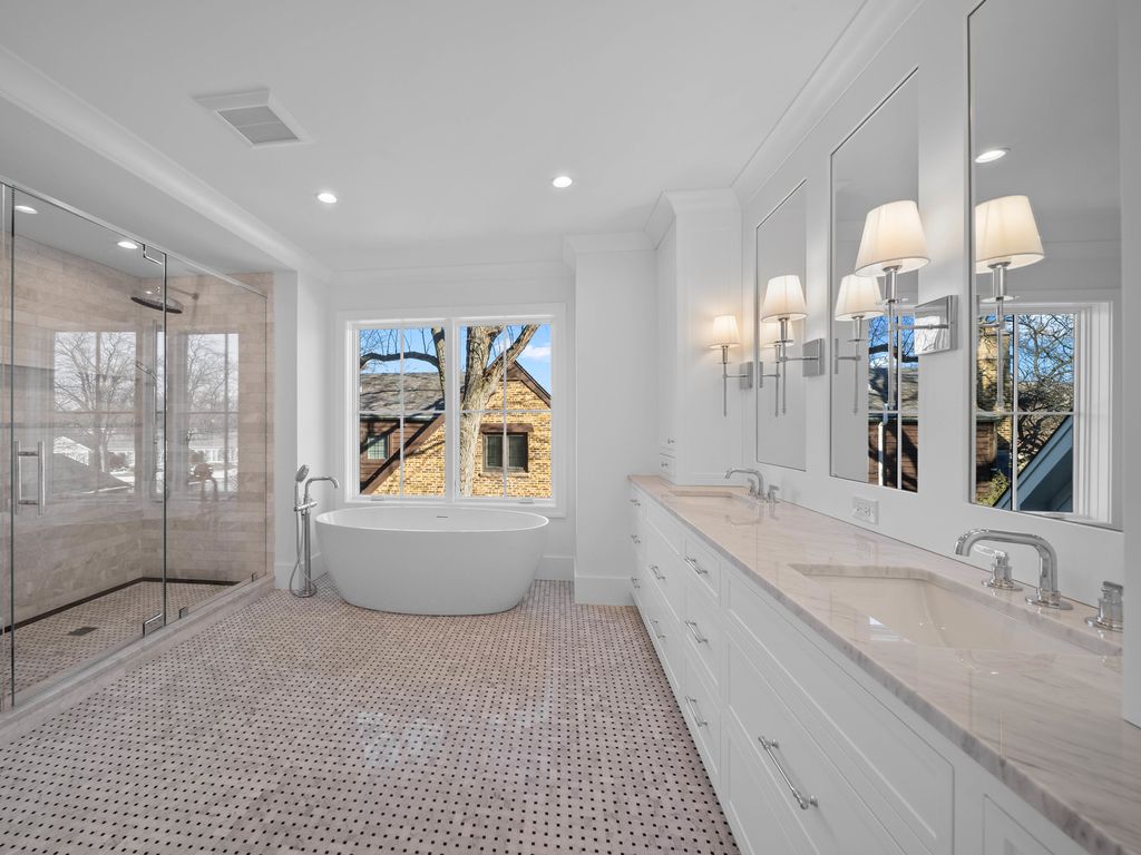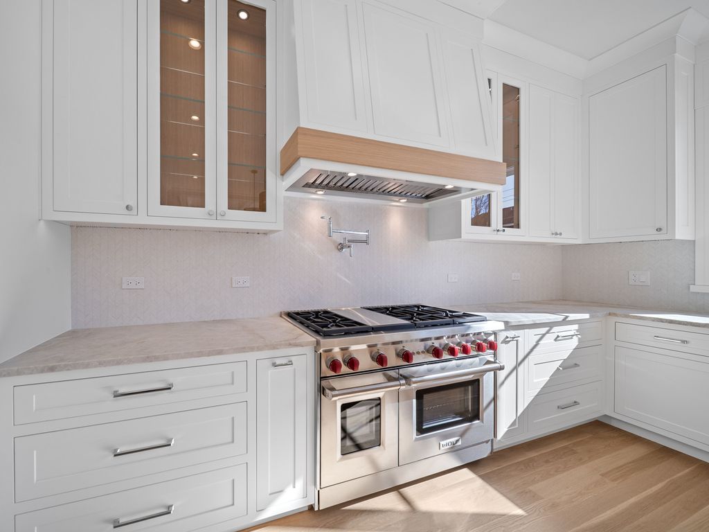 A statement of refined new construction set on one of Glenview's most sought-after streets, this architecturally tailored residence delivers a seamless blend of timeless craftsmanship and modern luxury across three impeccably finished levels. From the moment of entry, a gracious foyer adorned with paneled millwork, crown detailing, and warm hardwood floors sets an elevated tone, unfolding into interiors curated for both everyday living and elegant entertaining. A private office framed by French doors and a richly detailed dining room with tray ceiling offer sophisticated gathering spaces, while a thoughtfully designed butler's pantry-complete with leathered quartzite surfaces, wine refrigeration, and illuminated cabinetry-provides a polished transition into the showpiece kitchen. Taj Mahal quartzite crowns custom inset cabinetry, anchored by a substantial island designed for connection and conversation. Professional-grade appliances including a Wolf range, Sub-Zero refrigeration, Bosch dishwasher, and statement vent hood are complemented by a walk-in pantry and curated storage solutions, marrying beauty with performance. The adjoining family room, defined by a coffered ceiling and striking herringbone tile fireplace, opens effortlessly through sliding glass doors to a paver patio, creating a natural extension of the home's living space. A refined powder room and a highly functional mudroom with custom built-ins complete the main level. Upstairs, the primary suite serves as a private sanctuary, elevated by vaulted ceilings, dual custom walk-in closets, and a spa-inspired bath featuring heated marble floors, dual vanities, an oversized marble shower with rainfall fixture, and a sculptural soaking tub set beneath designer lighting. Secondary bedrooms are equally considered, including an ensuite retreat with heated floors, a Jack-and-Jill bath with dual vanities and private bathing area, and an additional bedroom with generous storage. A well-appointed laundry room and a skylit bonus room provide flexibility for today's evolving lifestyle needs. The fully finished lower level continues the home's commitment to thoughtful design, offering a spacious recreation lounge with custom bar and beverage refrigeration, a fifth bedroom with walk-in closet, and a full bath with heated floors and elevated finishes-ideal for guests, extended family, or private retreat. Mechanical systems reflect quality and efficiency, including a high-performance furnace with humidifier, 75-gallon water heater, sump pump, Nest climate control, and concrete driveway. Positioned in a premier in-town location, this exceptional residence offers the rare convenience of being just moments from award-winning schools, neighborhood parks, the public library, vibrant restaurants, boutique shopping, and the Metra station-an enviable walkable lifestyle without compromising privacy or prestige.