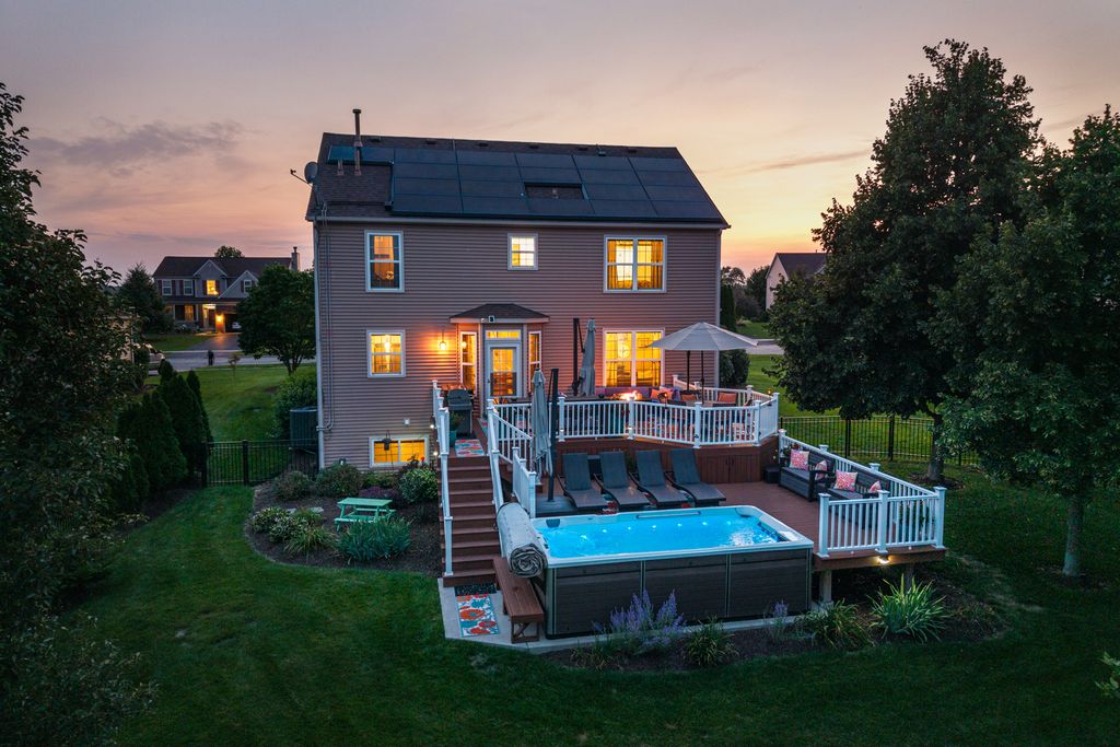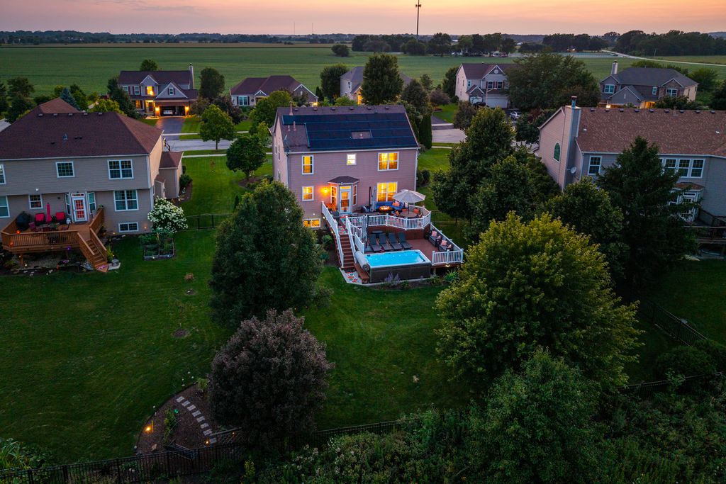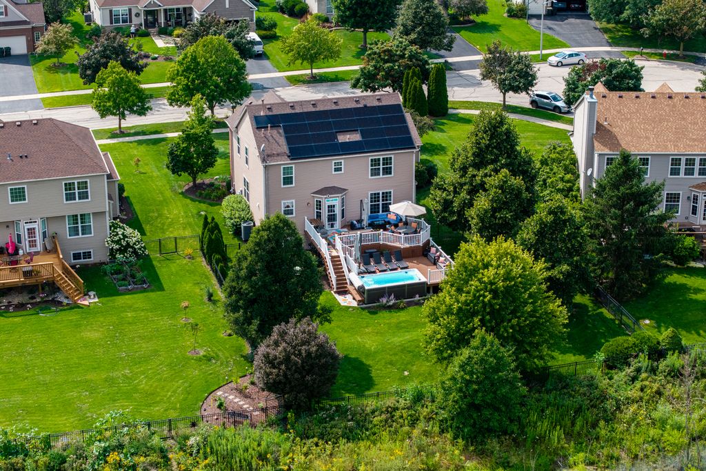 Stunning Tanner Trails home perfectly situated on a quiet cul-de-sac backing to protected wetlands offering privacy, scenic views, and exceptional outdoor living. This well-maintained home features approximately 2,436 square feet above grade plus a beautifully finished English lookout basement, providing flexible living and entertaining space throughout. The main level offers hardwood flooring, custom moldings, private office, spacious living and dining areas, and an inviting family room with gas fireplace. The kitchen has been updated with refreshed cabinetry, GE Profile appliances including double oven range, refrigerator, microwave, and Bosch dishwasher, along with reverse osmosis drinking water system. The finished basement provides excellent additional living space ideal for recreation, fitness, work, or play. Upstairs, the remodeled primary suite features a spa-inspired bathroom with carrara marble shower, custom vanity, upgraded tile flooring, and custom closet organization. Additional bathrooms have been updated with modern finishes and fixtures. Outdoor living is exceptional with premium wetlands views, upper and lower decks, aluminum fenced yard, and Endless Pool swim spa installed in 2021. Energy-efficient Tesla solar system with dual Powerwalls and EV charger adds modern efficiency and backup power capability. Extensive updates include finished basement (2012), roof, gutters and siding updates (2014), water heater (2018), primary bath remodel (2019), kitchen updates (2021), new A/C (2023), lighting, flooring, water softener, Tesla solar system and Powerwalls (2022), exterior trim painting and driveway sealing (2025), and more. HVAC system is professionally maintained on a regular service schedule. Located in the sought-after Tanner Trails subdivision featuring neighborhood trails, wetlands, and convenient access to Randall Road, I-88, shopping, dining, and recreation. Highly regarded Kaneland School District 302, including Blackberry Creek Elementary, Harter Middle School, and Kaneland High School. Energy-efficient Tesla Solar system with TWO Tesla Powerwall home batteries included - Not leased but owned. This advanced system allows the home to generate, store, and use its own solar energy, providing enhanced energy independence, lower utility costs, and reliable backup power during outages. The Tesla Powerwall is a rechargeable home battery that stores excess solar energy for use at night or during peak utility hours, helping maximize efficiency and reduce reliance on the electrical grid. In the event of a power outage, the system can automatically provide seamless backup power to keep essential home systems running. Smart energy monitoring and controls allow homeowners to track usage and optimize performance directly from the Tesla mobile app. A valuable long-term upgrade offering sustainability, convenience, and modern energy security.