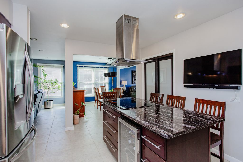 Beautifully updated true 4 bedroom - 2.5 bath split level with an abundance of natural light throughout the home - windows can be tilted in for easy cleaning. The open foyer welcomes you into the home where you will notice that the entire first floor features neutral porcelain tile. Walk in to the expansive living room with inviting big picture window, then to the dining area with cool calming blue accent walls. The updated kitchen features everything one could possibly need: granite countertops, custom cabinetry, expansive island with seating, two cooktops - 1 electric and 1 gas, double oven, oversize refrigerator, dishwasher, microwave and beverage fridge. The family room is cozy with a gas fireplace for cuddling on those chilly nights. There is a full deck/lower level patio combination in this fully fenced enchanting space. Evenings of entertainment and many family meals have been enjoyed within the tranquil beauty of the lush gardens, landscaped space, under the mature trees in a canvas of privacy in the well planned foliage. This meticulously crafted landscaping starts to wake up in March with blooming flowers, ending with nice fall colors through November - each season brings interest. Hardwood floors run throughout the second level, which features four spacious bedrooms (2 currently with brand new carpeting) and two full baths. The master suite offers plenty of space, large bathroom with vanity and tiled shower - high end, low maintenance marble and Kohler shower door. Other 3 bedrooms are well-sized with ample closet space, and the full bath has also been tastefully renovated to include the same marble tile as the master bath. Head to the lower level where you'll find a perfect area for every day living or to entertain your guests, take care of your laundry, find plenty of storage and go out to the garage in this walkout level. Situated on a quiet residential court close to parks, schools, shopping, and major roadways. Pride in homeownership shines in this move-in ready updated home that combines modern style with everyday comfort close to transportation, highways, shopping, restaurants, library, parks and forest preserves. Most recent updates are: 2026: front bedrooms: new carpet, closet doors 2025: Hall bath remodel, living room window/blinds