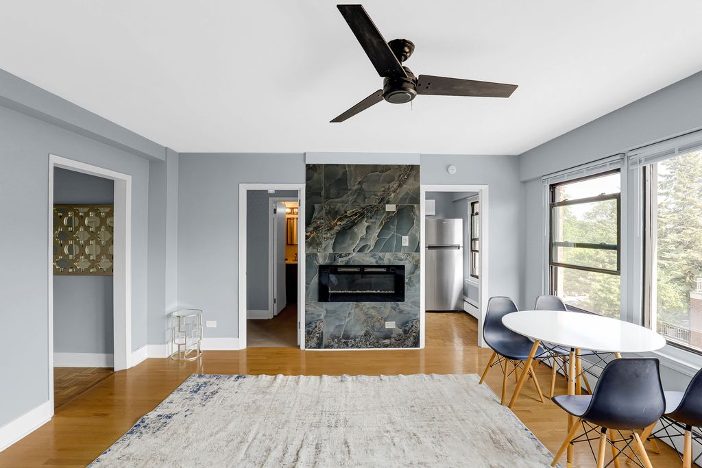 Welcome to this beautifully renovated studio condo steps from Lake Michigan in prime Uptown neighborhood! This unit perfectly blends modern comfort with functional living. Upon entry, you're greeted by a spacious coat closet, offering generous storage and an organized, welcome home. The expansive living area can accommodate a king-sized bed, a cozy couch, dining table, and a workspace-ideal for both relaxing and entertaining. Rich hardwood floors, a wall-mounted electric fireplace, and a spot above for a TV mount create a warm and inviting ambiance. Off the main living space, a versatile bonus room awaits-complete with a large linen closet, bench seating, and new floor tiles-leading into a fully updated bathroom. Enjoy sleek upgrades including a brand-new toilet, vanity, mirror, shower, and tile flooring. The kitchen features brand-new quartz counters, stylish backsplash, all-new cabinets, and stainless steel appliances. This unit is move-in ready with all the right upgrades. Walking distance from parks, public transportation, and Lake Michigan. Don't miss the opportunity to own this thoughtfully updated gem!