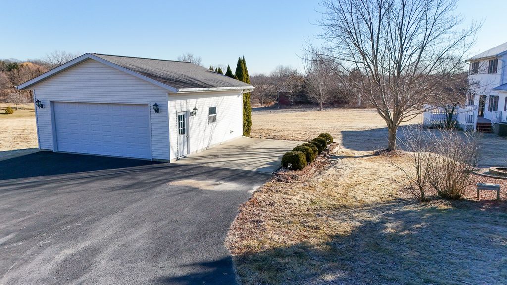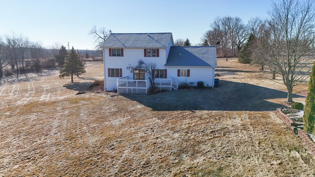 Set on 2.5 peaceful acres just west of Dixon, this beautifully maintained 3 bedroom, 2.5 bath home offers space, privacy, and comfort in a setting that feels like a retreat. Inside, the thoughtful layout is filled with natural light and enhanced by recessed lighting throughout the main living areas. The kitchen and dining space is both functional and inviting, featuring hardwood floors, granite countertops, a center island, and easy access to the back deck, perfect for everyday living or entertaining. The open living room anchors the main level with a gas fireplace that was fully renovated in 2020, creating a warm and welcoming focal point. A main floor laundry room, powder room, and charming foyer round out the first level. Upstairs, the primary suite is a true standout, offering a private balcony, an 8x8 alcove ideal for a home office or reading nook, and a beautifully finished en-suite bath with a tiled walk in shower and double vanity. Two additional generously sized bedrooms and a full bath complete the second floor. The partially finished walkout basement adds flexible living space with a family or recreation room, direct outdoor access, and abundant storage. Outside, enjoy both a front porch and a large back deck, perfect spots to relax and take in the surrounding nature and wildlife. With an attached two car garage plus an additional detached two car garage, this property offers exceptional storage and workspace. Major updates include a new well pump (2025), A/C, furnace, and fireplace renovation (2020), water softener (2018), roof(2016), detached garage (2012), and septic (2007). Move in ready, thoughtfully updated, and set in a serene location, this is country living at its best.