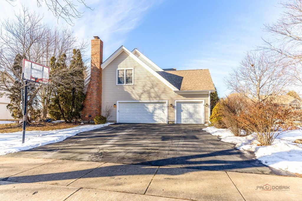 Spectacular home in the highly desirable Stone Fence community, nestled on a corner cul-de-sac lot, featuring a bright, open floor plan with gleaming hardwood floors, vaulted ceilings, and a finished basement. Prestigious school districts 103 and 125! The formal living room showcases a vaulted ceiling and bay window, while the banquet-sized dining room is perfect for hosting gatherings. The chef's kitchen offers double ovens, an island, ample cabinetry, and an eating area, opening seamlessly to the entertainment-sized family room with cozy fireplace and skylights. A main-level office with wet bar provides the ideal work-from-home space. The primary suite includes a walk-in closet and private bath with whirlpool tub. Three additional bedrooms and full bath on the second level. Step outside to enjoy the brick paver patio and beautifully maintained yard. Additional highlights include a three-car garage and a prime location near parks and the train. Numerous updates include AC (2024), appliances (2024), washer and dryer (2022), furnace (2020), roof (2022), siding (2022), hardwood flooring on first floor (2013), wood flooring (2013), Andersen windows (approx. 2010), and a new sump pump with backup battery (2021). A truly impressive home with timeless style and modern updates!