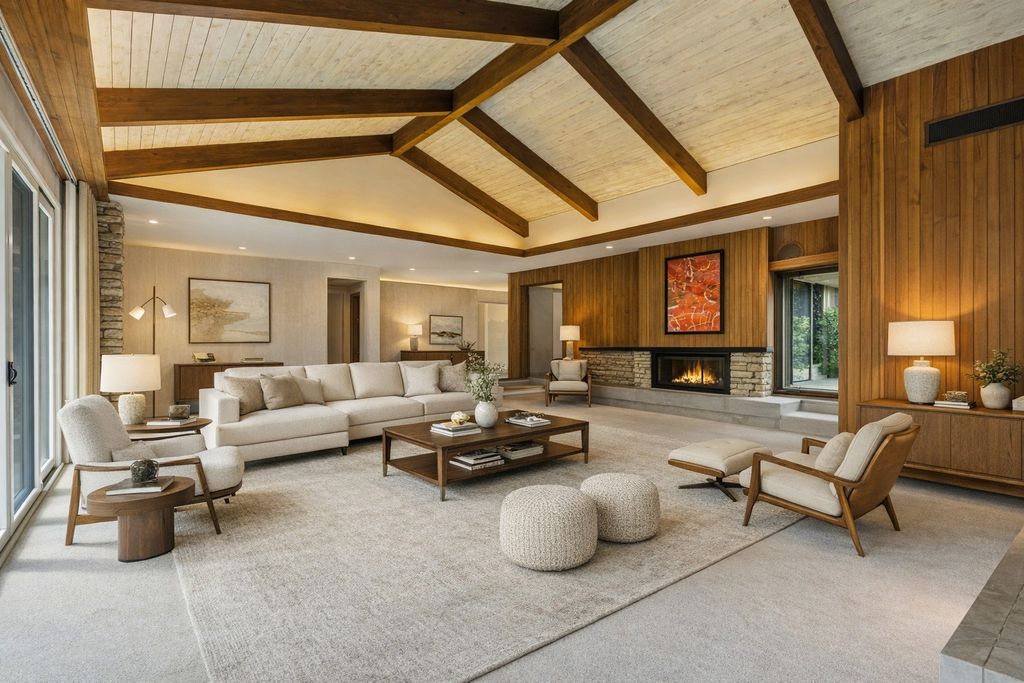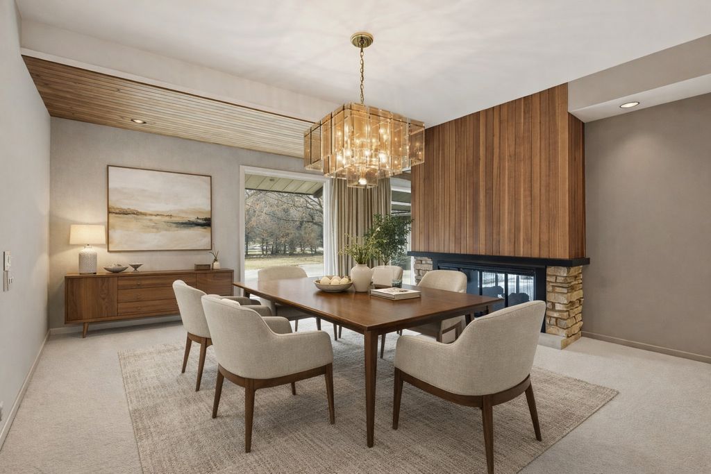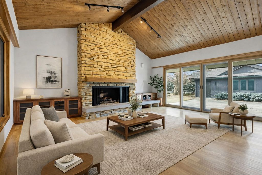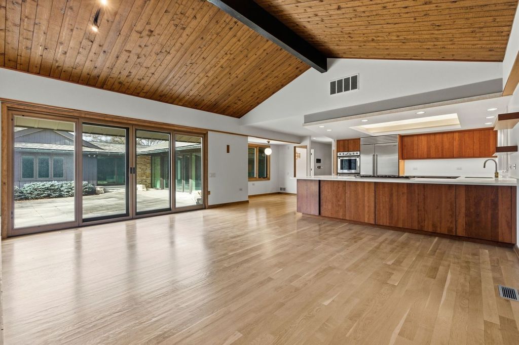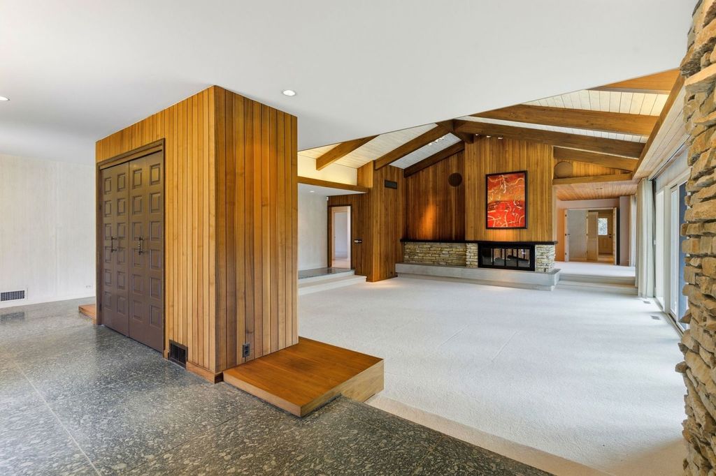 Welcome to a rare luxury mid-century modern ranch set in the highly sought-after Scarsdale neighborhood. This thoughtfully maintained home blends iconic design with modern upgrades, delivering timeless style, space, and comfort on an expansive .55-acre lot. With over 4,500 square feet, every inch of this property makes a bold architectural statement while staying warm and inviting. The heart of the home is the stunning great room, where an 18-foot vaulted ceiling and floor-to-ceiling Pella Architectural Series windows flood the space with natural light and frame peaceful views of the yard. A dramatic see-through fireplace connects the great room to the dining area, creating a striking focal point that feels both stylish and functional. The open layout flows effortlessly and showcases the home's original mid century modern character. The updated kitchen is both sleek and practical, featuring luxury commercial-grade stainless steel appliances, custom Allmilmo cabinetry, and quartz countertops with seating. A separate eating area adds flexibility, while the kitchen opens directly to a spacious family room with vaulted ceilings and a stone gas log fireplace, perfect for everyday living or entertaining. This home offers four bedrooms and four-and-a-half bathrooms, with every bedroom featuring its own en-suite bathroom. The primary suite stands out with generous proportions and abundant closet space, offering a true retreat. A private home office overlooks the large patio, providing a quiet and inspiring workspace with views of the outdoors. The lower-level expands the living space with 9-foot ceilings, a stylish bar area, and an additional bathroom-ideal for hosting or relaxing. Practical upgrades include a new roof in 2025 and a new 200-amp electrical panel in 2025, adding peace of mind. Car enthusiasts and hobbyists will appreciate the four-car garage, including a side garage with epoxy flooring and radiant heat roughed-in. The location completes the package, offering easy access to parks, schools, Metra, and downtown Arlington Heights, all while enjoying the privacy of a beautifully landscaped setting. This exceptional mid-century modern home in Arlington Heights honors its architectural roots while embracing modern convenience, making it a truly standout property in one of the area's most desirable neighborhoods.