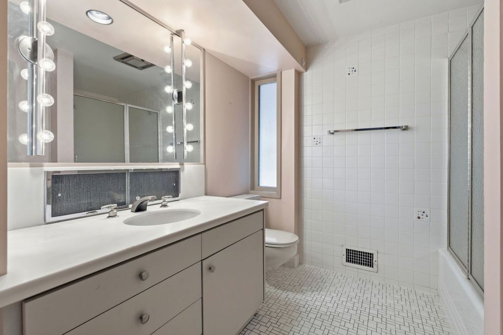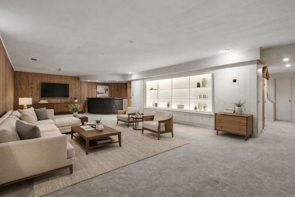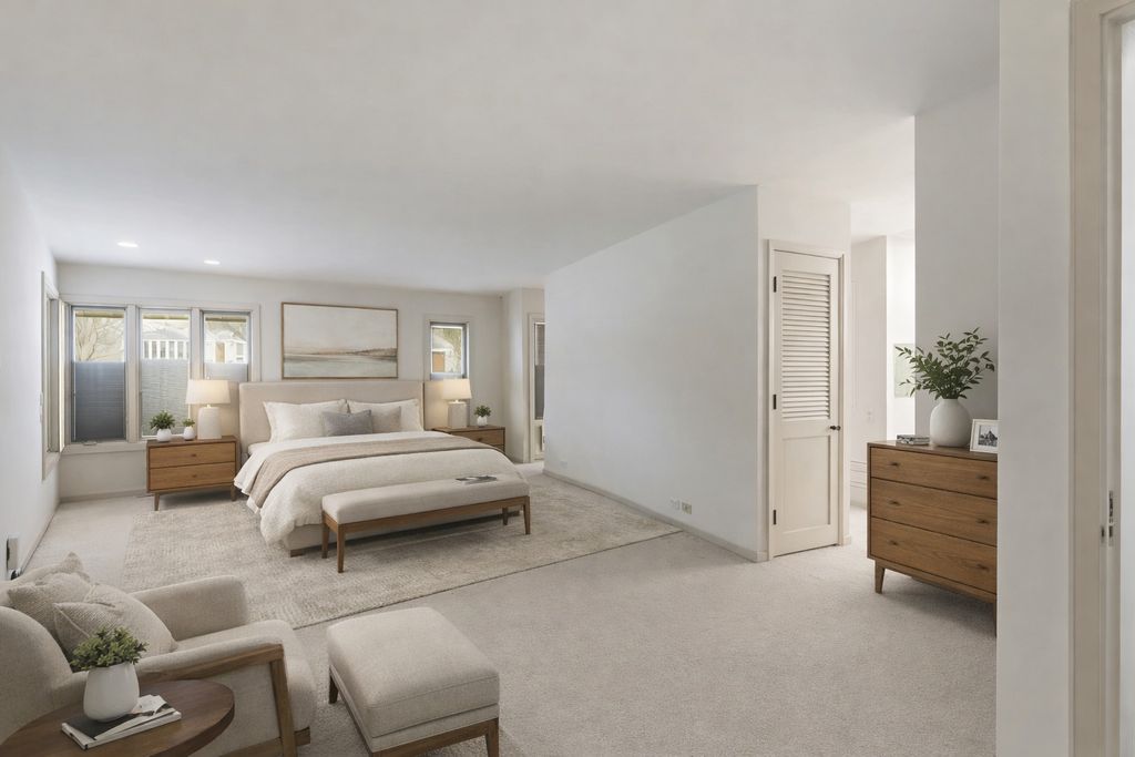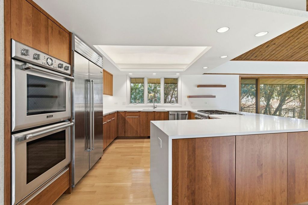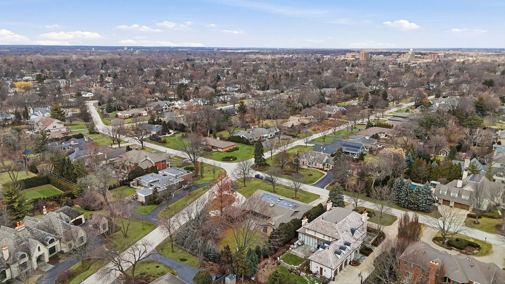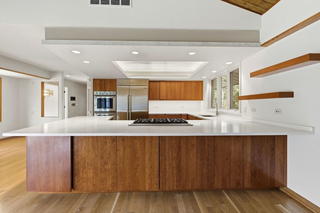 Welcome to a rare luxury mid-century modern ranch set in the highly sought-after Scarsdale neighborhood. This thoughtfully maintained home blends iconic design with modern upgrades, delivering timeless style, space, and comfort on an expansive .55-acre lot. With over 4,500 square feet, every inch of this property makes a bold architectural statement while staying warm and inviting. The heart of the home is the stunning great room, where an 18-foot vaulted ceiling and floor-to-ceiling Pella Architectural Series windows flood the space with natural light and frame peaceful views of the yard. A dramatic see-through fireplace connects the great room to the dining area, creating a striking focal point that feels both stylish and functional. The open layout flows effortlessly and showcases the home's original mid century modern character. The updated kitchen is both sleek and practical, featuring luxury commercial-grade stainless steel appliances, custom Allmilmo cabinetry, and quartz countertops with seating. A separate eating area adds flexibility, while the kitchen opens directly to a spacious family room with vaulted ceilings and a stone gas log fireplace, perfect for everyday living or entertaining. This home offers four bedrooms and four-and-a-half bathrooms, with every bedroom featuring its own en-suite bathroom. The primary suite stands out with generous proportions and abundant closet space, offering a true retreat. A private home office overlooks the large patio, providing a quiet and inspiring workspace with views of the outdoors. The lower-level expands the living space with 9-foot ceilings, a stylish bar area, and an additional bathroom-ideal for hosting or relaxing. Practical upgrades include a new roof in 2025 and a new 200-amp electrical panel in 2025, adding peace of mind. Car enthusiasts and hobbyists will appreciate the four-car garage, including a side garage with epoxy flooring and radiant heat roughed-in. The location completes the package, offering easy access to parks, schools, Metra, and downtown Arlington Heights, all while enjoying the privacy of a beautifully landscaped setting. This exceptional mid-century modern home in Arlington Heights honors its architectural roots while embracing modern convenience, making it a truly standout property in one of the area's most desirable neighborhoods.