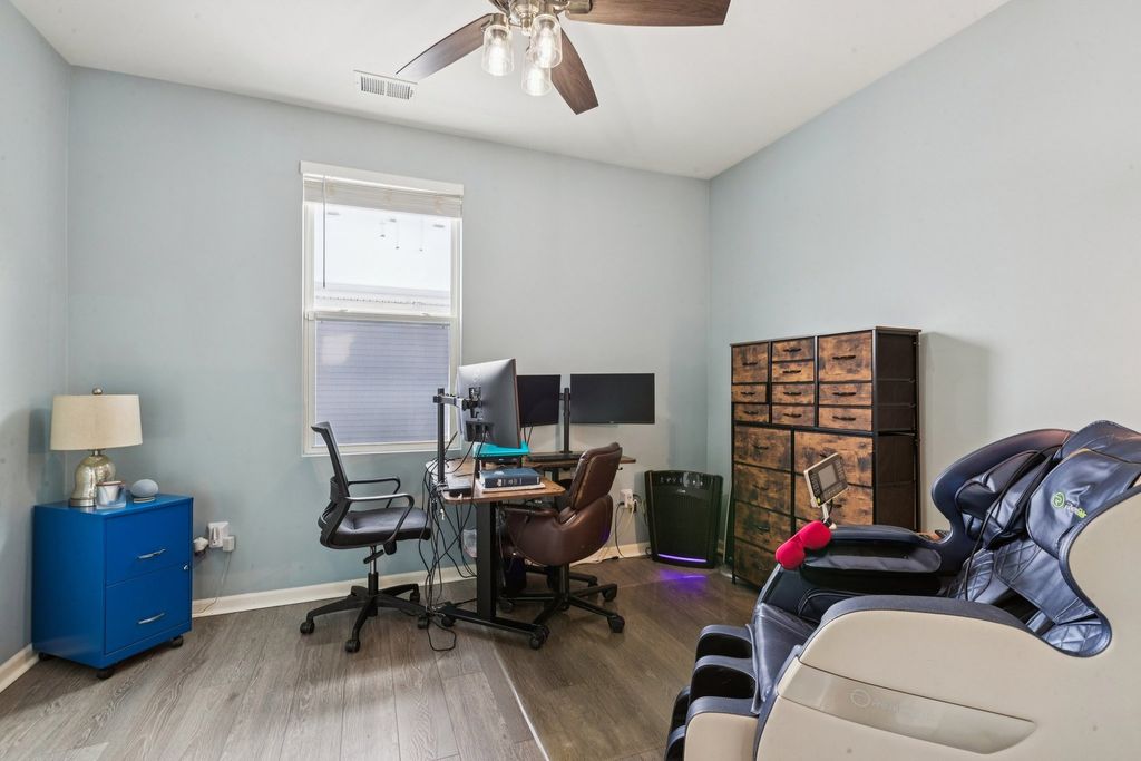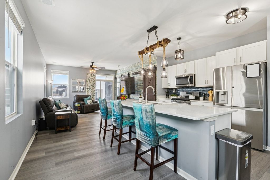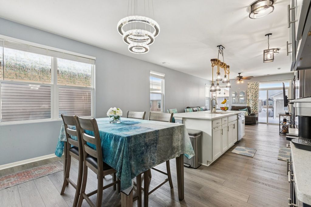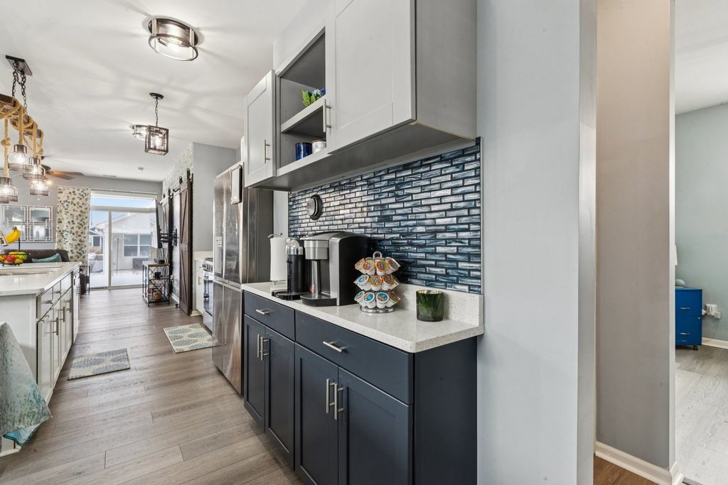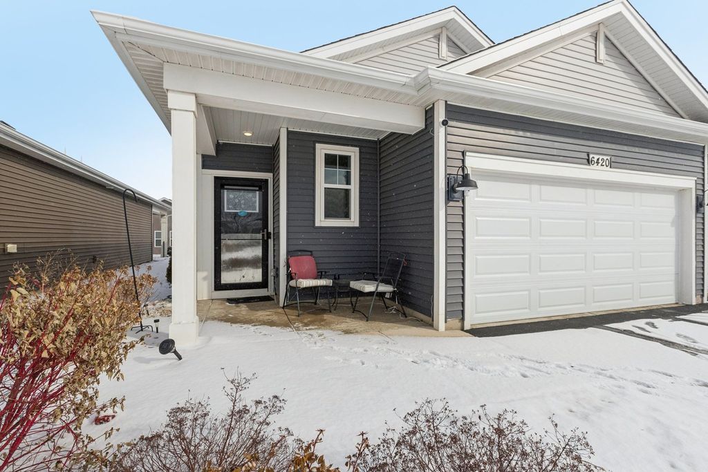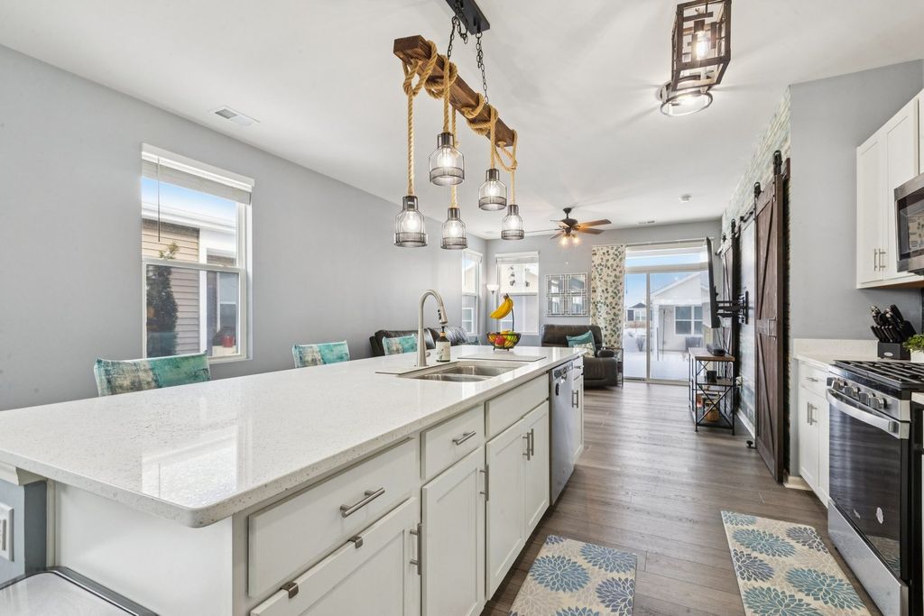 Experience a thoughtfully upgraded 2 bedroom plus den ranch designed for comfort, style, and low maintenance living. This rare layout offers exceptional natural light with windows on all four sides, 9' ceilings, and a modern open concept design that feels bright and inviting from the moment you enter. The kitchen serves as the centerpiece of the home, featuring an impressive 10' quartz island-a unique upgrade not available in any other model. A custom pantry system, custom coffee bar, LG 27cuft refrigerator with craft ice, and Samsung washer and gas dryer elevate everyday convenience. New 1/4" luxury vinyl plank flooring runs throughout the home for a clean, cohesive look. Four professionally installed designer barn doors-including an 8' glass panel door on the den-add architectural interest and functionality. The spacious primary suite includes a dual vanity ensuite bath, walk in shower, private water closet, and a custom master closet with dedicated linen storage. The premium 3 car garage is fully enhanced with 17" attic insulation, insulated exterior walls, a heater, four additional outlets ideal for tools or projects, smart Chamberlain openers, and upgraded exterior lighting. Outdoor spaces have been expanded and refined with an extended back patio, privacy screens, an enlarged front patio, river rock landscaping, and a raised garden bed. Smart home features include integrated smart technology and a full Ring security suite (hardwired and solar). Landscaping and snow removal are included, offering a truly low maintenance lifestyle. Located in an AirBnB friendly community with resort-style amenities-clubhouse, fitness center, pool, splash pad, cabanas, and walking paths. No age restrictions on ranch homes. This home is priced competitively for the extensive upgrades, premium garage enhancements, and outdoor improvements it offers-an exceptional value within the community.
