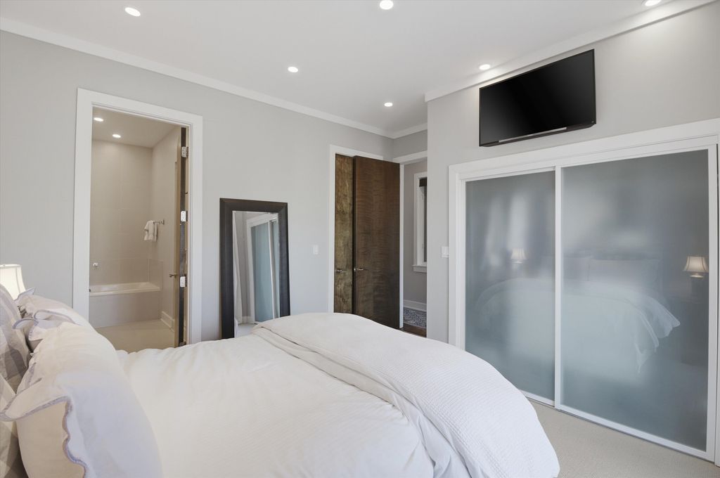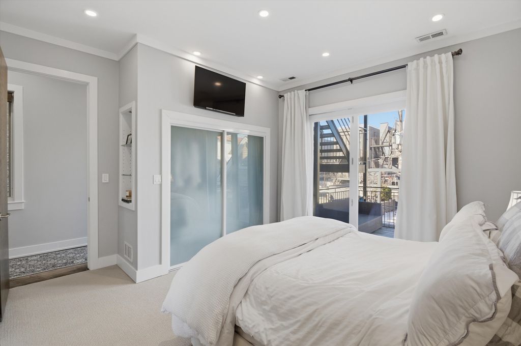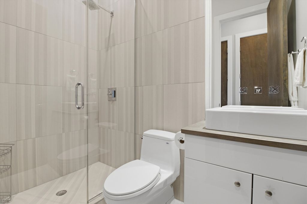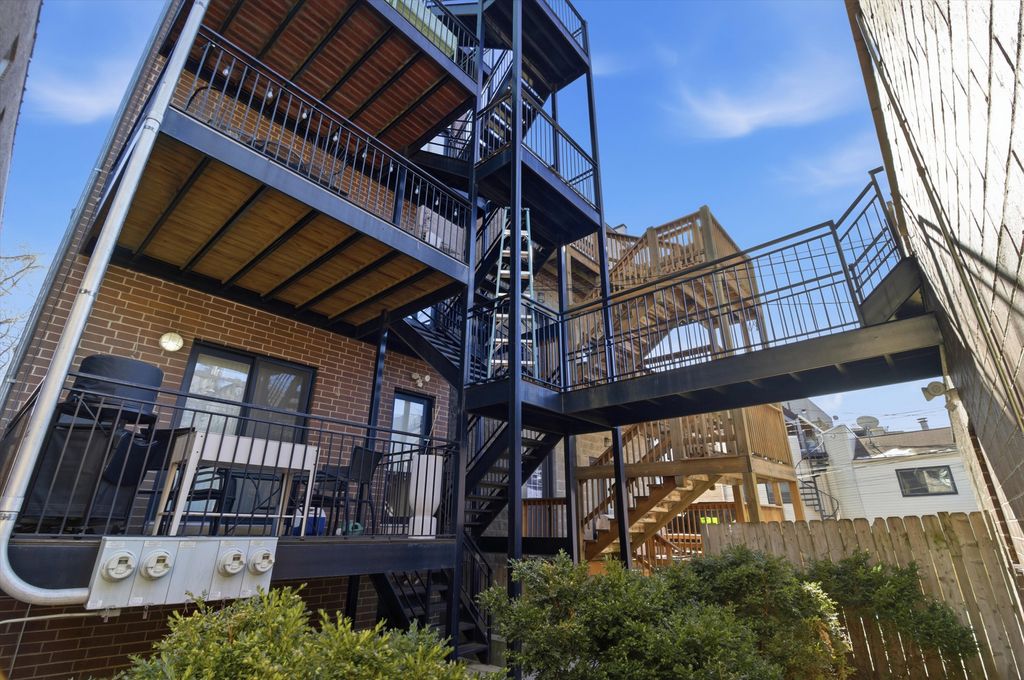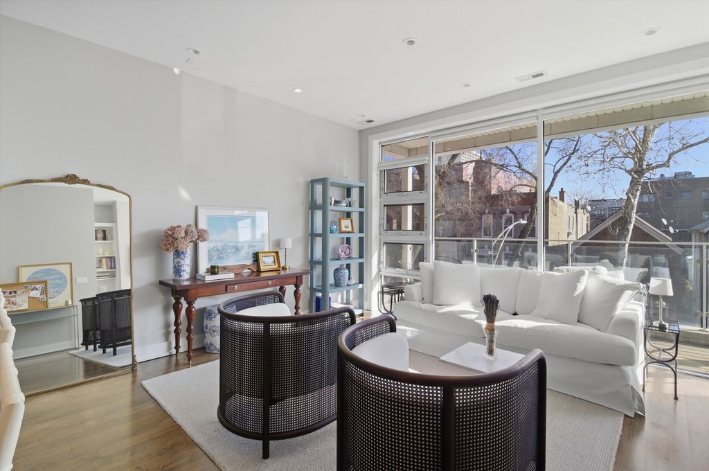 Elevated design meets exceptional quality in this beautifully maintained 2-bedroom, 2-bath residence in the heart of East Village. Constructed with masonry on the sides and rear and CMU/steel at the front, this building stands apart from others, offering superior craftsmanship and architectural integrity throughout. Inside, soaring 9.5-foot ceilings, floor-to-ceiling windows, and solid-core 8-foot doors create a bright, expansive feel. The open-concept living and dining space is anchored by wide-plank maple flooring and a sleek Italian tile gas fireplace, flowing seamlessly onto an impressive 18-foot front terrace. The contemporary kitchen is thoughtfully designed with 42-inch high-gloss cabinetry, striking 11/4-inch soapstone countertops and full backsplash, Jenn-Air and Bosch stainless steel appliances, disposal, and a generous island with breakfast seating. The spacious primary suite easily accommodates a king-sized bed and features two custom Elfa-organized closets, along with direct access to the large rear deck. The spa-caliber en-suite bath offers a high-gloss double vanity with Toto vessel sinks, GROHE fixtures, a Neptune air tub, elegant Italian tilework, and a steam shower with multiple body sprays. The second bedroom includes an Elfa-organized closet, while the guest bath showcases a glass-enclosed Italian tile shower, Toto sink, and GROHE wall-mounted faucet. Enjoy both front and rear covered decks, with new wood decking installed in 2022. Garage parking is included, along with additional storage in the building. Perfectly positioned just off Division Street, you're a two-minute walk to the Blue Line and steps from Wicker Park's renowned dining, shopping, and nightlife. Take a 3D virtual tour and experience every detail of this exceptional home.
