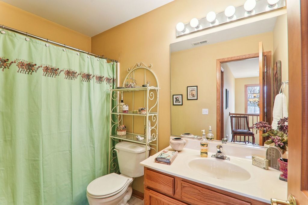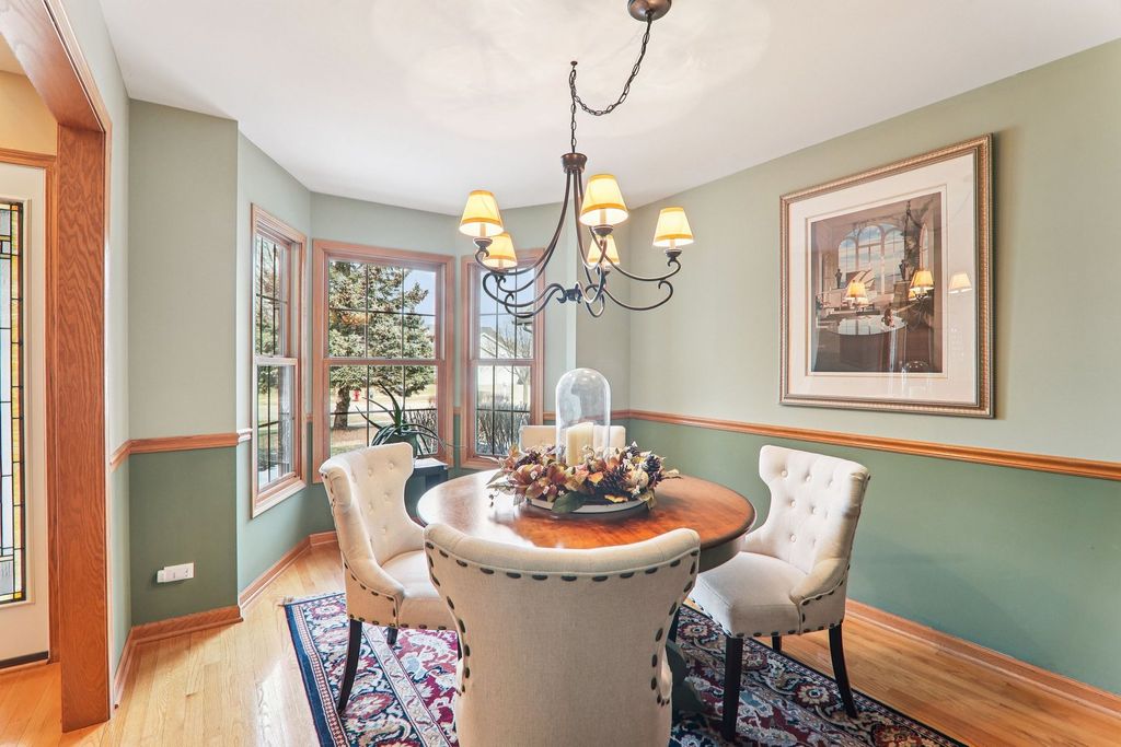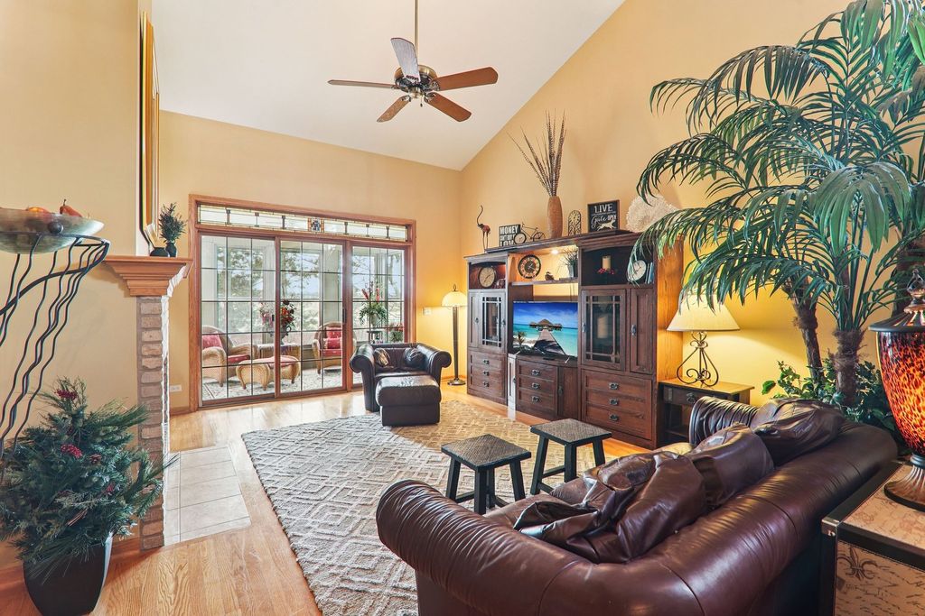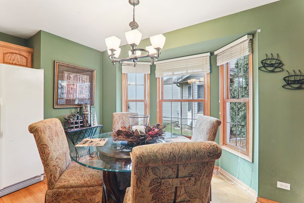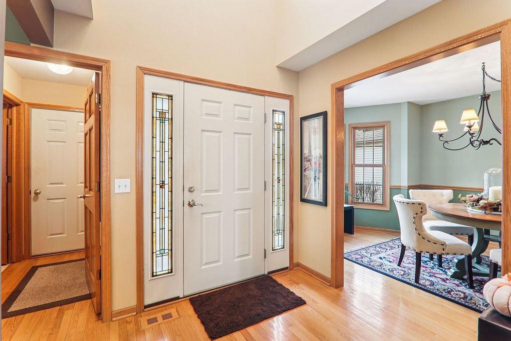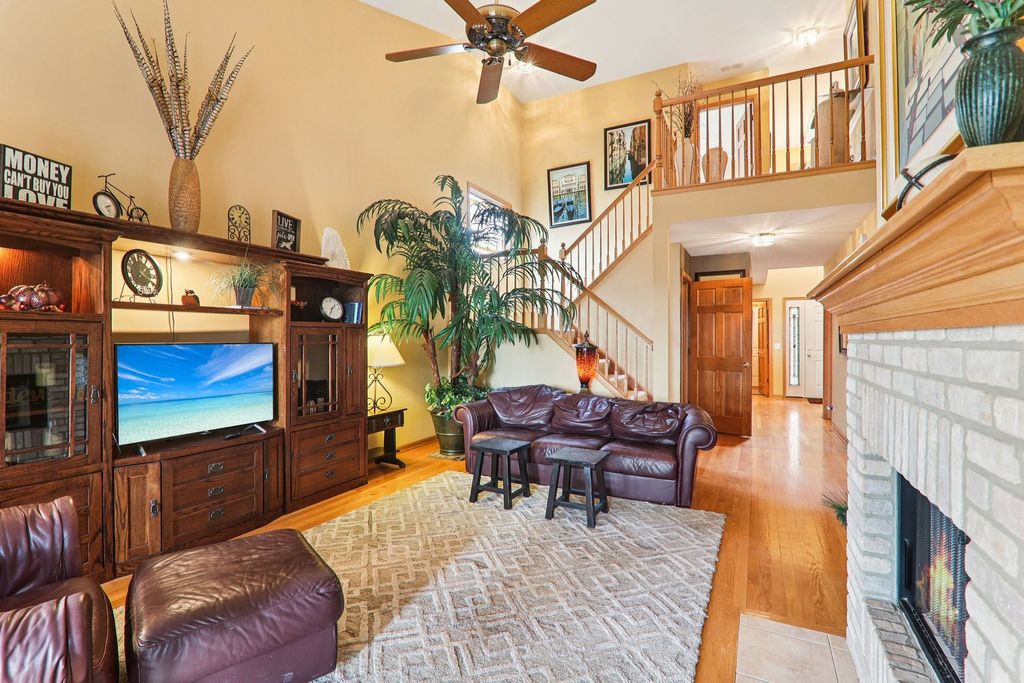 Welcome to this stunning Hampshire duplex, a residence that perfectly blends architectural elegance with everyday functionality. As you step inside, the foyer greets you with soaring ceilings that set an airy, expansive tone for the entire home. To the left of the entrance, a formal dining room sits bathed in natural light from a charming bay window, while to the right, a massive eat-in kitchen serves as the heart of the home. This chef's space features a central island, a generously sized pantry, and a second bay window in the breakfast area, making it an ideal spot for morning coffee. The main level continues to impress with a grand living room defined by high ceilings, a cozy fireplace, and a ceiling fan for year-round comfort. Sliding glass doors transition seamlessly from the living area into a bright sunroom, offering a peaceful retreat. The primary bedroom is conveniently located on the first floor, boasting vaulted ceilings and abundant natural light. This private sanctuary includes a walk-in closet and an ensuite bath complete with a double vanity, a relaxing soaking tub, and a separate shower. A laundry room and a guest-friendly half bath complete the main level's thoughtful layout. Moving upstairs, a large landing provides a dramatic overlook into the living room below, leading to two additional spacious bedrooms with ample closet storage and a full hallway bathroom. The living space extends even further into the basement, which features a large family room and a full bathroom updated in 2006 with a jetted whirlpool tub. With an attached two-car garage and a layout designed for effortless living, this 3-bedroom, 3.5-bath gem is truly a rare find.