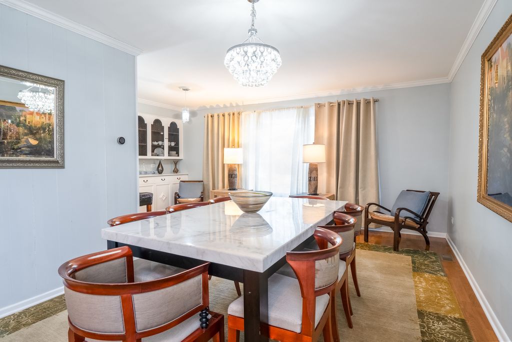 Bright and sunny, pristine split-level. This super cute home features hardwood floors, crown moldings, combo living and dining room, kitchen with bar seating, SS appliances, updated lighting, neutral paint tones, custom Levelor window shades, large family room with wood-burning fireplace, new W/D with laundry sink. The bedrooms on the upper level are large and sunny with double door closets.The exterior features lots of trees, a big lot with a fenced yard and a two-car garage.