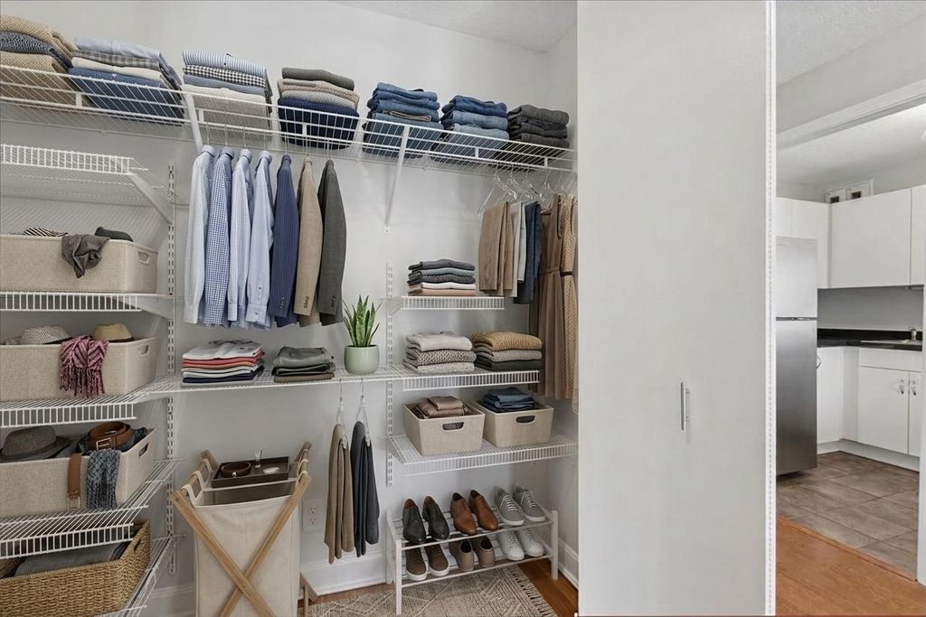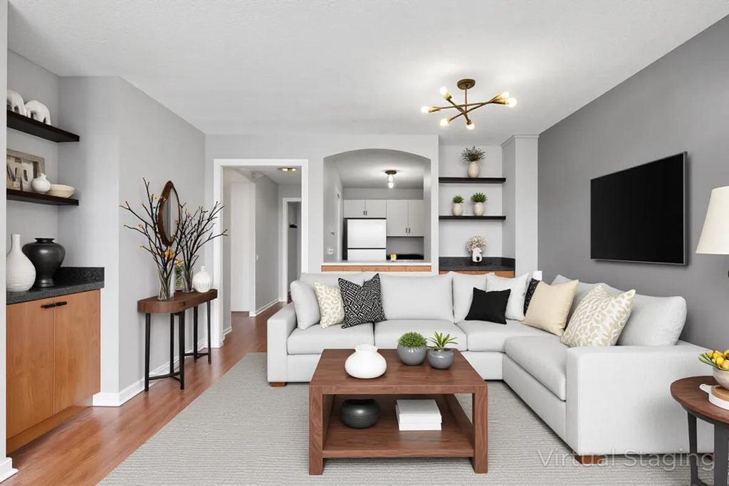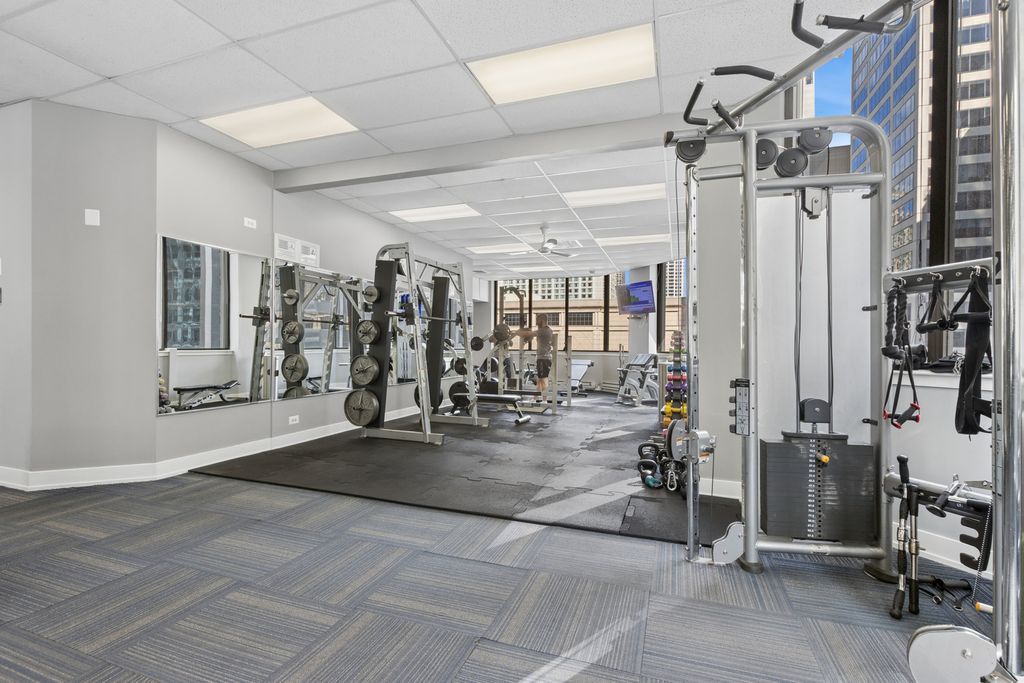 Spacious and thoughtfully designed 1-bedroom, 1-bath condo at River Plaza featuring one of the largest one-bedroom floor plans in the building, complete with abundant closet space and a flexible layout. A welcoming entry opens to a versatile bonus room-perfect for a home office or fitness area-highlighted by a stylish accent wall ideal for video calls. The kitchen boasts brand-new stainless steel appliances and a convenient breakfast bar, while the living and dining area easily accommodates both a dining table and sofa, complemented by built-in shelving for added storage or display. The generously sized bedroom fits a king-size bed and features newly installed carpeting. Enjoy full-service living with 24-hour door staff, indoor pool and hot tub, sundeck, fitness center, on-site management, restaurants, and a salon. Ideally located in the heart of River North with easy access to premier dining, nightlife, the Chicago Riverwalk, and nearby green space at Lake Shore Park. HOA dues cover heat, air conditioning, cable, internet, water, trash, and snow removal-owner pays only electric. Photos are virtually staged to illustrate layout potential; finishes remain unchanged. Parking is available in the building for rent or purchase, with pricing varying.