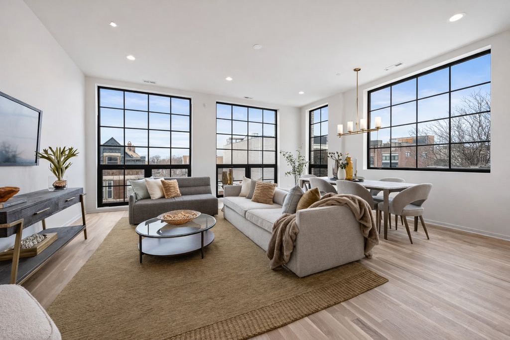 Halcyon Development proudly presents a boutique elevator building showcasing expansive 3 bed/ 2 bath units tailored for today's discerning buyer. Features include sleek custom kitchen with a oversized island, low-lit ambient lighting, designer pendant fixtures, stone countertops, and a professional-grade appliance packaged. The dramatically designed arch-bar features a chevron marble backsplash that creates a true "wow moment" in the open-concept living space. The spa-inspired primary bathroom offers sophistication with beautiful taupe floating dual vanities, heated terrazzo tiles, backlit mirrors, elegant alabaster sconces, and heated towel bar. Throughout the home, floor-to-ceiling grid-style windows evoke classic Brooklyn charm, enhanced by white oak floors and 8' solid-core doors. Each unit is fully wired for AV, blending luxury with modern functionality. Outdoor spaces finished in porcelain pavers. Situated just steps from neighborhood dining favorites like Le Bouchon and Club Lucky, these residences offer unmatched access to chic boutiques, cozy cafes, and the 606 Trail. The Damen Blue Line station is just a short walk away, making commuting a breeze. Just two left!