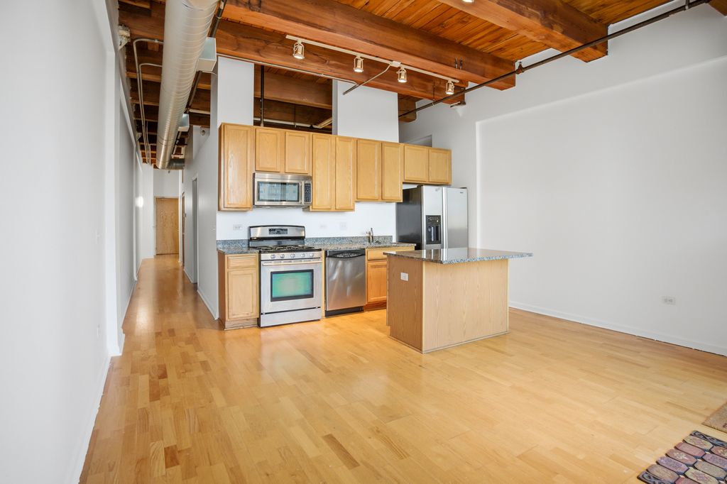 A classic timber loft with dramatic high ceilings in the heart of the South Loop. This 1-bedroom unit features east-facing views with plenty of natural light from the large windows and light-toned hardwood floors. The kitchen offers maple cabinetry, granite countertops, and a functional island that provides extra prep space and bar-stool seating. The spacious bedroom includes a walk-in closet, rarely found in loft living. Step out onto your private balcony, situated at the perfect height to offer a unique blend of privacy and a front-row seat to the passing trains. The owner recently installed a brand-new HVAC system only 3 months ago, providing years of worry-free comfort. This move-in ready home also includes an in-unit washer/dryer and access to a common rooftop deck with stunning skyline views. Located just 2 blocks from the red, green and orange lines and within walking distance to Mariano's, museum campus, and the lakefront.