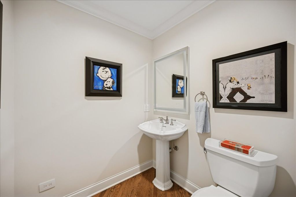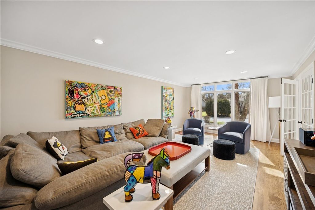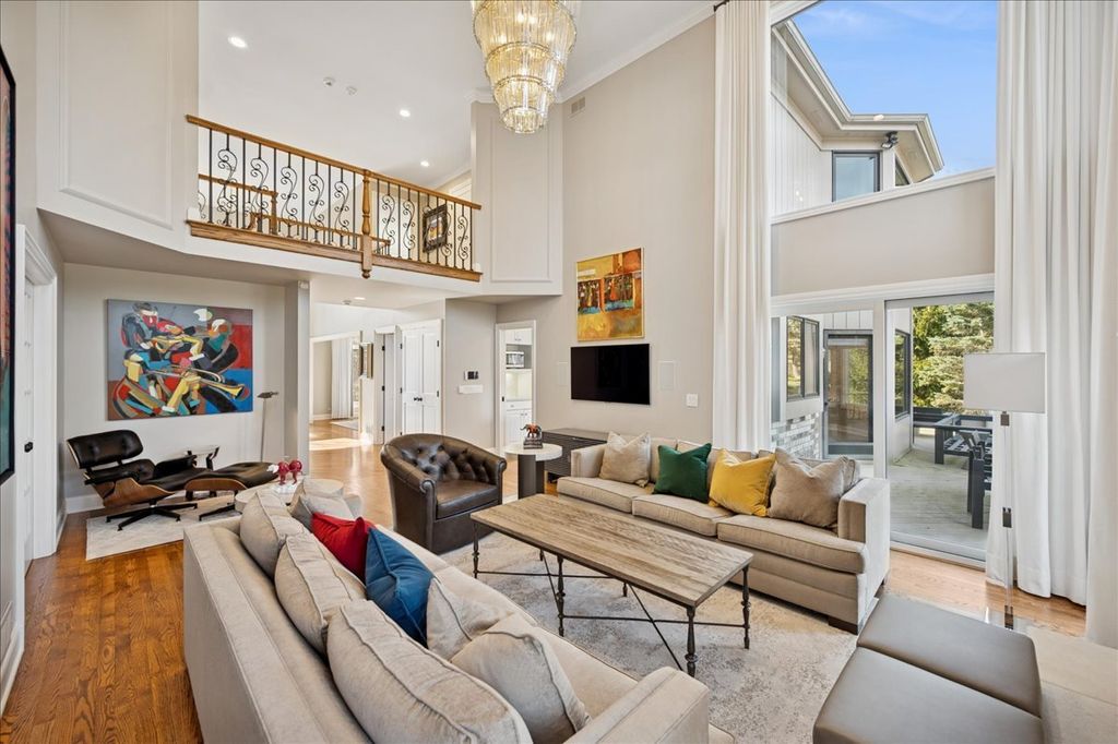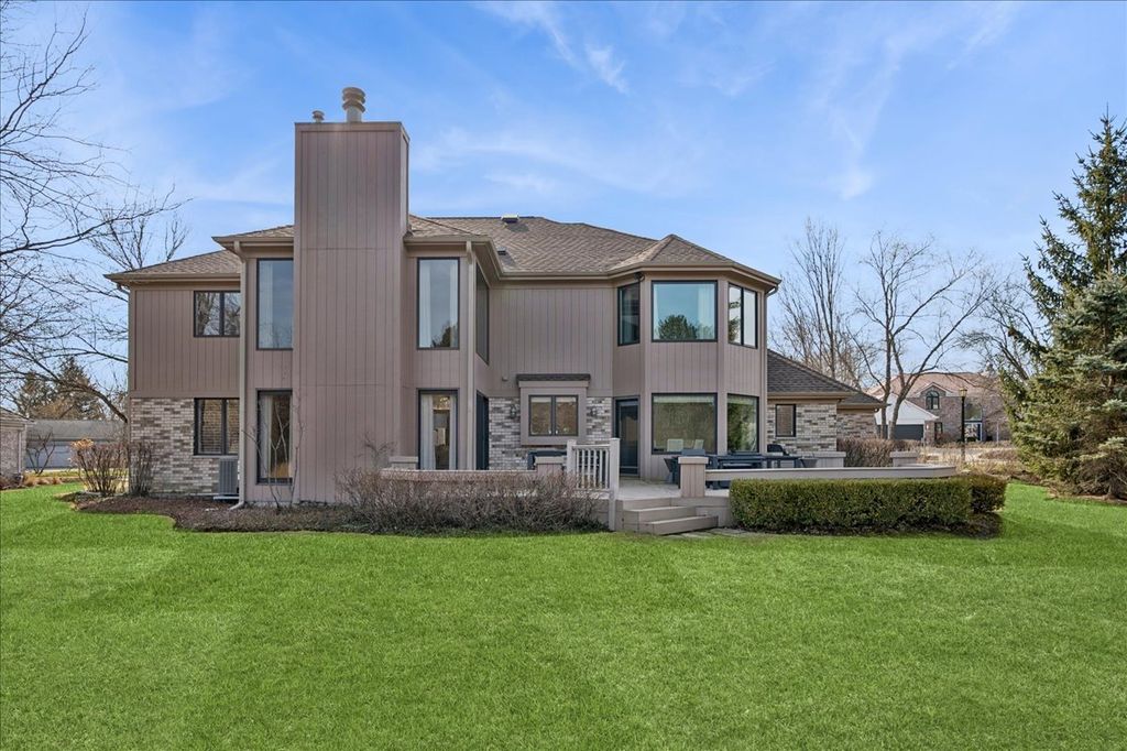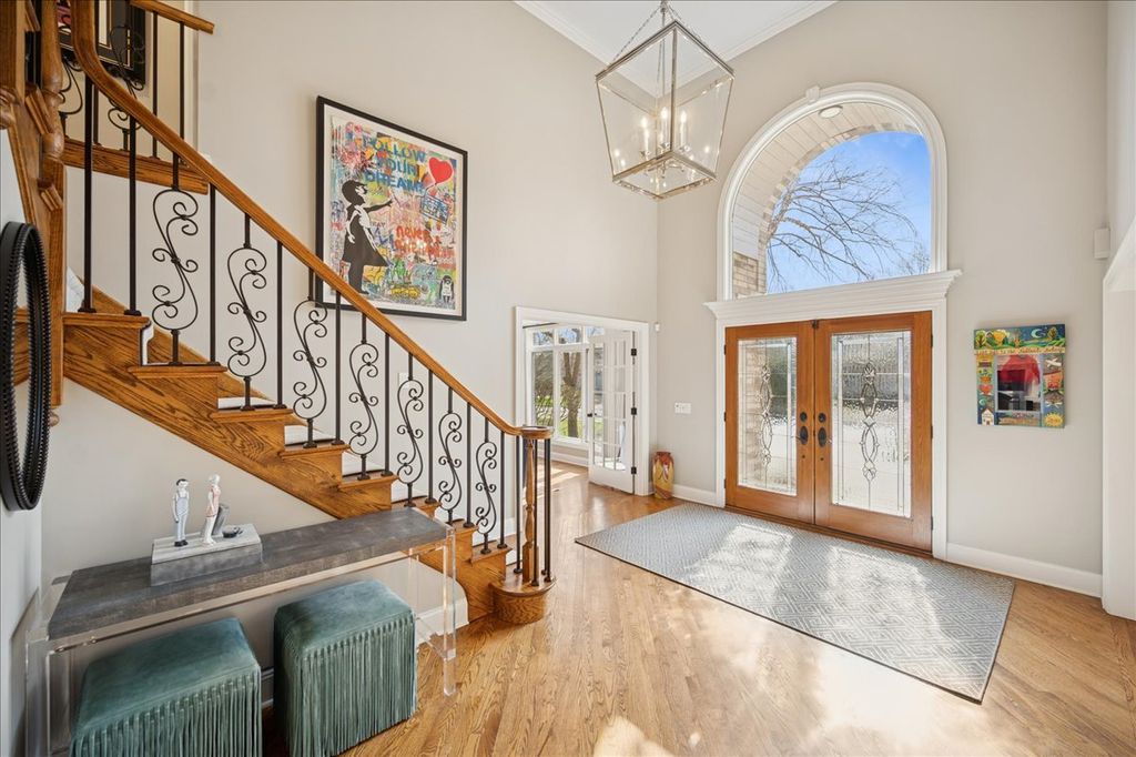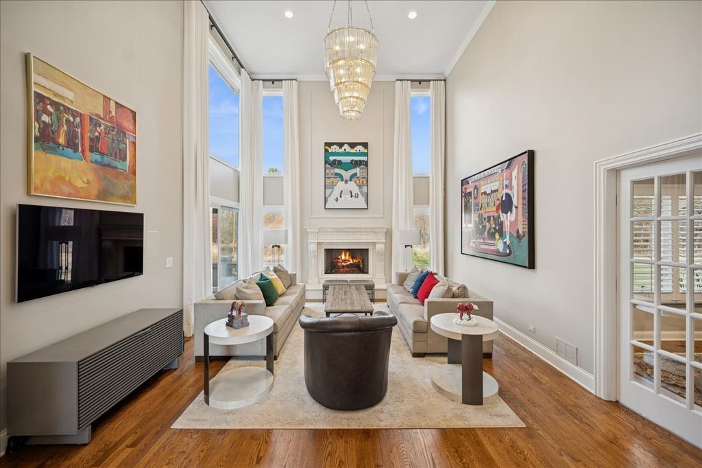 Stunning, extensively renovated 5-bedroom, 4.1-bath home in the coveted Hybernia community of Highland Park, offering serene pond views and maintenance-free living. A dramatic two-story foyer welcomes you into light-filled interiors featuring soaring ceilings, rich hardwood floors, crown molding, and a limestone fireplace in the breathtaking living room with floor-to-ceiling windows. The gourmet eat-in kitchen showcases custom cabinetry, quartzite countertops, walk-in and butler's pantries, and high-end appliances including a 48" Sub-Zero refrigerator, double ovens, and 5-burner cooktop. Gather in the breakfast area overlooking the water, host holidays in the formal dining room, or unwind in the adjacent living room with 17 foot ceilings - the flow is seamless and inviting. Flexible floor plan includes a first-floor bedroom with full bath offering ideal flexibility for guests or multigenerational living. The main floor also features a private office with custom built-ins for an inspiring work-from-home retreat, a cozy family room (or den) for watching TV, elegant dining room, updated laundry room, and a powder room. The luxurious primary suite offers a sitting area with water views and a spa-inspired bath with quartzite counters and heated travertine floors. Two bedrooms share a Jack-and-Jill bath, while the fourth upstairs bedroom features an en-suite bathroom. Extensive upgrades include newer roof, R-49 attic insulation, renovated baths, LED lighting, new lighting fixtures and window treatments, dual-zoned HVAC, new electronic shades in kitchen, living room and primary bedroom, and a whole-house generator. Enjoy outdoor living on the composite deck with built-in seating and speakers, brick paver patio, and oversized circular driveway. 3-car attached garage. HOA provides white-glove landscaping and snow removal allowing for truly maintenance-free luxury living. Ideally located near top-rated schools with the option of Highland Park High School or Deerfield High School. Impeccably maintained, turnkey, and move-in ready private retreat.