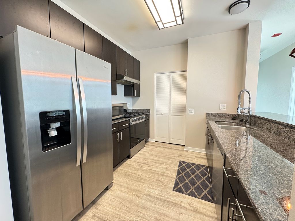 This stunning unit features floor-to-ceiling windows with breathtaking south and east city views, flooding the space with natural light. Enjoy vinyl flooring throughout and a large covered balcony-perfect for grilling and entertaining while taking in the skyline. The kitchen offers newer stainless steel appliances, granite countertops, a breakfast bar, and a pantry. The spacious primary suite includes a walk-in closet and a large en-suite bath with dual sinks and a soaking tub. Recent updates include interior paint (2026), vinyl flooring throughout (2019), bathroom vanities (2019), and kitchen appliances (2019). Two parking spaces included! Building amenities feature a 24-hour door staff. Fantastic location-just 0.1 mile to the Brown Line and 0.4 mile to the Red Line, with the Chicago Avenue bus just steps away. Close to top restaurants, shopping, and nightlife. No rental cap-ideal for both investors and owner-occupants. Schedule your showing today!