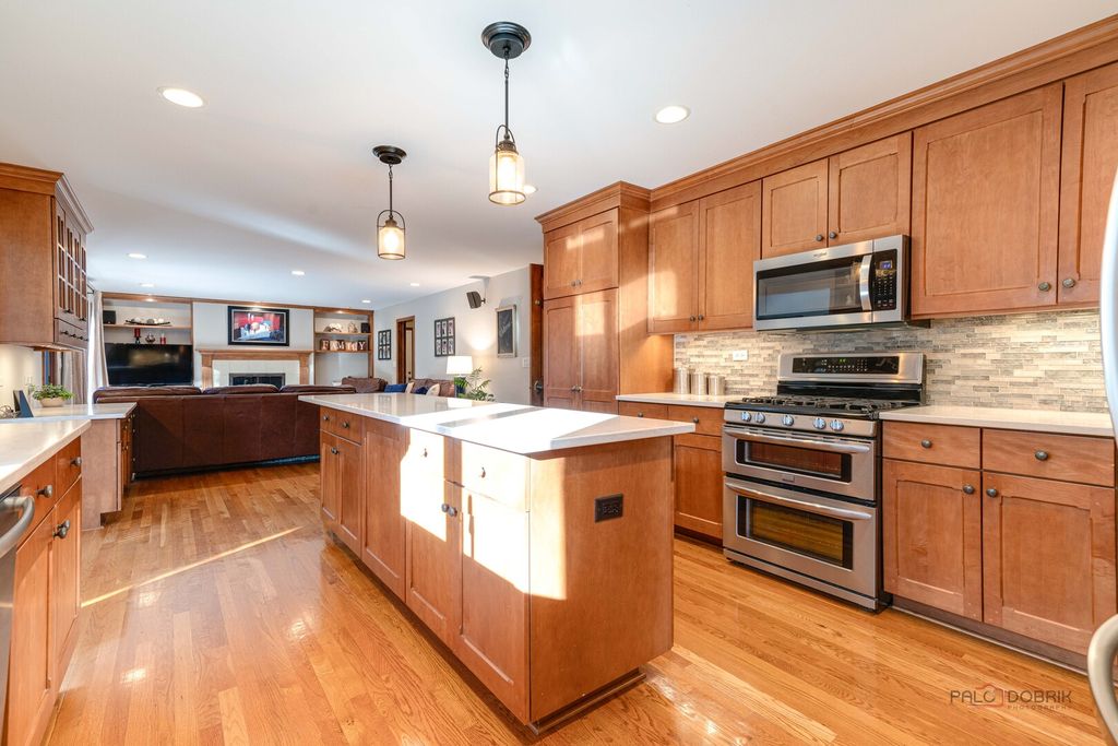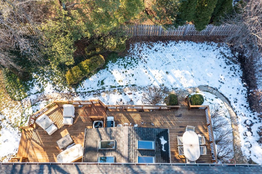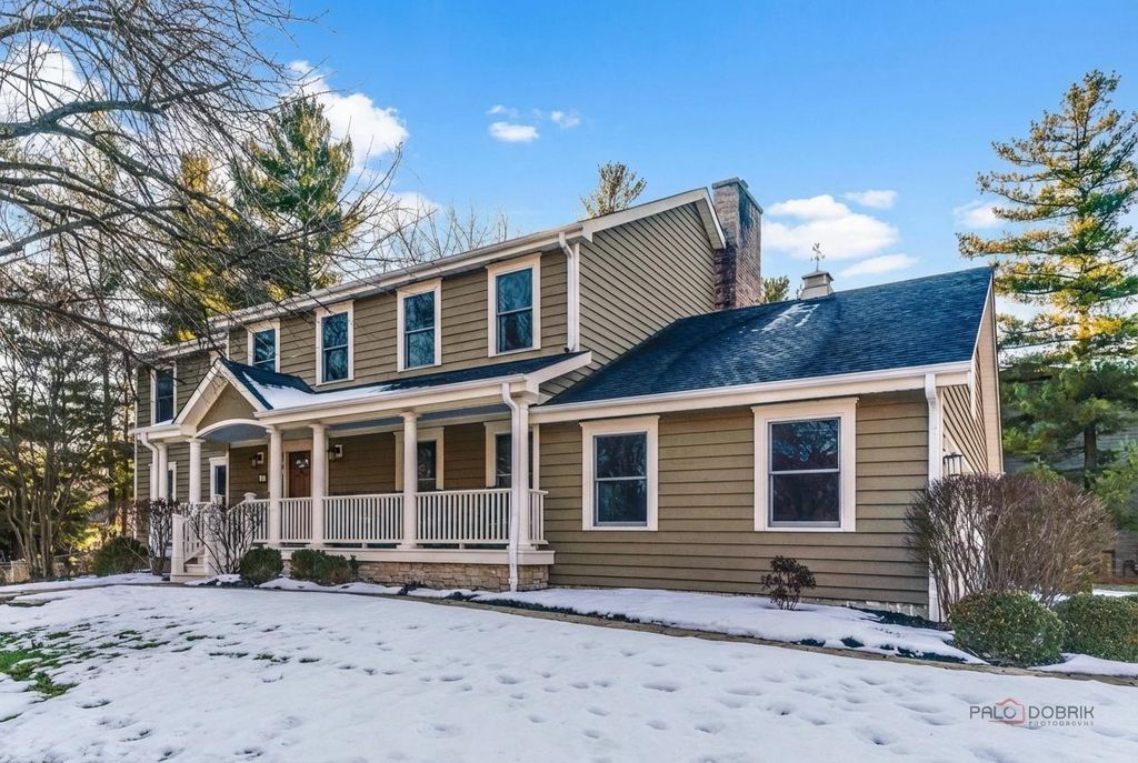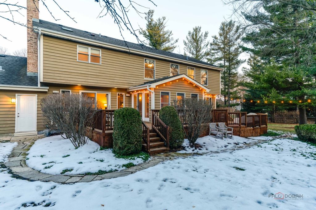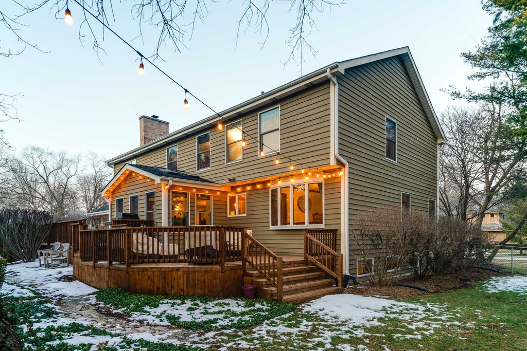 MINUTES TO LAKE MINEAR WITH SCENIC WALKING AND BIKE TRAILS! Impressive 6 bedroom, 4 full bath home on almost a half-acre lot, featuring a finished basement with wet bar, bright sunroom, and fenced backyard, all in a prime Libertyville location near downtown amenities and top-rated schools. The welcoming front porch sets the tone for the peaceful surroundings and offers a perfect place to enjoy morning coffee or unwind at the end of the day. Inside, guests are greeted by a warm foyer and beautifully maintained hardwood flooring that flows throughout the main level, creating a seamless and sophisticated feel. The sun-filled living room and formal dining room offer an ideal layout for both entertaining and everyday living. French doors provide privacy for gatherings, while large windows fill the space with natural light. The eat-in kitchen is the heart of the home, showcasing custom cabinetry with crowned uppers and under-cabinet lighting, quartz countertops, a chic tile backsplash, and stainless steel appliances including an LG refrigerator (2021), Whirlpool microwave (2021), KitchenAid double oven, and Bosch dishwasher. An extra-long center island with breakfast bar seating offers ample prep space or a place to gather for a quick bite, and a built-in planner's desk keeps everything organized. Just beyond, the bright heated sunroom overlooks the beautifully landscaped, fenced backyard with mature trees and provides easy access to the expansive deck, creating effortless indoor-outdoor living that is ideal for entertaining. The family room is the perfect retreat to unwind after a long day, featuring a warm gas fireplace with a raised hearth, flanked by built-ins that combine style with storage, and immersive surround sound speakers, offering an ideal space to curl up with a book, enjoy movie nights, or simply relax in comfort. This level also includes a first-floor office great for working remotely, a laundry room, and a full bath. Upstairs, the expansive primary suite features cathedral ceilings, a large walk-in closet with custom organizers, and a spa-inspired bath with dual vanities, whirlpool tub, and separate shower. Four additional generously sized bedrooms with ample closet space and a centrally located full bath complete the second level, accommodating family or guests. The finished basement extends your living space with a large recreation room, wet bar, game area, additional bedroom, and full bath-ideal for guests, entertaining, or creating a media room, home gym, or private retreat. A three-car attached garage and storage shed provide exceptional storage. Located just minutes from Adler Park, the pool, Adler School, boutique shopping, dining, the farmers market, and Metra access. This is a must see!
