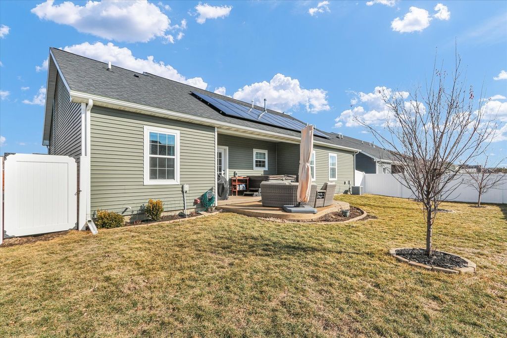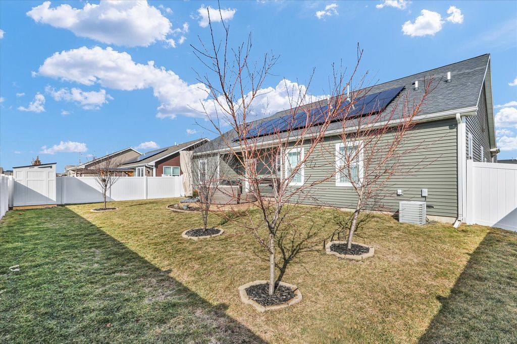 Why start from scratch when you can move right into a 2020-built ranch designed for comfort and savings? This thoughtfully upgraded home offers a fully paid-off solar system (2021) for lower energy costs, plus a 220V EV-ready garage charging station - ideal for today's smart homeowner. The bright, open-concept layout features granite countertops, durable wood laminate flooring, and stylish cultured marble bathrooms with bidet-ready outlets. The spacious primary suite includes a double vanity, walk-in shower, and a custom IKEA closet system to keep everything organized. Step outside to a beautifully landscaped backyard with fruit trees and a stamped concrete patio - perfect for relaxing evenings in your private hot tub or easy entertaining without high maintenance. Smart home-ready and conveniently located near parks, shopping, dining, and campus - this home offers modern living with long-term savings and minimal upkeep. Just move in and enjoy!