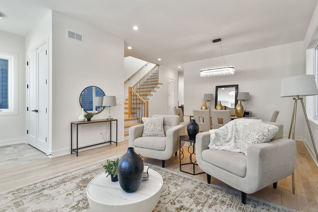 Last home available at Serene4 in beautiful Peterson Park! Impeccable new construction single-family home by expert builder on a 30' lot. Great curb appeal with wood grain board and batten facade highlighted by stone, Hardie board siding, black windows, and a modern front entry door. Spacious floor plan with 5 bedrooms and 3.1 baths. Combined living/dining room features large windows offering ample natural light and gas fireplace with floor to ceiling surround. Beautiful oak hardwood flooring throughout main and upper level. Chef quality kitchen perfect for entertaining equipped with professional Thermador appliances, island with bar seating, custom cabinetry, quartz counters, large pantry, and breakfast area. Adjoining family room with custom media center, coffered ceiling, and large windows overlooking the backyard. Rear mudroom with built-in bench. Spacious primary bedroom includes two walk-in closets with custom organizers, and spa like ensuite bath with freestanding soaking tub, frameless glass shower, dual vanities, toilet room, and heated flooring. Three additional bedrooms, guest bath with tub, dual sinks, and heated flooring, and laundry room with sink complete the upper level. Finished basement with radiant heated flooring throughout includes recreation room with wet bar featuring beverage center, 5th bedroom, full bath, second laundry hook-up, storage space, and mechanicals. Every detail has been considered; high end fixtures and finishes, statement lighting, 8' doors, custom ceiling details, pre-wiring for speakers and security cameras, built-out closets and pantry, skylights, and much more. Fully enclosed yard with security intercom + rear stamped concrete patio and detached extra-wide 25' two-car garage. Located in beautiful Peterson Park close to outdoor recreation, shopping, restaurants, and conveniences + other great neighborhoods like Andersonville and Lincoln Square!