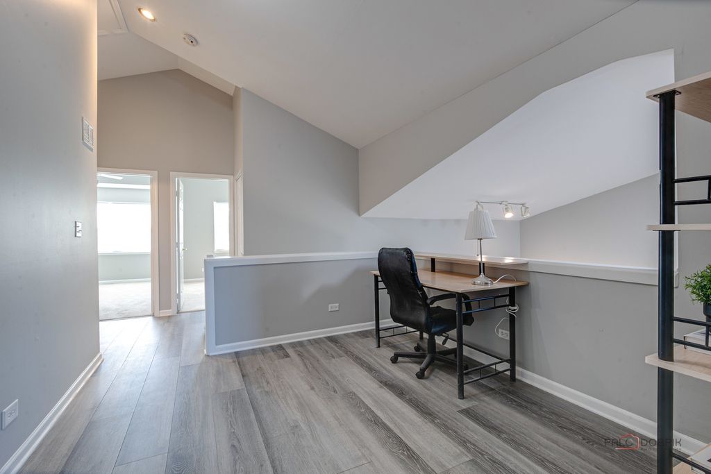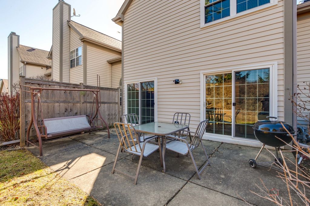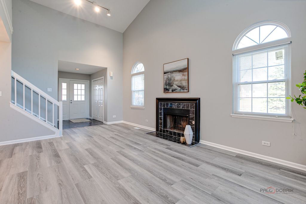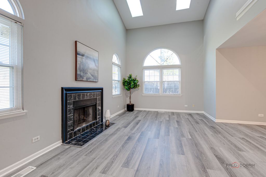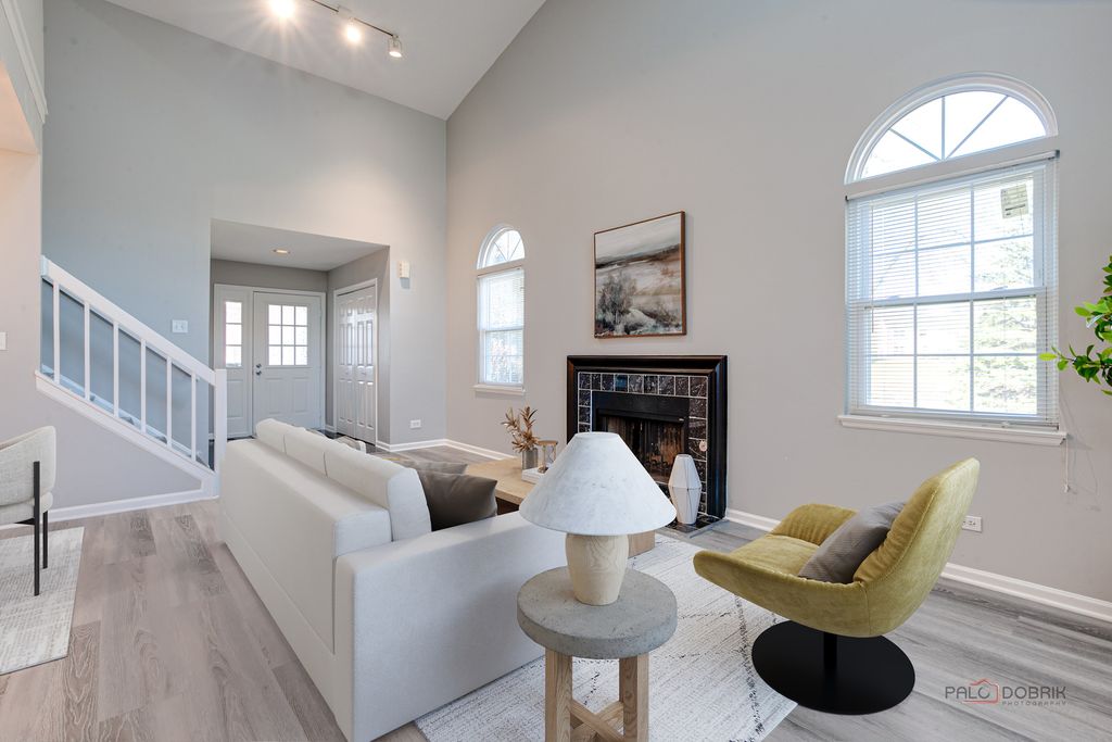 Welcome to this beautifully appointed end-unit townhome featuring 3 bedrooms and 2.1 baths, ideally located within the award-winning Stevenson High School District. Fresh 2026 paint all throughout and new luxury vinyl plank flooring on main level and on second level hallway and loft. Filled with natural light and thoughtfully designed with modern elegance, this home offers the perfect balance of comfort, style, and functionality. Step inside to a dramatic cathedral-ceiling living room highlighted by a cozy fireplace and skylight, creating a bright and inviting first impression. The open-concept dining area flows seamlessly from the living room, enhancing the spacious, airy feel-perfect for everyday living and effortless entertaining. The contemporary kitchen is appointed with sleek stainless steel appliances, a stylish tiled backsplash, granite countertops, and crisp white cabinetry that complements the home's fresh, modern aesthetic. Just beyond, the inviting family room provides direct access to a private patio-ideal for outdoor relaxation or intimate gatherings. A convenient main-level laundry room and powder room complete the first floor. Upstairs, the vaulted-ceiling primary suite serves as a serene retreat, offering two generous walk-in closets. The spa-inspired primary bath features a dual-sink vanity, soaking tub, separate shower, and skylight that fills the space with natural light-delivering both comfort and luxury. Two additional bedrooms, each with striking vaulted ceilings, add architectural charm and an enhanced sense of space. A full hall bath completes the second level. Additional highlights include an attached two-car garage and close proximity to the train for easy commuting. This exceptional end-unit townhome truly showcases modern design, comfort, and beauty in every detail-an ideal place to call home.