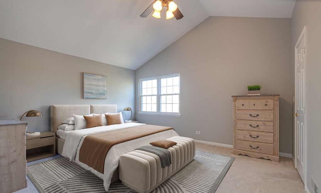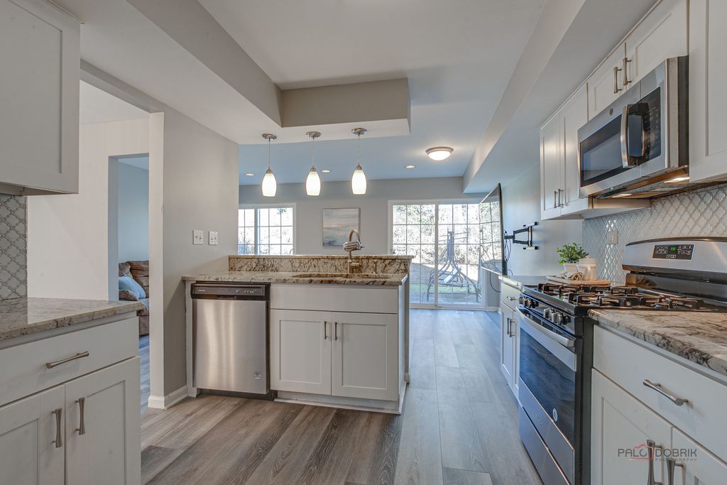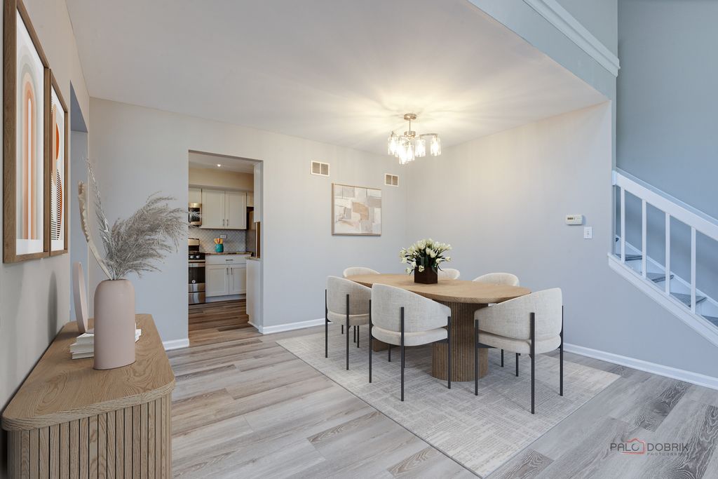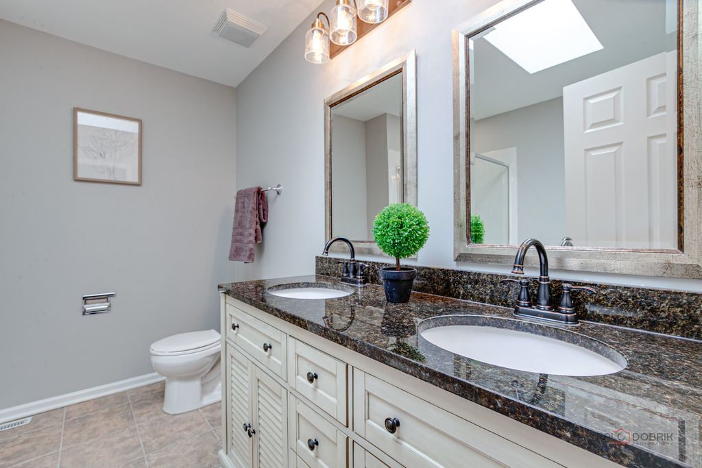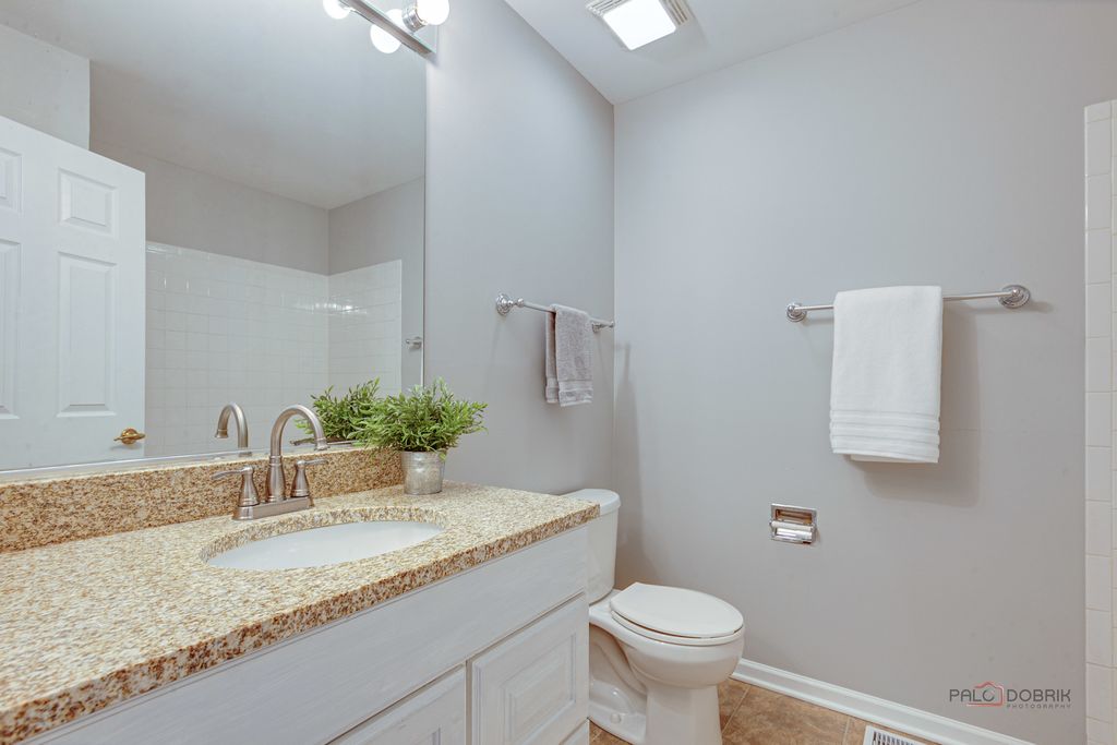 Welcome to this beautifully appointed end-unit townhome featuring 3 bedrooms and 2.1 baths, ideally located within the award-winning Stevenson High School District. Fresh 2026 paint all throughout and new luxury vinyl plank flooring on main level and on second level hallway and loft. Filled with natural light and thoughtfully designed with modern elegance, this home offers the perfect balance of comfort, style, and functionality. Step inside to a dramatic cathedral-ceiling living room highlighted by a cozy fireplace and skylight, creating a bright and inviting first impression. The open-concept dining area flows seamlessly from the living room, enhancing the spacious, airy feel-perfect for everyday living and effortless entertaining. The contemporary kitchen is appointed with sleek stainless steel appliances, a stylish tiled backsplash, granite countertops, and crisp white cabinetry that complements the home's fresh, modern aesthetic. Just beyond, the inviting family room provides direct access to a private patio-ideal for outdoor relaxation or intimate gatherings. A convenient main-level laundry room and powder room complete the first floor. Upstairs, the vaulted-ceiling primary suite serves as a serene retreat, offering two generous walk-in closets. The spa-inspired primary bath features a dual-sink vanity, soaking tub, separate shower, and skylight that fills the space with natural light-delivering both comfort and luxury. Two additional bedrooms, each with striking vaulted ceilings, add architectural charm and an enhanced sense of space. A full hall bath completes the second level. Additional highlights include an attached two-car garage and close proximity to the train for easy commuting. This exceptional end-unit townhome truly showcases modern design, comfort, and beauty in every detail-an ideal place to call home.