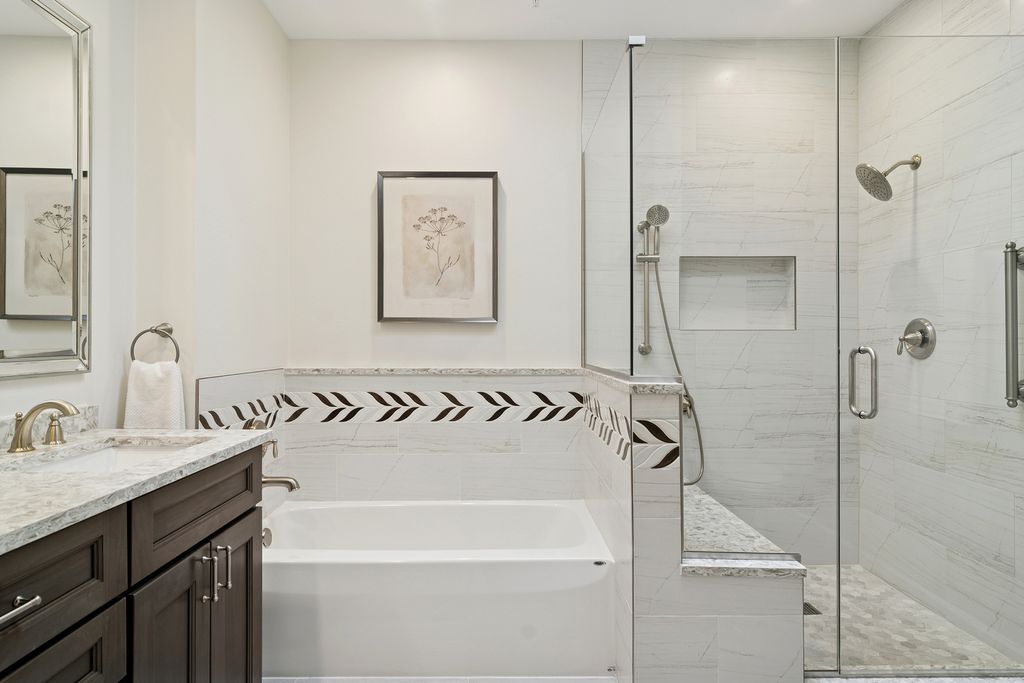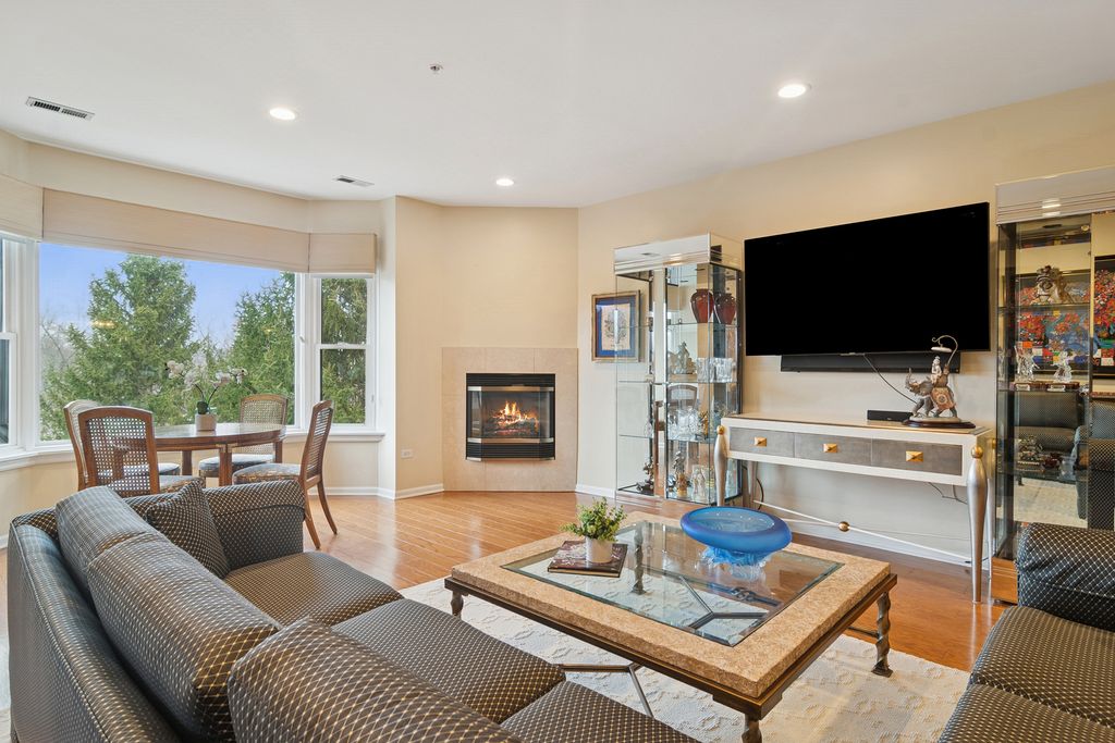 Welcome to 20 Trafalgar Square in the heart of Lincolnshire, a bright and beautifully updated top-floor condo offering an impressive 2,196 square feet of thoughtfully designed living space. This unit is ideally situated just past the elevator and features stunning wide-plank wood laminate flooring and recessed lighting throughout the main living areas, creating a warm, modern, and inviting atmosphere. A spacious dining room greets you and flows seamlessly into the expansive living room, complete with a cozy fireplace. The eat-in kitchen is both functional and inviting, featuring a large island, abundant cabinetry including glass display cabinets, double ovens, and plenty of counter space and a center island for meal prep and gatherings. Enjoy your private balcony just off the kitchen. The oversized primary suite is a true retreat, offering two walk-in closets with custom organizers. The gorgeous primary bath boasts a double vanity, luxurious separate shower with bench seating, and a soaking tub. A spacious second bedroom also features a large walk-in closet, while the hallway bath includes an extra-long vanity and shower, providing both style and functionality. Additional highlights include an in-unit laundry room, storage area on the same floor, two garage parking spaces in the heated garage, a fitness room, and a community room for residents to enjoy. Located near shopping, dining, and easy highway access within the sought-after Stevenson High School and District 103 elementary and middle schools. This exceptional condo offers space, comfort, and convenience all in one.