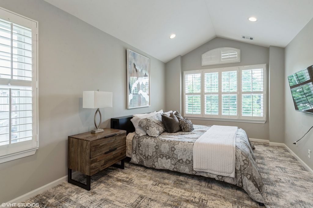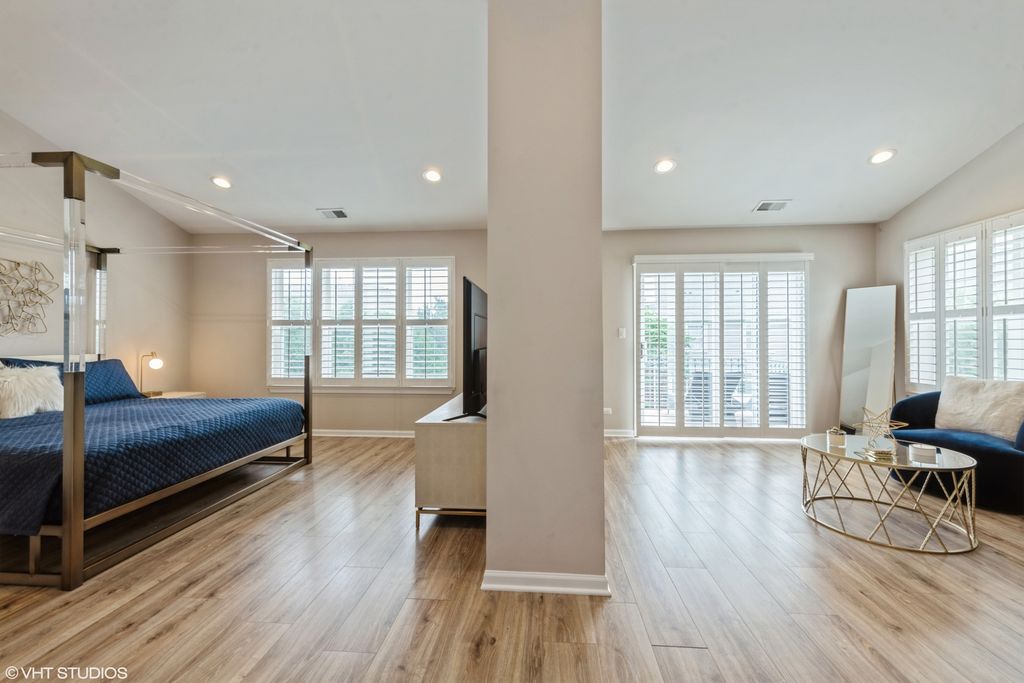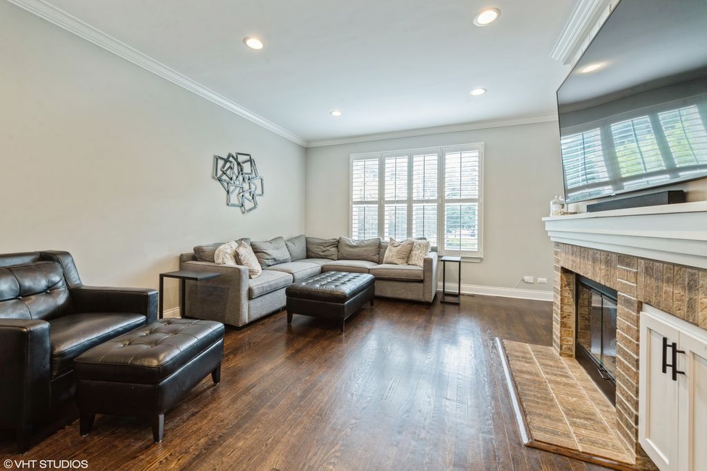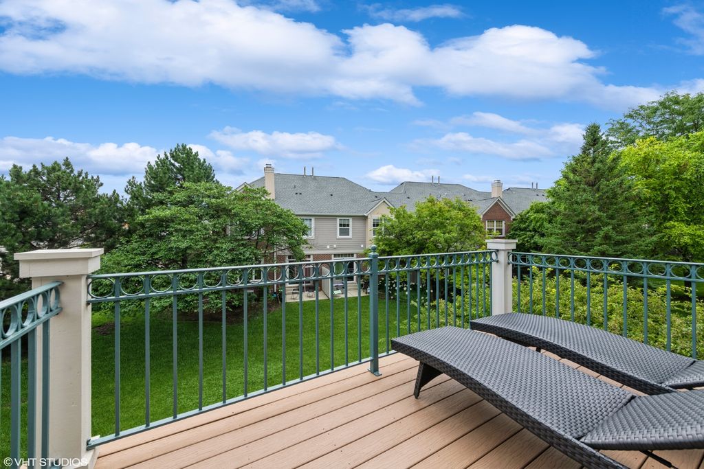 Tucked into one of the best locations in Vernon Hills, this sun-drenched end-unit truly stands out. With over 2,100 square feet plus a beautifully finished basement, the space feels open, warm, and thoughtfully designed from the moment you walk in. Large windows flood the home with natural light, highlighting walnut hardwood floors, crown molding, and refined details throughout. The living room centers around a classic brick fireplace, while the dining space glows nearby. The kitchen is generous and inviting, with 42" cabinetry, granite countertops, stainless steel appliances, and a breakfast area that opens to a private patio overlooking lush green space. Upstairs, the vaulted primary suite feels like a retreat, complete with a sitting area, walk-in closet, spa-like bath, and a private balcony perfect for a quiet morning coffee. Additional vaulted bedrooms offer flexibility for guests, family, or work-from-home needs. The finished basement adds even more living space with a family room, fourth bedroom, and full bath. Private, polished, and perfectly positioned, this is one you need to experience in person. Welcome home!