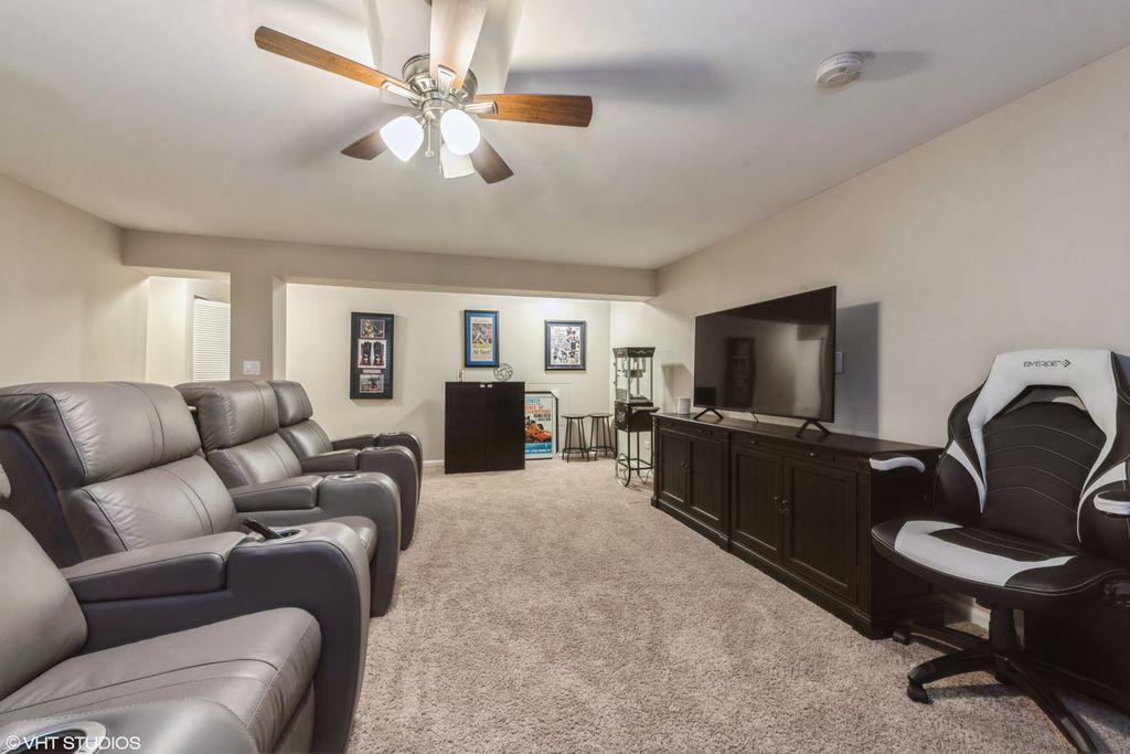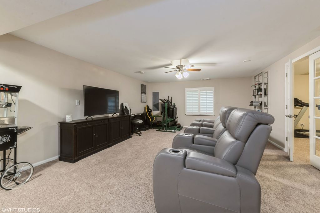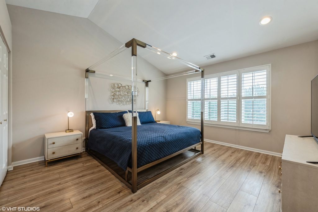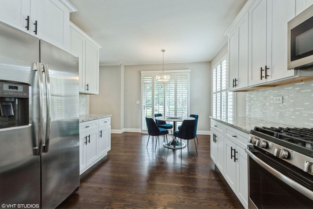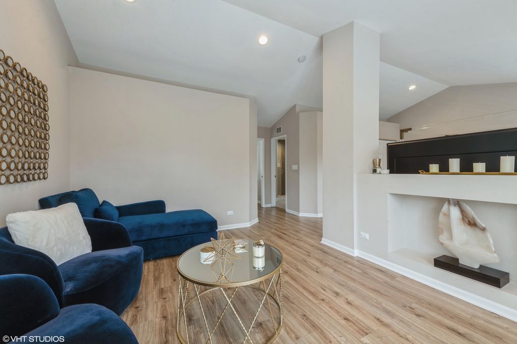 Tucked into one of the best locations in Vernon Hills, this sun-drenched end-unit truly stands out. With over 2,100 square feet plus a beautifully finished basement, the space feels open, warm, and thoughtfully designed from the moment you walk in. Large windows flood the home with natural light, highlighting walnut hardwood floors, crown molding, and refined details throughout. The living room centers around a classic brick fireplace, while the dining space glows nearby. The kitchen is generous and inviting, with 42" cabinetry, granite countertops, stainless steel appliances, and a breakfast area that opens to a private patio overlooking lush green space. Upstairs, the vaulted primary suite feels like a retreat, complete with a sitting area, walk-in closet, spa-like bath, and a private balcony perfect for a quiet morning coffee. Additional vaulted bedrooms offer flexibility for guests, family, or work-from-home needs. The finished basement adds even more living space with a family room, fourth bedroom, and full bath. Private, polished, and perfectly positioned, this is one you need to experience in person. Welcome home!