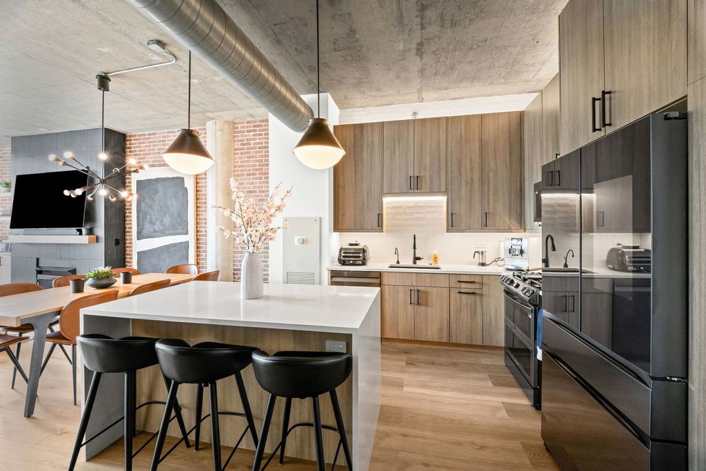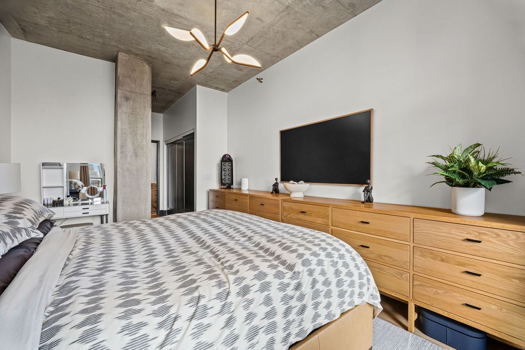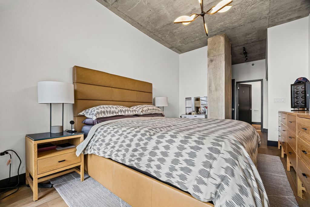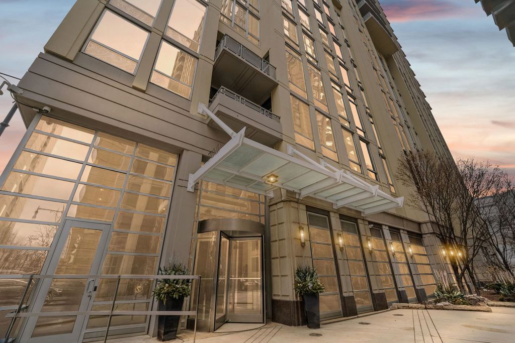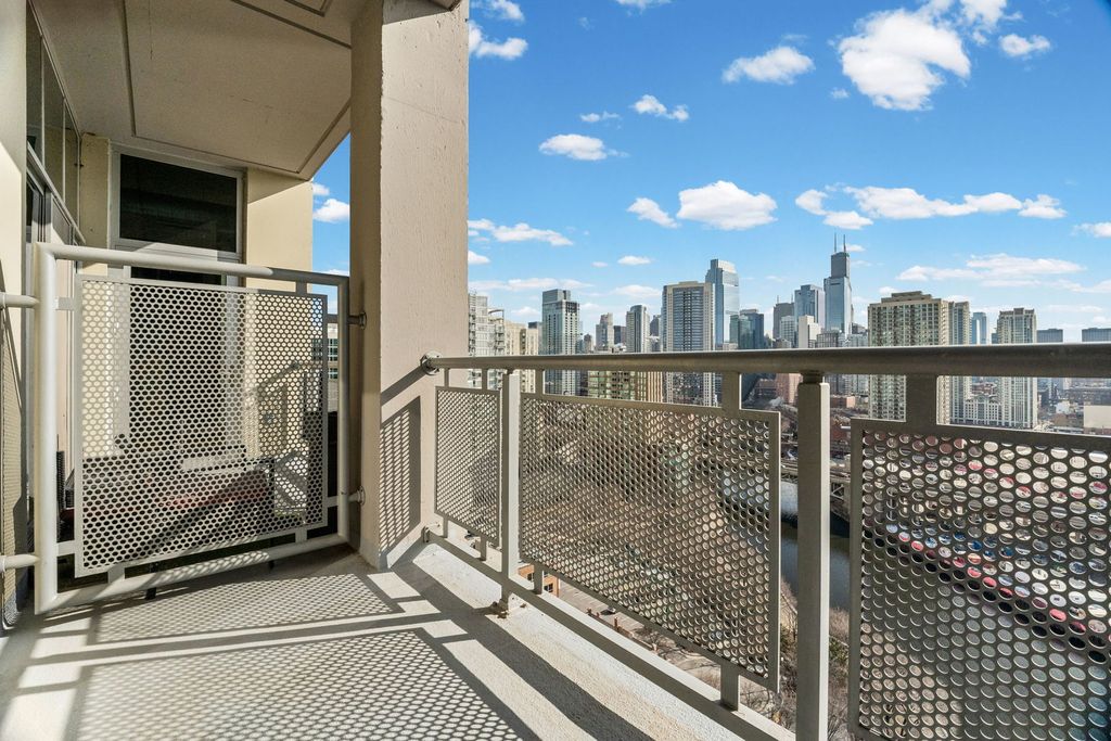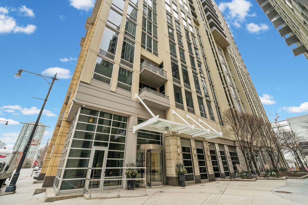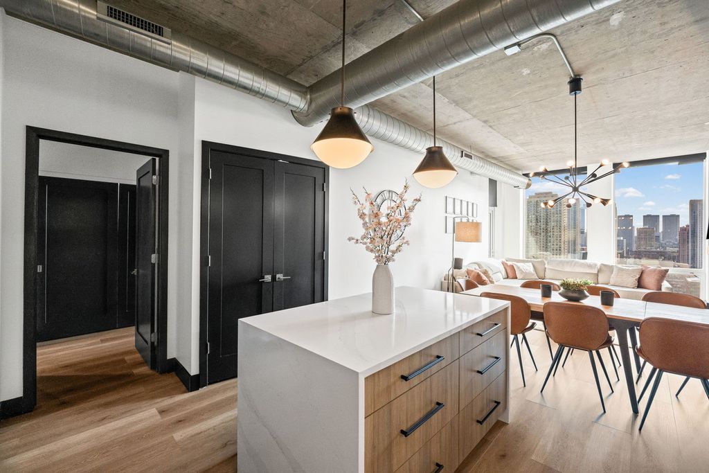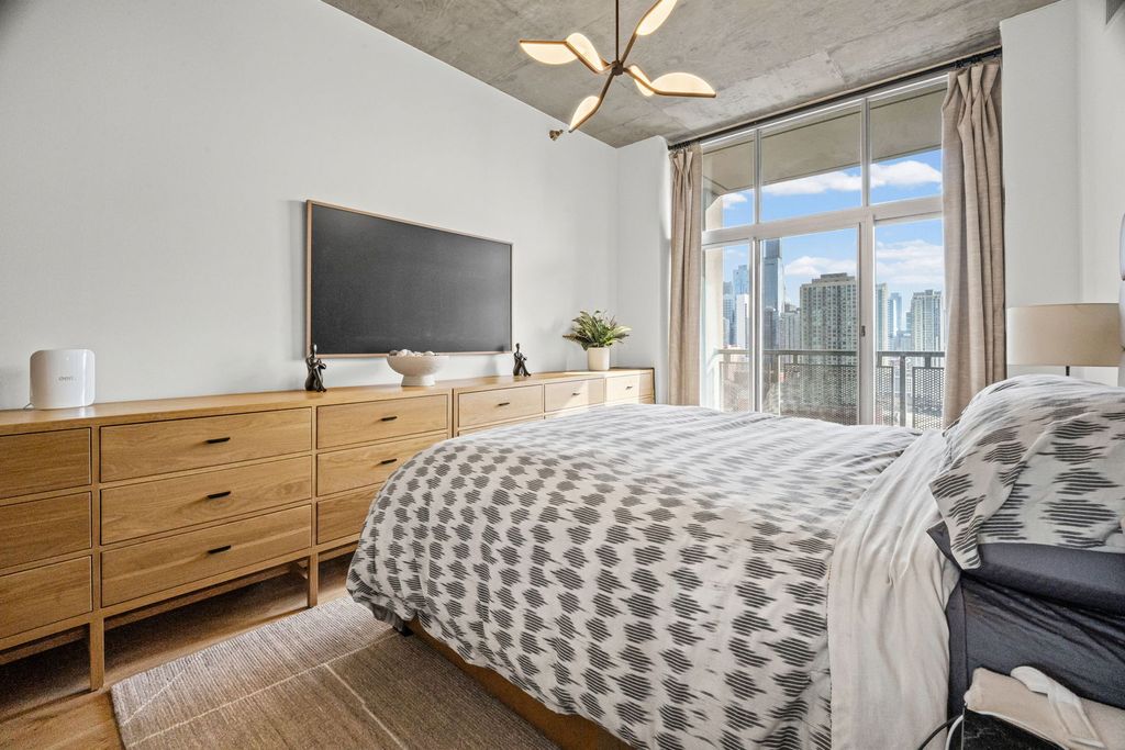 Absolutely gorgeous Interior Designed condo in the heart of River North. No expense has been spared in selecting the finishes that define this space, beginning with a stunning custom kitchen featuring a dramatic quartz waterfall island, imported custom cabinetry, and brand-new high end connected Samsung appliances. Thoughtful design and elevated craftsmanship are evident throughout. A welcoming foyer leads past a spacious, fully enclosed second bedroom with generous closet space - ideal for guests, a home office, or both. The expansive dining area flows seamlessly from the kitchen, creating the perfect setting for entertaining. The primary suite is a true retreat, offering abundant closet space and a beautifully appointed spa-inspired bath with dual vanities and over the top high-end fixtures. Step directly onto the private patio - accessible from both the living area and primary suite - and enjoy tranquil river views and the vibrant city skyline. Residents enjoy full-service amenities including 24-hour door staff, on-site management, and a well-equipped fitness center just off the lobby. Ideally located just steps from Erie Cafe, Starbucks, the Riverwalk, and multiple parks - including one directly adjacent to the building. Garage parking is included in the price.