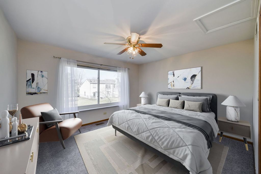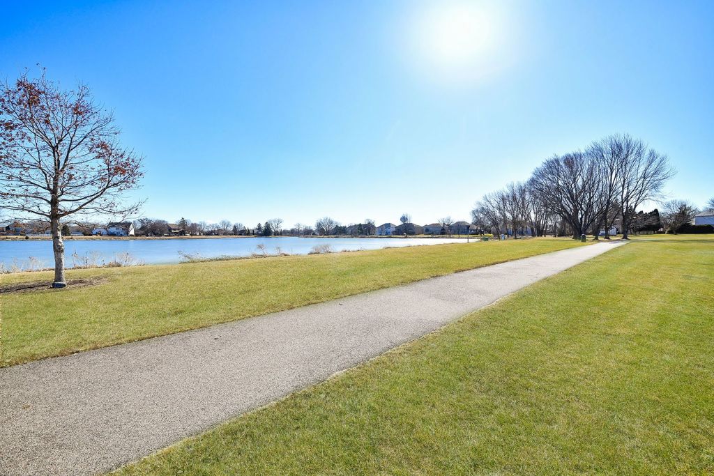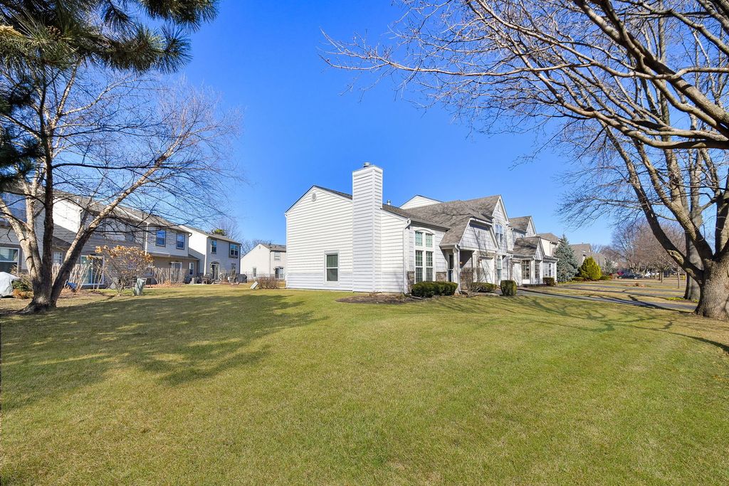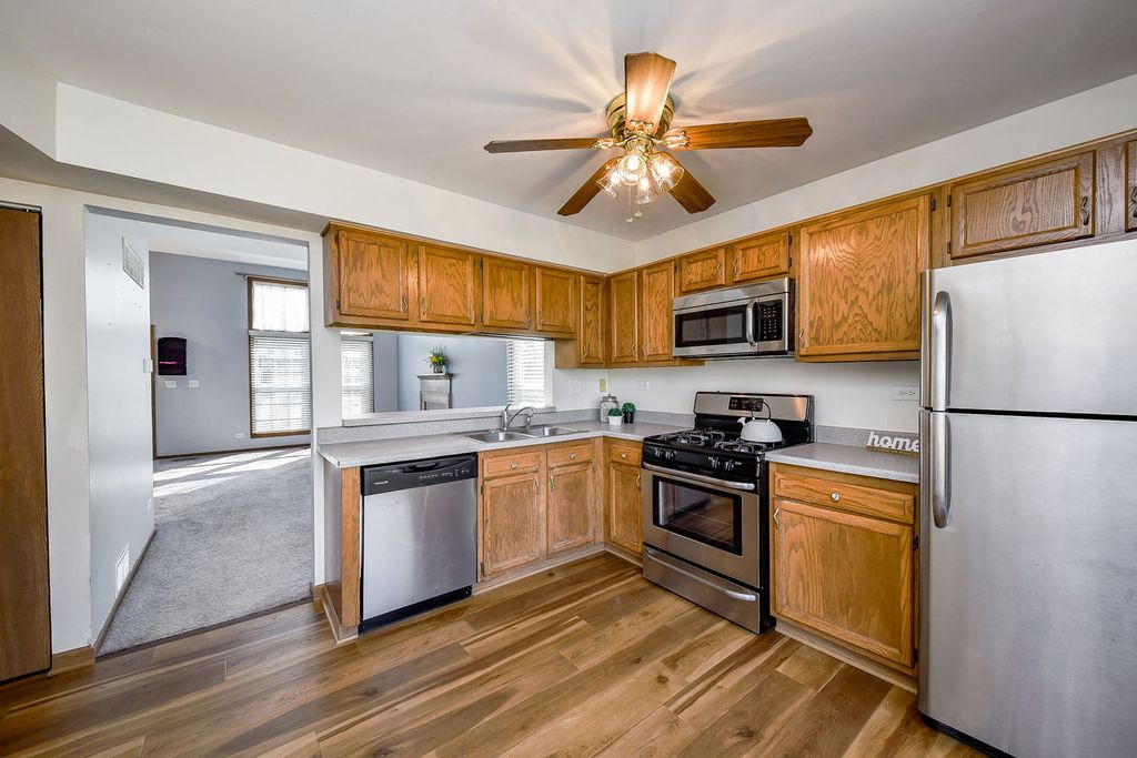Welcome to your Home Sweet Home! This bright and airy 2-bedroom + Loft, 2 full bath end-unit townhome offers the perfect blend of comfort, style, and location. From the moment you arrive, the attractive stone facade and warm, earthy color palette create inviting curb appeal. Nestled on a spacious lot with expansive side yard and surrounding green space, this home offers privacy and room to breathe. Just steps away, you'll find a charming neighborhood park complete with a pavilion, scenic pond, and walking/bike trails-perfect for enjoying the warmer days ahead. Inside, you're welcomed by an open concept floor plan featuring soaring cathedral ceilings and a striking open staircase to the second level. The light filled living room is ideal for both everyday living and entertaining, seamlessly flowing into the dining area and highlighted by a cozy gas fireplace perfect for those relaxing movie nights. The well-appointed kitchen is designed for both functionality and style, offering ample cabinetry & counter space, stainless steel appliances, a pantry, and beautiful new hardwood floors. A new sliding glass patio door provides backyard views and easy access to outdoor living. The main level features a spacious bedroom and full bath-ideal for guests or flexible living-along with a convenient laundry room offering additional storage. Upstairs, the private primary suite showcases fresh paint, a large walk-in closet, and direct access to the full bath. The bathroom is a true retreat with an oversized soaking tub, expansive vanity, and skylight that fills the space with natural light. The generous size loft area provides endless possibilities and can easily be converted to a third bedroom, home office, or guest space. Additional highlights include direct access to the attached one car garage with storage space, a peaceful back patio perfect for morning coffee or summer grilling, and a quiet atmosphere you'll love coming home to. Recent improvements to provide peace of mind; New Hardwood Flooring 2025, front door, Roof in 2025, Furnace & AC in 2023, Patio Door 2023, Stackable washer/dryer in 2022. Ideally located just minutes from expressways, shopping, dining, and everyday conveniences, this move-in-ready townhome truly has it all. Don't miss your opportunity, schedule your showing today and make this exceptional home yours!