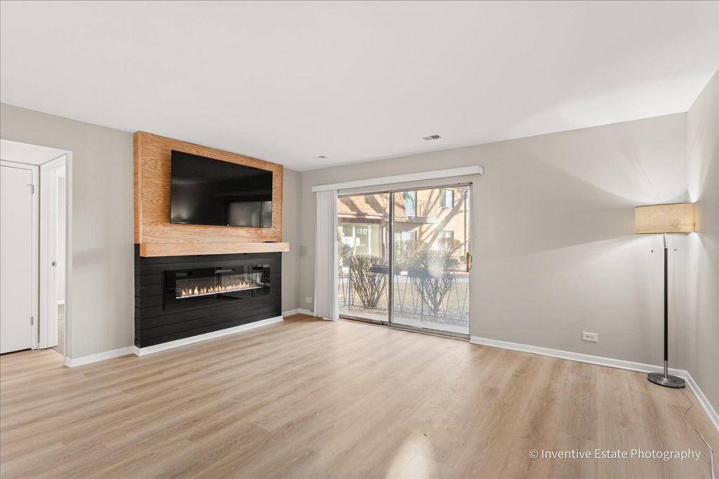 Freshly updated 2-bedroom, 1-bath condo offering modern style and move-in ready convenience! This beautifully refreshed home features fresh paint throughout, brand-new flooring, and updated lighting that creates a bright, contemporary feel. The kitchen shines with sleek quartz countertops and new stainless steel appliances, perfect for everyday living and entertaining. A custom entertainment wall serves as the show-stopping focal point of the living space, complete with a big screen TV and an electric multi-color fireplace for added warmth and ambiance. Spacious bedrooms, a clean modern bath, and thoughtful upgrades throughout make this condo a must-see. Perfect for first-time buyers, downsizers, or anyone seeking low-maintenance living with high-end touches!