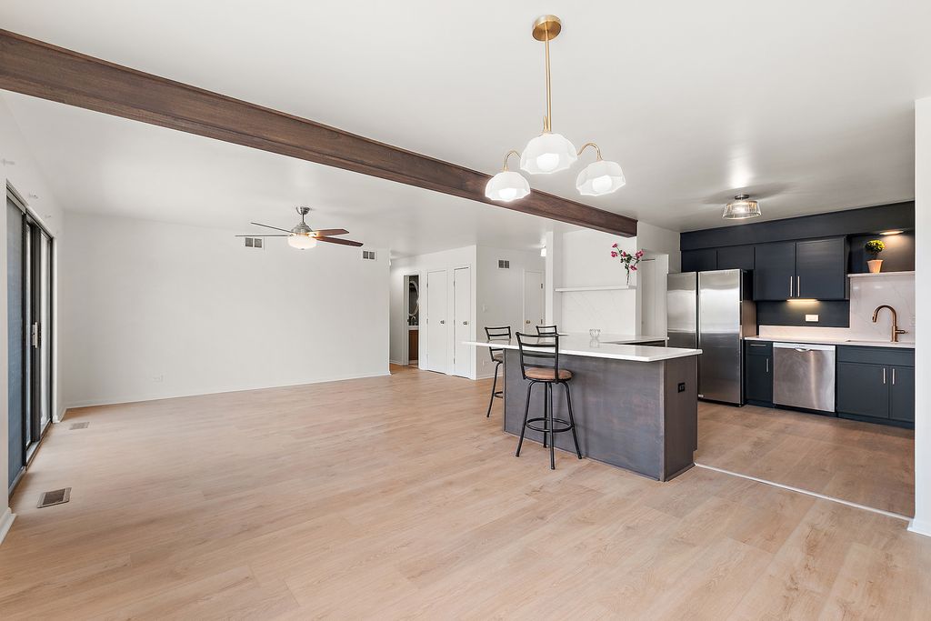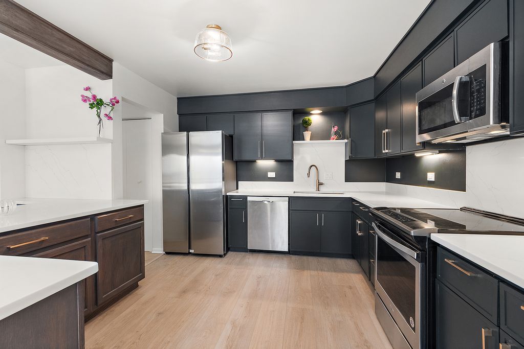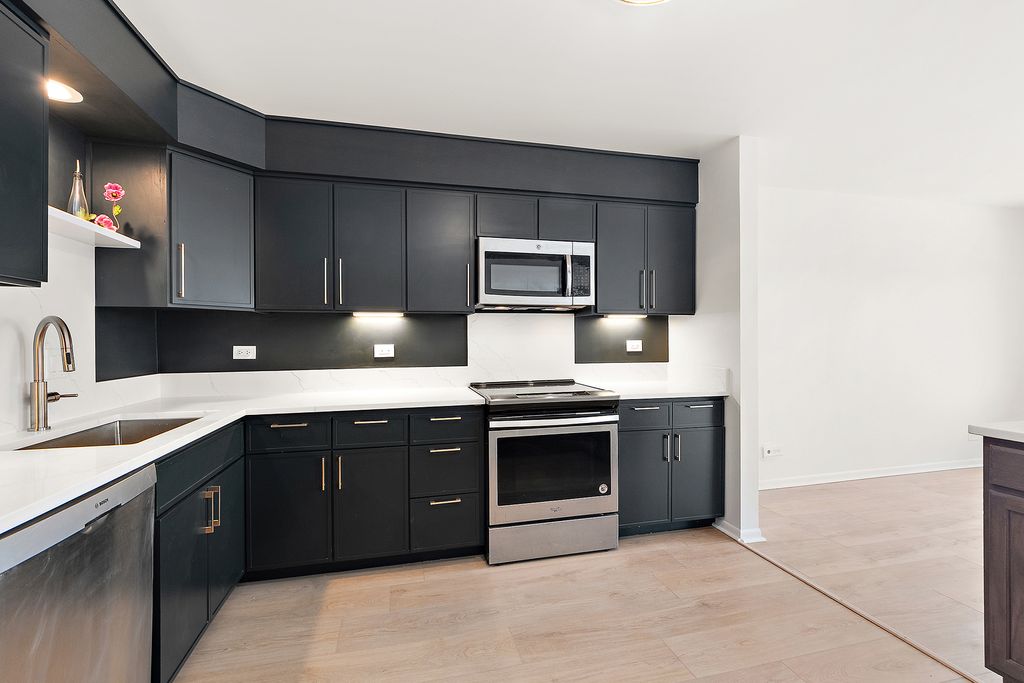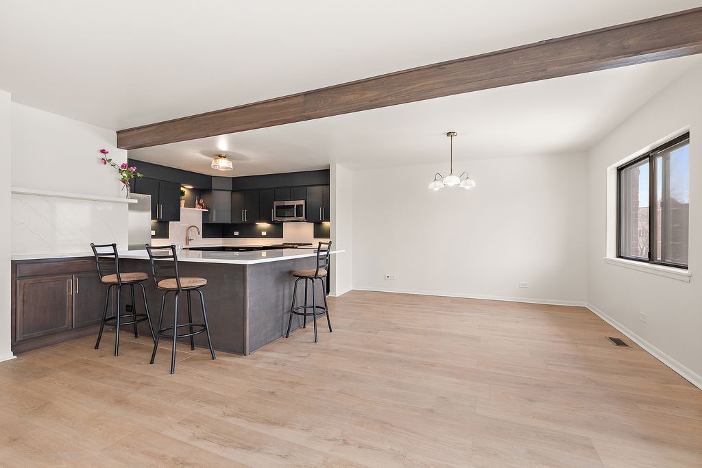 MOVE RIGHT IN to this gorgeously remodeled top-floor 2 bedroom 2 bath condo in great building! Take the elevator to the fourth floor and into the bright and airy condo! Everything has had updates - from the beautiful open kitchen, the flooring, the bathrooms, etc. Furnace new 2024! Nothing to do but move into this beautiful space. Building recently had all of the balconies replaced as well, and won a Homewood Beautification award, and the complex has an outdoor pool! This unit also comes with its own garage and storage unit.