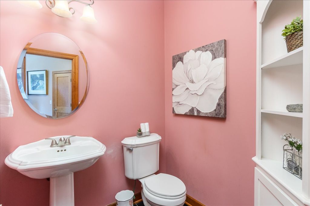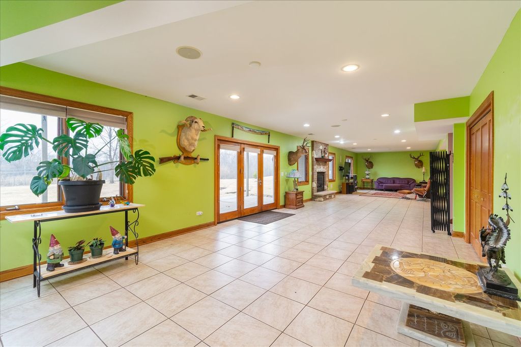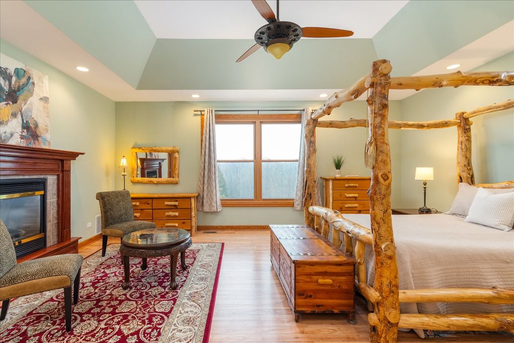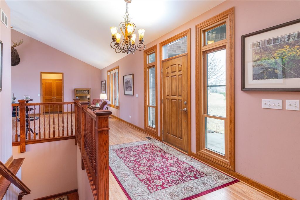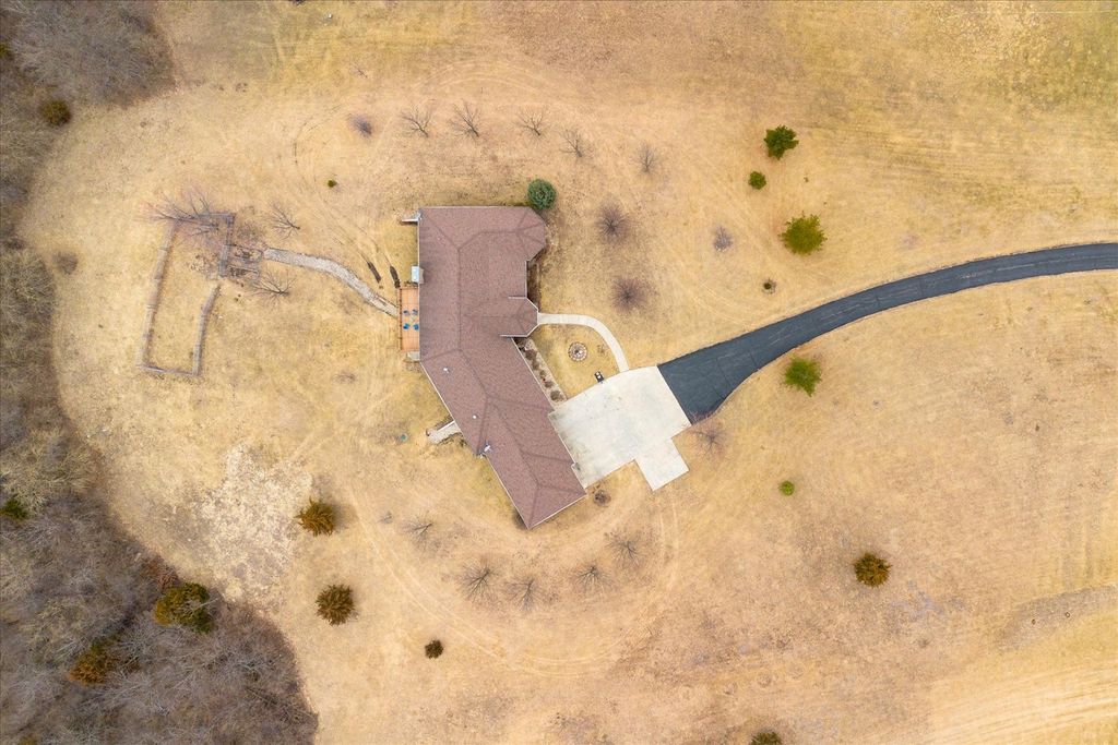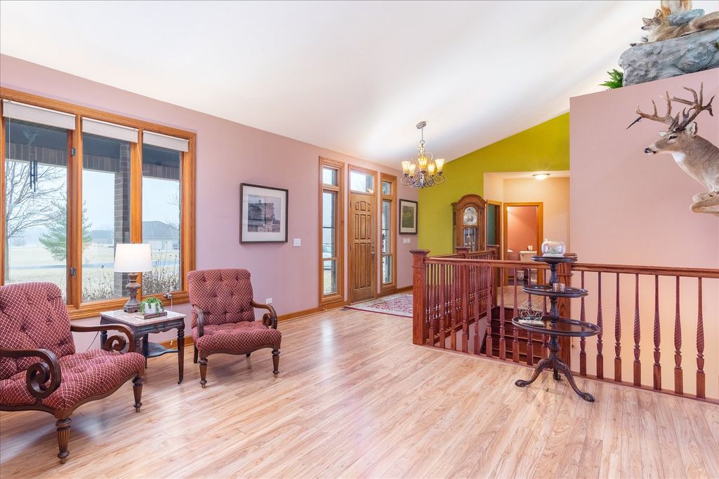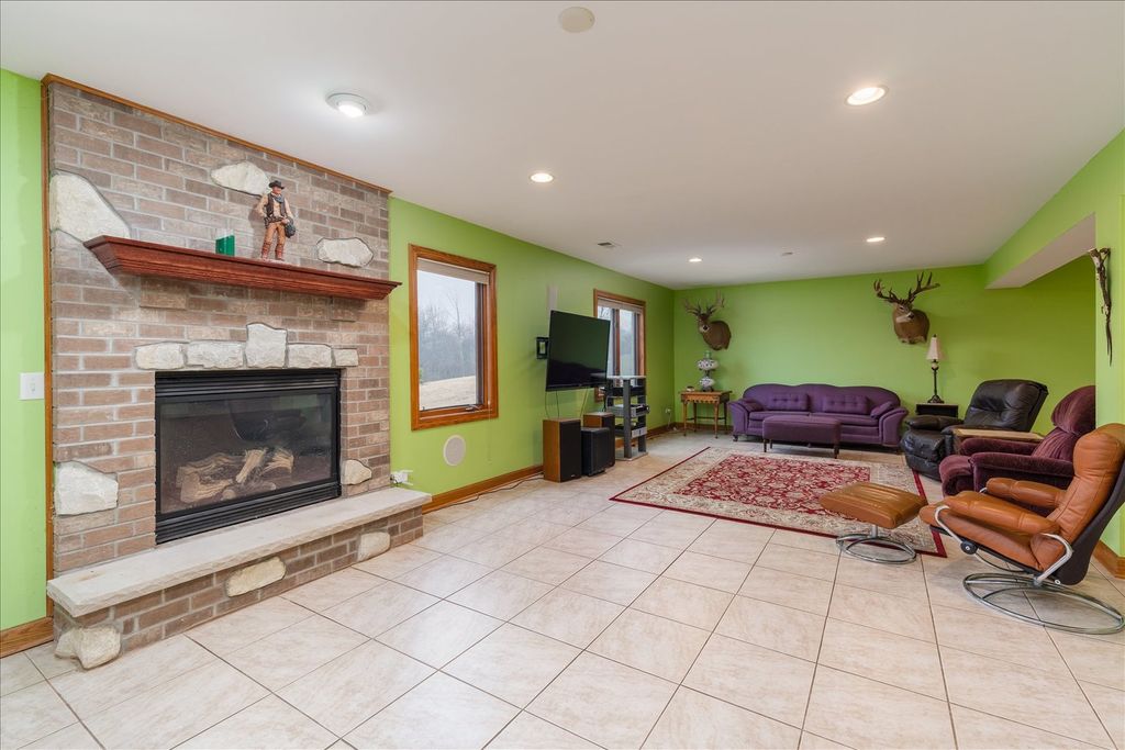 Custom-built ranch offering approximately 2,900+ square feet above grade and nearly 5000+ square feet of finished living space including the beautifully finished walkout lower level - all set on 5.67 private wooded acres backing to a ravine. The open floor plan features soaring vaulted ceilings, hardwood floors, and three gas fireplaces. The gourmet kitchen includes granite countertops, cherry cabinetry, stainless steel appliances, and a walk-in pantry. This 3-bedroom, 3 full and 1 half bath home offers oversized walk-in closets throughout and a convenient first-floor laundry with additional storage. The primary suite features a see-through fireplace shared between the bedroom and spa-inspired bath. The finished walkout basement adds substantial additional living space with a full bath, storage area, built-in storm shelter, and patio access. A deck off the main-level eating area overlooks peaceful wooded views. Located in a custom home community centered around a scenic lake with a walking path.