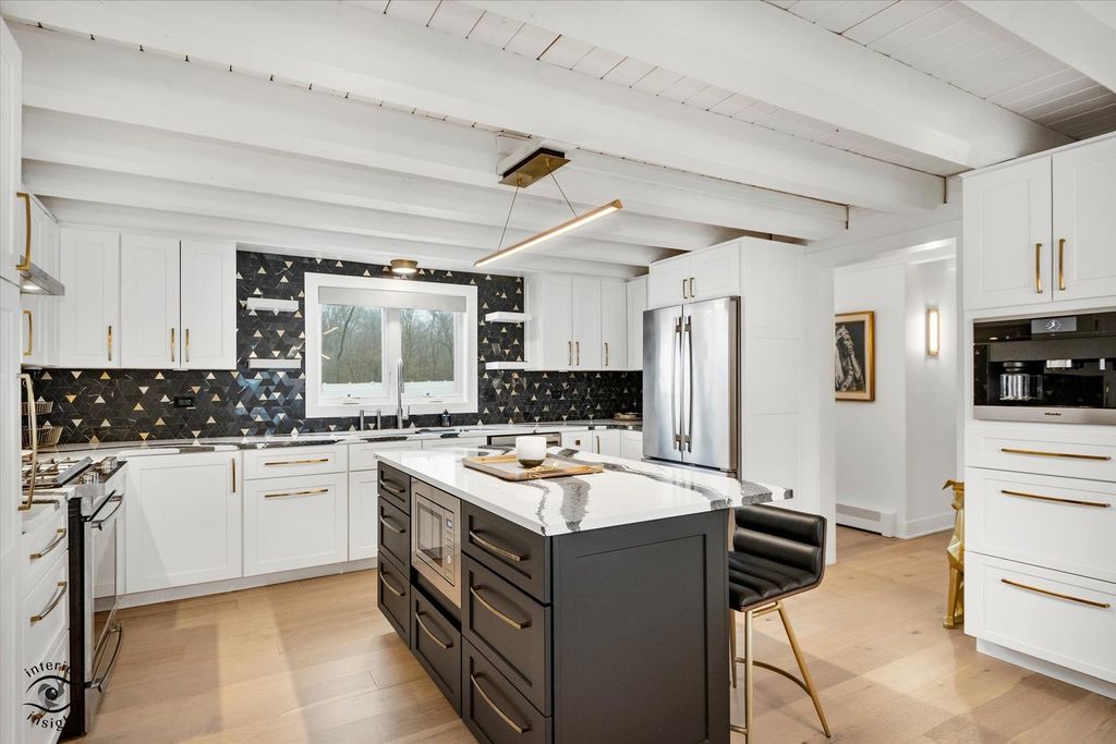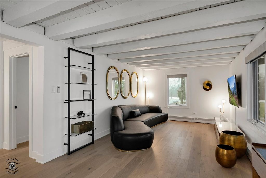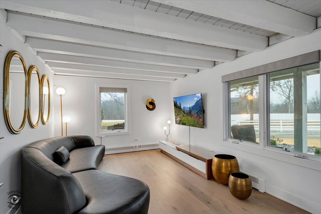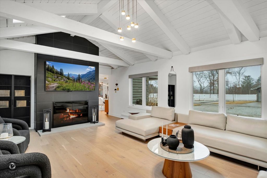 Your private estate awaits! Set behind a secure gate on 5 pristine acres, this fully renovated, move-in-ready log cabin home offers the perfect blend of luxury, privacy, and modern design. Renovated in 2022 for a family member and lightly lived in for less than one year, the home is in immaculate condition and includes like-new furnishings, Samsung smart TVs, intrusion system, sonos audio throughout exterior and pre-wired cameras. From the moment you arrive, the quality is evident with new professional landscaping, concrete walkways, and paver patios throughout the property. This exceptional estate features 4 bedrooms, 2.5 bathrooms, gorgeous light oak flooring throughout, a 40' x 24' pole barn, and a 2-car detached garage-both equipped with slatwall systems for optimal organization. The second floor offers three spacious bedrooms, including a stunning primary suite with a walk-in closet and a beautifully updated en-suite bathroom featuring a floating vanity, all-new fixtures, and a large walk-in shower. The additional bedrooms share a fully renovated bathroom with modern finishes. A new Mitsubishi mini-split system provides efficient cooling for the upper level. The main level is filled with natural light and offers a flexible 4th bedroom or office, a stylish powder room, and a welcoming living room. The show-stopping eat-in kitchen features quartz countertops, a designer backsplash, custom cabinetry, all-new JennAir and Whirlpool appliances, a built-in Miele coffee maker, oversized island with seating, and high-end lighting throughout. Just off the kitchen, the family room is anchored by a dramatic floor-to-ceiling Dekton fireplace. The adjacent sunroom, complete with heated floors, offers year-round enjoyment and overlooks the beautifully designed backyard. Step outside to a fully fenced yard featuring a large concrete patio, two additional seating areas, and a brick fire pit-perfect for entertaining. New concrete walkways connect the home to the pole barn and garage for added convenience. The finished basement with exterior access includes a spacious recreation room with polished concrete floors, custom built-in cabinetry, beverage bar with refrigerator and wine cooler, laundry room with plenty of cabinetry, and extensive storage with slatwall systems. Major updates completed in 2022 include the septic system, furnace and AC, roof, windows, bathrooms all brand new toilets, fixtures and flooring, electric window shades with remote control, water softener system, and all appliances-offering peace of mind for years to come. This exceptional, turnkey estate is truly a must-see.