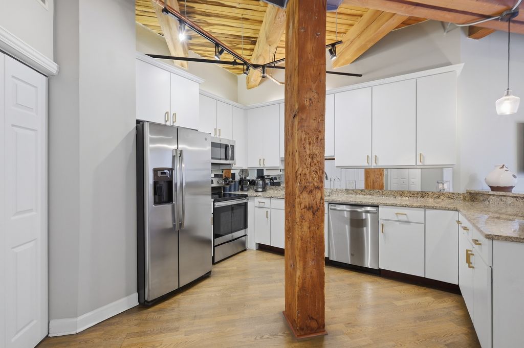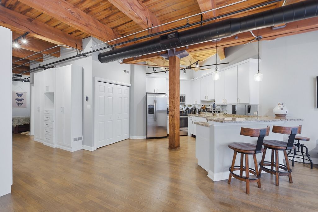 EXCEPTIONALLY UPDATED RIVER NORTH TIMBER LOFT - ONE OF THE BUILDING'S LARGEST RESIDENCES - THAT MARRIES AUTHENTIC INDUSTRIAL CHARACTER WITH HIGH-END, MODERN FINISHES. SOARING FLOOR-TO-CEILING WINDOWS AND EXPOSED TIMBER BEAMS FLOOD THE SPACE WITH LIGHT WHILE REFINISHED HARDWOODS, A RECENTLY UPDATED TILE SHOWER AND TILE BATHROOM FLOOR, AND REFINED DETAILS CREATE A SOPHISTICATED, MOVE-IN-READY HOME. AN AMANA HEAT PUMP WAS INSTALLED IN 2024 FOR RELIABLE, EFFICIENT CLIMATE CONTROL. THOUGHTFUL UPGRADES INCLUDE REFINISHED HARDWOOD FLOORS AND A FULL INTERIOR PAINT REFRESH (2017), STAINLESS-STEEL KITCHEN APPLIANCES (2019), EXPANDED AND UPDATED LIGHTING (2020), PAINTED KITCHEN CABINETRY, NEW CUSTOM CLOSET SYSTEM, UPDATED HARDWARE, AND NEW LAUNDRY AND CLOSET DOORS (ALL 2020). THE WELL-MANAGED BUILDING OFFERS A BEAUTIFULLY LANDSCAPED ROOFTOP DECK, ON-SITE MANAGEMENT, FITNESS AREA, RESIDENT LOUNGE, AND EXTRA STORAGE. IDEALLY LOCATED NEAR TRANSIT, SHOPPING, THE KENNEDY EXPRESSWAY, AND RIVER NORTH'S BEST RESTAURANTS.