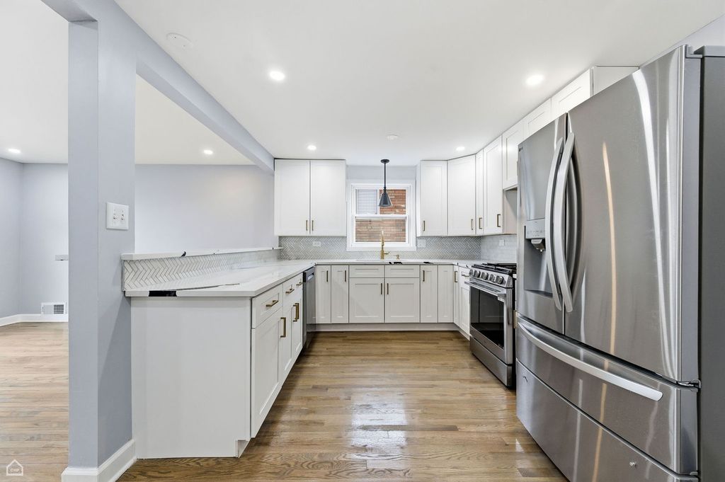From the moment you step inside, this home welcomes you with warmth, light, and an incredible sense of space. Thoughtfully updated and exceptionally spacious, it offers room to truly live, gather, and grow. The main level flows beautifully, anchored by a stunning kitchen featuring sprawling quartz countertops, gorgeous new cabinetry, and a generous eat-in breakfast bar that opens into a separate dining space. Whether you're hosting holidays or enjoying a quiet morning coffee, this layout simply works. The large living room invites you to relax and unwind, while beautifully refinished hardwood floors run throughout the entire home, adding warmth, character, and timeless style to every room. Brand-new stainless steel appliances and abundant storage make this kitchen as functional as it is beautiful. Upstairs, the second floor offers three oversized bedrooms with impressive closet space and a fully renovated spa-style bathroom with elegant tile work and calming finishes designed to feel like your own personal retreat. The third-floor addition is a true sanctuary. This expansive primary suite stretches the length of the home, offering a peaceful escape with a massive walk-in closet and a private ensuite bathroom featuring a jetted soaking tub, separate shower, and double vanity. It feels luxurious yet comfortable the perfect place to end your day. The finished basement adds even more flexibility with a spacious family room ideal for movie nights, play space, or entertaining. You'll also find a beautifully updated basement bathroom, along with two additional rooms for storage, hobbies, or organization giving you space for everything. Beyond the beauty, this home offers peace of mind. The furnace, air conditioner, and water heater are just two years old, along with a new sump pump. The addition roof is approximately seven years old, and the main house and garage roofs are approximately ten years old. Brand-new windows were installed throughout, and the basement has been fully rehabbed. This is more than just a house, it's a spacious, move-in-ready home designed for comfort, connection, and everyday ease.