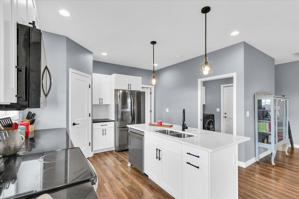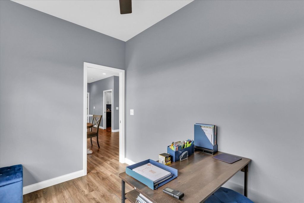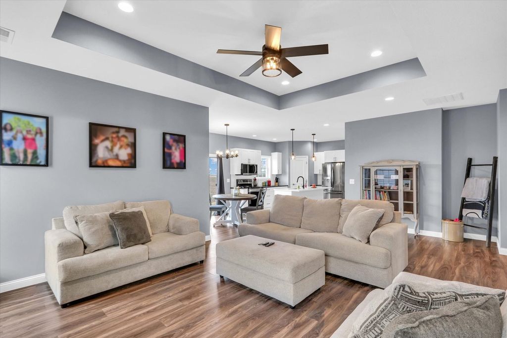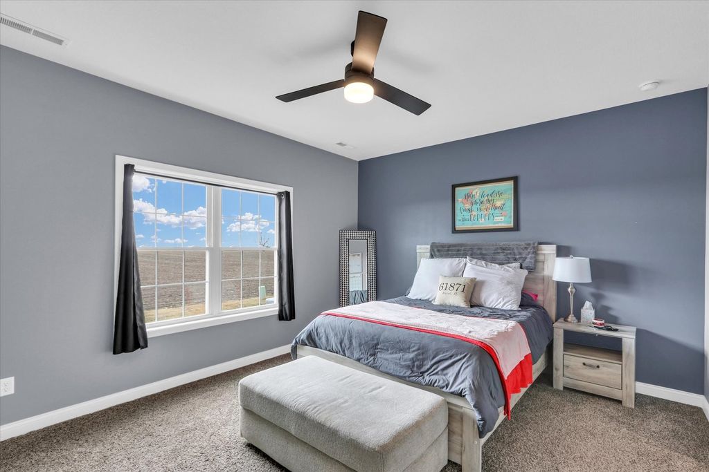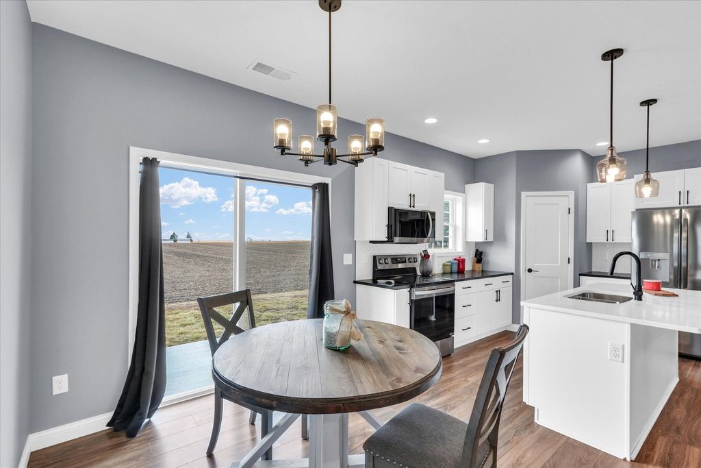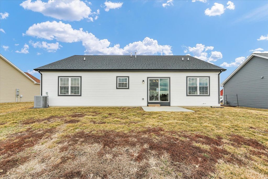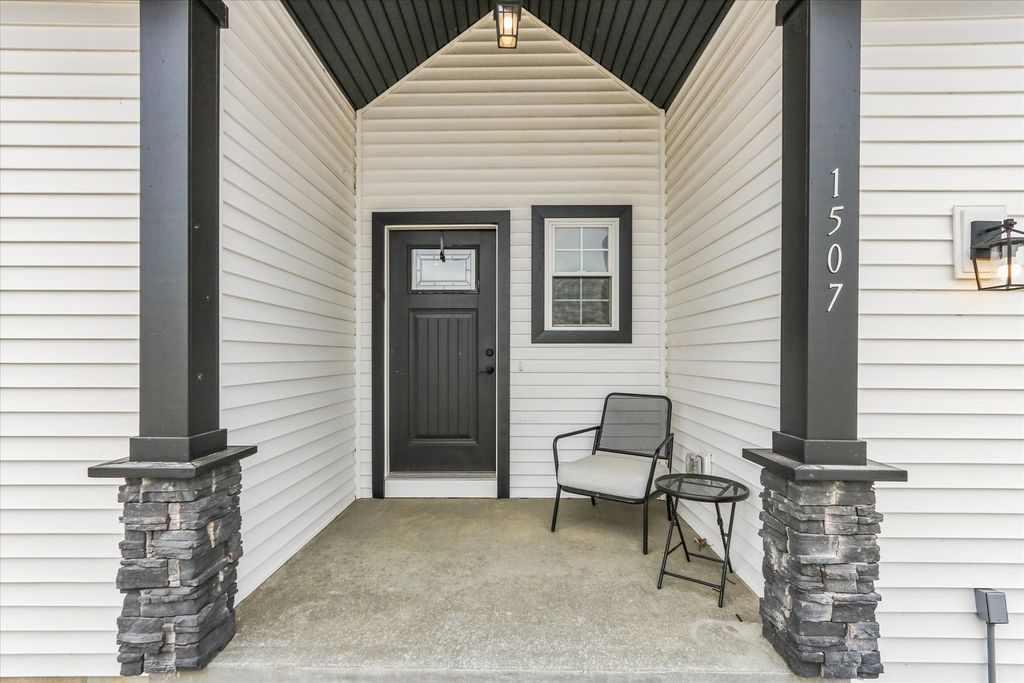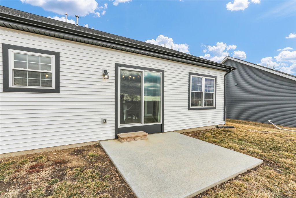 This beautiful ranch in the popular South Ridge subdivision checks so many boxes, starting with the open concept, large rooms, and upgraded features throughout. Immediately upon sight, you will notice the exterior of the home is a classy white and black with a front porch ready to welcome you. Entering through the front door, you will appreciate the landing area that opens up into the open concept living room, dining area, and kitchen. The living room boasts tall ceilings and a fireplace that are sure to make the home feel cozy. The kitchen is full of luxurious touches with granite countertops, a beautiful backsplash, center island, corner pantry, and stainless steel appliances. The primary suite includes a large bathroom with a double sink and a walk in closet. The second bedroom is across the house near the second full bathroom. Don't miss the extra room off the kitchen that would make a perfect office or nook, or the laundry/mudroom off the garage. The two car garage offers great storage space. The home backs up to a cornfield so the backyard offers private views. Conveniently located near dining, shopping, parks, and campus.