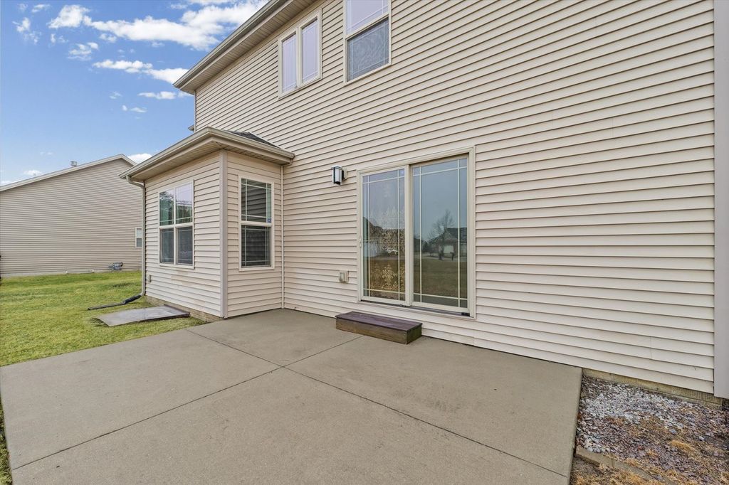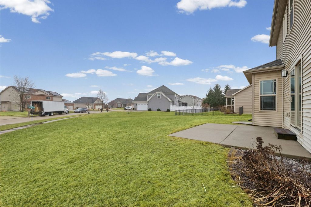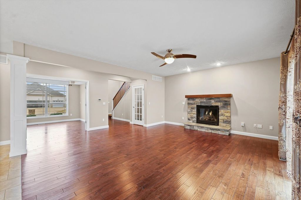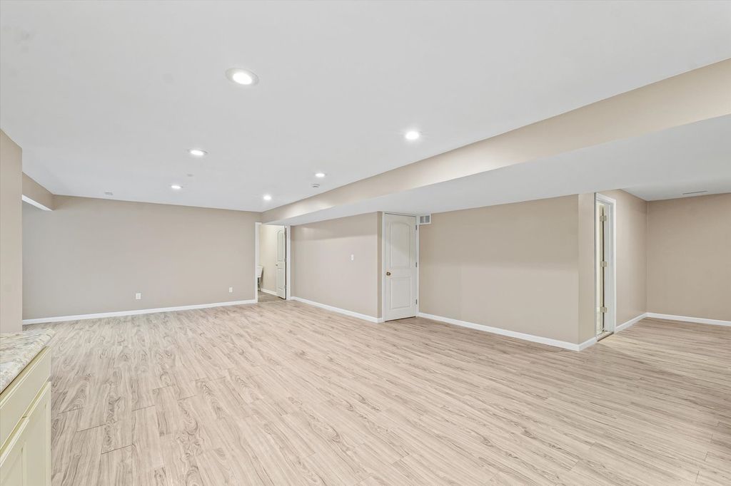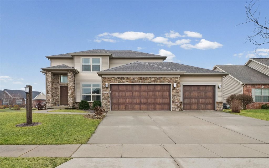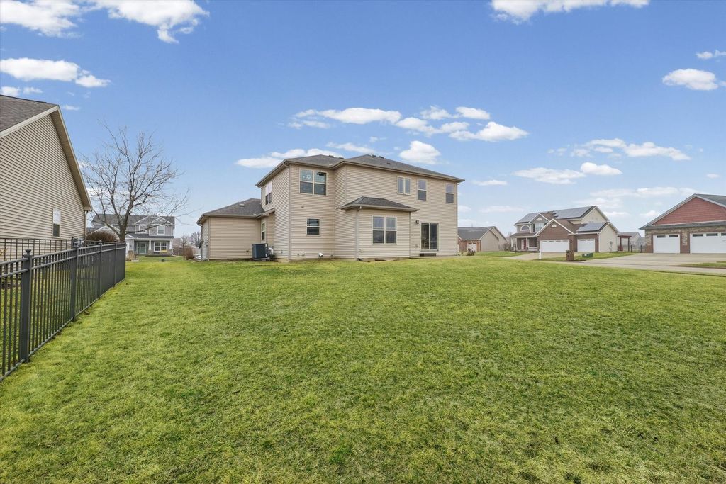 Positioned on a oversized corner lot in Liberty on the Lake Subdivision, this exceptional two-story residence blends refined comfort with modern convenience. Designed for both everyday living and effortless entertaining, the home features two full kitchens on the main level and basement-ideal for extended family living or hosting guests. Upstairs, four bedrooms showcase elegant engineered hardwood flooring, while both upper baths offer the indulgence of heated floors. The primary suite serves as a private retreat, complete with a spa-inspired soaking tub. Enhanced by a top-tier heating and cooling system, automated exterior lighting, and surround sound in both the living room and fully insulated, heated garage, this home delivers year-round comfort and sophistication. Freshly painted interiors and a newly installed main-level dishwasher complete the list of recent improvements.